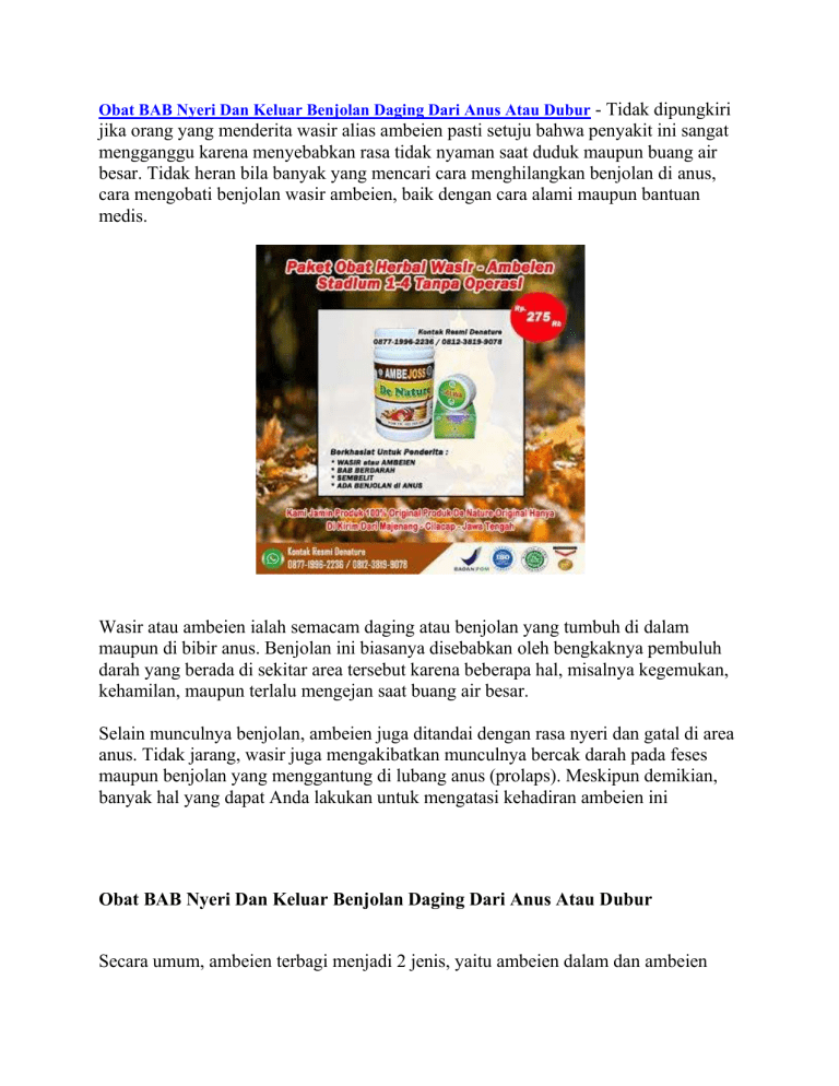 Obat BAB Nyeri Dan Keluar Benjolan Daging Dari Anus Atau Dubur - Tidak dipungkiri jika orang yang menderita wasir alias ambeien pasti setuju bahwa penyakit ini sangat mengganggu karena menyebabkan rasa tidak nyaman saat duduk maupun buang air besar. Tidak heran bila banyak yang mencari cara menghilangkan benjolan di anus, cara mengobati benjolan wasir ambeien, baik dengan cara alami maupun bantuan medis. Wasir atau ambeien ialah semacam daging atau benjolan yang tumbuh di dalam maupun di bibir anus. Benjolan ini biasanya disebabkan oleh bengkaknya pembuluh darah yang berada di sekitar area tersebut karena beberapa hal, misalnya kegemukan, kehamilan, maupun terlalu mengejan saat buang air besar. Selain munculnya benjolan, ambeien juga ditandai dengan rasa nyeri dan gatal di area anus. Tidak jarang, wasir juga mengakibatkan munculnya bercak darah pada feses maupun benjolan yang menggantung di lubang anus (prolaps). Meskipun demikian, banyak hal yang dapat Anda lakukan untuk mengatasi kehadiran ambeien ini Obat BAB Nyeri Dan Keluar Benjolan Daging Dari Anus Atau Dubur Secara umum, ambeien terbagi menjadi 2 jenis, yaitu ambeien dalam dan ambeien luar. Perbedaan yang utama dari kedua jenis ambeien tersebut adalah letak terbentuknya ambeien. Apa saja ciri-cirinya? Mari simak ulasan berikut. JENIS AMBEIEN DAN CIRI CIRINYA Ambeien terjadi ketika pembuluh darah di usus besar bagian akhir (rektum) dan dubur atau anus membengkak. Berdasarkan lokasi dan gejala yang ditimbulkan, ambeien terbagi menjadi 2 jenis, yaitu: Ambeien dalam (internal hemorrhoid) Disebut demikian karena pembengkakan yang terjadi berada di dalam anus, tepatnya di liang rektum. Ambeien internal jauh di dalam rektum dan tidak terlihat dari luar. Umumnya, ambeien dalam tidak menimbulkan keluhan sakit karena di liang rektum tidak banyak terdapat saraf. Seringkali, tanda pertama bahwa wasir internal hadir adalah pendarahan dubur. Gejala ambeien dalam yang lain adalah gatal dan nyeri pada anus. Gejala ini biasanya baru muncul ketika ambeien dalam menjadi semakin besar. Mengejan kadang-kadang dapat mendorong wasir internal sehingga menjorok melalui anus. Ini disebut ambeien yang menonjol atau prolaps dan bisa terasa sakit. Ambeien luar (external hemorrhoid) Pada jenis ambeien ini, lokasi pembengkakannya berada di luar rektum atau lebih tepatnya di sekitar lubang anus. Orang yang mengalami ambeien luar dapat mengeluhkan beberapa gejala, seperti: Rasa perih dan panas di sekitar anus. Gatal pada anus. Adanya benjolan atau pembengkakan di sekitar anus. BAB berdarah. Dari gejalanya, ambeien luar terasa lebih nyeri dan sering kali membuat penderitanya merasa tidak nyaman. Hal ini karena pembuluh darah yang mengalami pembengkakan berada di bawah kulit sekitar anus, di mana ada lebih banyak saraf di area tersebut. Obat BAB Nyeri Dan Keluar Benjolan Daging Dari Anus Atau Dubur CIRI CIRI AMBEIEN ATAU WASIR SECARA UMUM Secara umum, ciri-ciri yang sering dialami penderita adalah perdarahan saat sedang buang air besar. Perdarahan ini bisa berupa bercak darah pada feses atau tetesan darah yang mengalir dari dubur. Selain itu, ada beberapa ciri lain yang bisa dideteksi, di antaranya: 1. Rasa Mengganjal Saat Buang Air Besar Sering kali kita merasa ada sesuatu yang membuat proses buang air besar tertahan. Akibatnya kita akan mengejan dan berusaha mengeluarkan feses dari dubur. Dalam beberapa kasus, mengejan justru akan membuat pembuluh vena pecah dan menimbulkan benjolan (ambeien). Namun, apabila sejak awal penyebab BAB tertahan adalah benjolan tersebut, maka proses mengejan justru akan memperparah ambeien atau wasir yang sudah dimiliki. Jika dibiarkan lama kelamaan akan timbul perdarahan. 2. Rasa Tidak Nyaman pada Anus Selain perdarahan dan gatal, penderita ambeien atau wasir biasanya akan memiliki benjolan di lubang anus. Nah, benjolan inilah yang sering kali menimbulkan rasa tidak nyaman. Ketika merasa tidak nyaman, penderita akan mengalami kesulitan saat harus duduk atau jongkok dalam waktu yang lama. 3. Prolaps Prolaps merupakan keluarnya bagian ambeien atau wasir dari lubang anus. Muncul benjolan keluar dari anus setelah buang air besar. Benjolan dapat masuk sendiri atau harus didorong terlebih dahulu. Jadi, jika saat meraba bagian dubur, Anda mendapati daging yang menonjol berwarna merah muda (lebih terang) dari area sekitarnya dan terasa perih atau bahkan mengeluarkan darah, bisa dipastikan Anda menderita penyakit ambeien atau wasir. 4. Anemia Skunder Wajah pucat, tubuh mudah lemas dan sulit berkonsensentrasi. Gejala ini biasanya muncul bila telah terjadi komplikasi anemia akibat perdarahan yang berlebihan. Perdarahan pada dubur akibat ambeien tentu saja akan membuat penderita mengalami kukurangan darah. Hal ini sering kali menjadi pemicu penyakit lain, salah satunya anemia sekunder. Apabila hal ini yang Anda alami, bisa saja penyebabnya adalah ambeien atau wasir. 5. Infeksi di Daerah Dubur Luka pada ambeien akibat perdarahan akan membuat kuman mudah masuk ke dalam tubuh, hal ini akan menimbulkan infeksi. Jika anus terasa sakit dan perih setiap buang air besar, bisa jadi Anda memiliki ambeien atau wasir. Tingkatan Stadium Wasir Atau sakit Ambeien Wasir stadium 1 : Wasir jenis ini biasanya tidak sampai prolaps. Rasanya hanya kurang nyaman saat BAB. Ambeien stadium 2 : Bagian anus sudah bisa diraba ada benjolan, namun biasanya benjolan bisa masuk dengan sendirinya dan kadang ada rasa panas serta gatal. Wasir stadium 3 : Benjolan pada anus sudah besar dan susah masuk lagi harus dibantu dengan jari. Ambeien stadium 4 : Benjolan wasie sudah besar sekali dan sulit untuk dimasukan lagi meskipun dengan bantuan tangan, selain itu juga menjadi sering pendarahan. Cara menghilangkan benjolan ambeien dengan bantuan medis Dokter akan memprioritaskan penanganan tanpa operasi, namun bila wasir Anda sudah sangat parah atau amat mengganggu, bukan tidak mungkin Anda akan diminta menjalani prosedur pembedahan. Cara menghilangkan benjolan ambeien tanpa operasi ada
