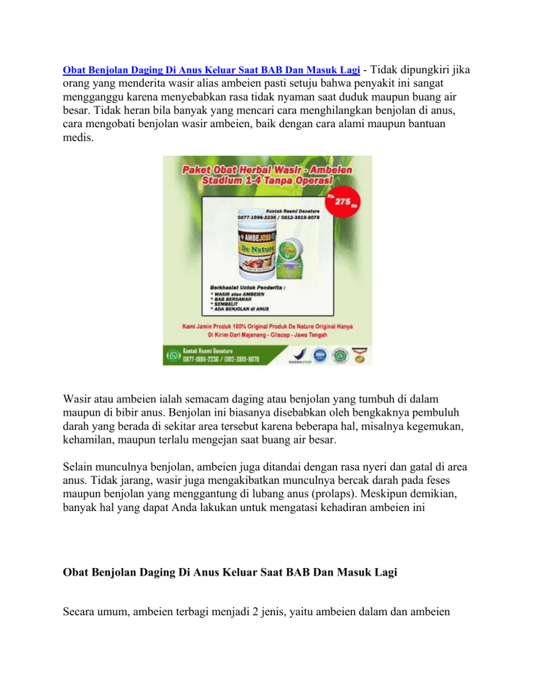 Obat Benjolan Daging Di Anus Keluar Saat BAB Dan Masuk Lagi - Tidak dipungkiri jika orang yang menderita wasir alias ambeien pasti setuju bahwa penyakit ini sangat mengganggu karena menyebabkan rasa tidak nyaman saat duduk maupun buang air besar. Tidak heran bila banyak yang mencari cara menghilangkan benjolan di anus, cara mengobati benjolan wasir ambeien, baik dengan cara alami maupun bantuan medis. Wasir atau ambeien ialah semacam daging atau benjolan yang tumbuh di dalam maupun di bibir anus. Benjolan ini biasanya disebabkan oleh bengkaknya pembuluh darah yang berada di sekitar area tersebut karena beberapa hal, misalnya kegemukan, kehamilan, maupun terlalu mengejan saat buang air besar. Selain munculnya benjolan, ambeien juga ditandai dengan rasa nyeri dan gatal di area anus. Tidak jarang, wasir juga mengakibatkan munculnya bercak darah pada feses maupun benjolan yang menggantung di lubang anus (prolaps). Meskipun demikian, banyak hal yang dapat Anda lakukan untuk mengatasi kehadiran ambeien ini Obat Benjolan Daging Di Anus Keluar Saat BAB Dan Masuk Lagi Secara umum, ambeien terbagi menjadi 2 jenis, yaitu ambeien dalam dan ambeien luar. Perbedaan yang utama dari kedua jenis ambeien tersebut adalah letak terbentuknya ambeien. Apa saja ciri-cirinya? Mari simak ulasan berikut. JENIS AMBEIEN DAN CIRI CIRINYA Ambeien terjadi ketika pembuluh darah di usus besar bagian akhir (rektum) dan dubur atau anus membengkak. Berdasarkan lokasi dan gejala yang ditimbulkan, ambeien terbagi menjadi 2 jenis, yaitu: Ambeien dalam (internal hemorrhoid) Disebut demikian karena pembengkakan yang terjadi berada di dalam anus, tepatnya di liang rektum. Ambeien internal jauh di dalam rektum dan tidak terlihat dari luar. Umumnya, ambeien dalam tidak menimbulkan keluhan sakit karena di liang rektum tidak banyak terdapat saraf. Seringkali, tanda pertama bahwa wasir internal hadir adalah pendarahan dubur. Gejala ambeien dalam yang lain adalah gatal dan nyeri pada anus. Gejala ini biasanya baru muncul ketika ambeien dalam menjadi semakin besar. Mengejan kadang-kadang dapat mendorong wasir internal sehingga menjorok melalui anus. Ini disebut ambeien yang menonjol atau prolaps dan bisa terasa sakit. Ambeien luar (external hemorrhoid) Pada jenis ambeien ini, lokasi pembengkakannya berada di luar rektum atau lebih tepatnya di sekitar lubang anus. Orang yang mengalami ambeien luar dapat mengeluhkan beberapa gejala, seperti: Rasa perih dan panas di sekitar anus. Gatal pada anus. Adanya benjolan atau pembengkakan di sekitar anus. BAB berdarah. Dari gejalanya, ambeien luar terasa lebih nyeri dan sering kali membuat penderitanya merasa tidak nyaman. Hal ini karena pembuluh darah yang mengalami pembengkakan berada di bawah kulit sekitar anus, di mana ada lebih banyak saraf di area tersebut. Obat Benjolan Daging Di Anus Keluar Saat BAB Dan Masuk Lagi CIRI CIRI AMBEIEN ATAU WASIR SECARA UMUM Secara umum, ciri-ciri yang sering dialami penderita adalah perdarahan saat sedang buang air besar. Perdarahan ini bisa berupa bercak darah pada feses atau tetesan darah yang mengalir dari dubur. Selain itu, ada beberapa ciri lain yang bisa dideteksi, di antaranya: 1. Rasa Mengganjal Saat Buang Air Besar Sering kali kita merasa ada sesuatu yang membuat proses buang air besar tertahan. Akibatnya kita akan mengejan dan berusaha mengeluarkan feses dari dubur. Dalam beberapa kasus, mengejan justru akan membuat pembuluh vena pecah dan menimbulkan benjolan (ambeien). Namun, apabila sejak awal penyebab BAB tertahan adalah benjolan tersebut, maka proses mengejan justru akan memperparah ambeien atau wasir yang sudah dimiliki. Jika dibiarkan lama kelamaan akan timbul perdarahan. 2. Rasa Tidak Nyaman pada Anus Selain perdarahan dan gatal, penderita ambeien atau wasir biasanya akan memiliki benjolan di lubang anus. Nah, benjolan inilah yang sering kali menimbulkan rasa tidak nyaman. Ketika merasa tidak nyaman, penderita akan mengalami kesulitan saat harus duduk atau jongkok dalam waktu yang lama. 3. Prolaps Prolaps merupakan keluarnya bagian ambeien atau wasir dari lubang anus. Muncul benjolan keluar dari anus setelah buang air besar. Benjolan dapat masuk sendiri atau harus didorong terlebih dahulu. Jadi, jika saat meraba bagian dubur, Anda mendapati daging yang menonjol berwarna merah muda (lebih terang) dari area sekitarnya dan terasa perih atau bahkan mengeluarkan darah, bisa dipastikan Anda menderita penyakit ambeien atau wasir. 4. Anemia Skunder Wajah pucat, tubuh mudah lemas dan sulit berkonsensentrasi. Gejala ini biasanya muncul bila telah terjadi komplikasi anemia akibat perdarahan yang berlebihan. Perdarahan pada dubur akibat ambeien tentu saja akan membuat penderita mengalami kukurangan darah. Hal ini sering kali menjadi pemicu penyakit lain, salah satunya anemia sekunder. Apabila hal ini yang Anda alami, bisa saja penyebabnya adalah ambeien atau wasir. 5. Infeksi di Daerah Dubur Luka pada ambeien akibat perdarahan akan membuat kuman mudah masuk ke dalam tubuh, hal ini akan menimbulkan infeksi. Jika anus terasa sakit dan perih setiap buang air besar, bisa jadi Anda memiliki ambeien atau wasir. Tingkatan Stadium Wasir Atau sakit Ambeien Wasir stadium 1 : Wasir jenis ini biasanya tidak sampai prolaps. Rasanya hanya kurang nyaman saat BAB. Ambeien stadium 2 : Bagian anus sudah bisa diraba ada benjolan, namun biasanya benjolan bisa masuk dengan sendirinya dan kadang ada rasa panas serta gatal. Wasir stadium 3 : Benjolan pada anus sudah besar dan susah masuk lagi harus dibantu dengan jari. Ambeien stadium 4 : Benjolan wasie sudah besar sekali dan sulit untuk dimasukan lagi meskipun dengan bantuan tangan, selain itu juga menjadi sering pendarahan. Cara menghilangkan benjolan ambeien dengan bantuan medis Dokter akan memprioritaskan penanganan tanpa operasi, namun bila wasir Anda sudah sangat parah atau amat mengganggu, bukan tidak mungkin Anda akan diminta menjalani prosedur pembedahan. Cara menghilangkan benjolan ambeien tanpa operasi adalah: Rubb