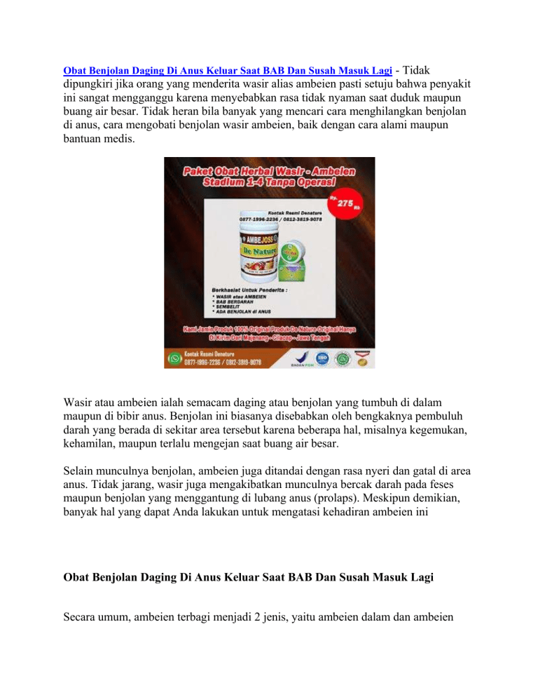 Obat Benjolan Daging Di Anus Keluar Saat BAB Dan Susah Masuk Lagi - Tidak dipungkiri jika orang yang menderita wasir alias ambeien pasti setuju bahwa penyakit ini sangat mengganggu karena menyebabkan rasa tidak nyaman saat duduk maupun buang air besar. Tidak heran bila banyak yang mencari cara menghilangkan benjolan di anus, cara mengobati benjolan wasir ambeien, baik dengan cara alami maupun bantuan medis. Wasir atau ambeien ialah semacam daging atau benjolan yang tumbuh di dalam maupun di bibir anus. Benjolan ini biasanya disebabkan oleh bengkaknya pembuluh darah yang berada di sekitar area tersebut karena beberapa hal, misalnya kegemukan, kehamilan, maupun terlalu mengejan saat buang air besar. Selain munculnya benjolan, ambeien juga ditandai dengan rasa nyeri dan gatal di area anus. Tidak jarang, wasir juga mengakibatkan munculnya bercak darah pada feses maupun benjolan yang menggantung di lubang anus (prolaps). Meskipun demikian, banyak hal yang dapat Anda lakukan untuk mengatasi kehadiran ambeien ini Obat Benjolan Daging Di Anus Keluar Saat BAB Dan Susah Masuk Lagi Secara umum, ambeien terbagi menjadi 2 jenis, yaitu ambeien dalam dan ambeien luar. Perbedaan yang utama dari kedua jenis ambeien tersebut adalah letak terbentuknya ambeien. Apa saja ciri-cirinya? Mari simak ulasan berikut. JENIS AMBEIEN DAN CIRI CIRINYA Ambeien terjadi ketika pembuluh darah di usus besar bagian akhir (rektum) dan dubur atau anus membengkak. Berdasarkan lokasi dan gejala yang ditimbulkan, ambeien terbagi menjadi 2 jenis, yaitu: Ambeien dalam (internal hemorrhoid) Disebut demikian karena pembengkakan yang terjadi berada di dalam anus, tepatnya di liang rektum. Ambeien internal jauh di dalam rektum dan tidak terlihat dari luar. Umumnya, ambeien dalam tidak menimbulkan keluhan sakit karena di liang rektum tidak banyak terdapat saraf. Seringkali, tanda pertama bahwa wasir internal hadir adalah pendarahan dubur. Gejala ambeien dalam yang lain adalah gatal dan nyeri pada anus. Gejala ini biasanya baru muncul ketika ambeien dalam menjadi semakin besar. Mengejan kadang-kadang dapat mendorong wasir internal sehingga menjorok melalui anus. Ini disebut ambeien yang menonjol atau prolaps dan bisa terasa sakit. Ambeien luar (external hemorrhoid) Pada jenis ambeien ini, lokasi pembengkakannya berada di luar rektum atau lebih tepatnya di sekitar lubang anus. Orang yang mengalami ambeien luar dapat mengeluhkan beberapa gejala, seperti: Rasa perih dan panas di sekitar anus. Gatal pada anus. Adanya benjolan atau pembengkakan di sekitar anus. BAB berdarah. Dari gejalanya, ambeien luar terasa lebih nyeri dan sering kali membuat penderitanya merasa tidak nyaman. Hal ini karena pembuluh darah yang mengalami pembengkakan berada di bawah kulit sekitar anus, di mana ada lebih banyak saraf di area tersebut. Obat Benjolan Daging Di Anus Keluar Saat BAB Dan Susah Masuk Lagi CIRI CIRI AMBEIEN ATAU WASIR SECARA UMUM Secara umum, ciri-ciri yang sering dialami penderita adalah perdarahan saat sedang buang air besar. Perdarahan ini bisa berupa bercak darah pada feses atau tetesan darah yang mengalir dari dubur. Selain itu, ada beberapa ciri lain yang bisa dideteksi, di antaranya: 1. Rasa Mengganjal Saat Buang Air Besar Sering kali kita merasa ada sesuatu yang membuat proses buang air besar tertahan. Akibatnya kita akan mengejan dan berusaha mengeluarkan feses dari dubur. Dalam beberapa kasus, mengejan justru akan membuat pembuluh vena pecah dan menimbulkan benjolan (ambeien). Namun, apabila sejak awal penyebab BAB tertahan adalah benjolan tersebut, maka proses mengejan justru akan memperparah ambeien atau wasir yang sudah dimiliki. Jika dibiarkan lama kelamaan akan timbul perdarahan. 2. Rasa Tidak Nyaman pada Anus Selain perdarahan dan gatal, penderita ambeien atau wasir biasanya akan memiliki benjolan di lubang anus. Nah, benjolan inilah yang sering kali menimbulkan rasa tidak nyaman. Ketika merasa tidak nyaman, penderita akan mengalami kesulitan saat harus duduk atau jongkok dalam waktu yang lama. 3. Prolaps Prolaps merupakan keluarnya bagian ambeien atau wasir dari lubang anus. Muncul benjolan keluar dari anus setelah buang air besar. Benjolan dapat masuk sendiri atau harus didorong terlebih dahulu. Jadi, jika saat meraba bagian dubur, Anda mendapati daging yang menonjol berwarna merah muda (lebih terang) dari area sekitarnya dan terasa perih atau bahkan mengeluarkan darah, bisa dipastikan Anda menderita penyakit ambeien atau wasir. 4. Anemia Skunder Wajah pucat, tubuh mudah lemas dan sulit berkonsensentrasi. Gejala ini biasanya muncul bila telah terjadi komplikasi anemia akibat perdarahan yang berlebihan. Perdarahan pada dubur akibat ambeien tentu saja akan membuat penderita mengalami kukurangan darah. Hal ini sering kali menjadi pemicu penyakit lain, salah satunya anemia sekunder. Apabila hal ini yang Anda alami, bisa saja penyebabnya adalah ambeien atau wasir. 5. Infeksi di Daerah Dubur Luka pada ambeien akibat perdarahan akan membuat kuman mudah masuk ke dalam tubuh, hal ini akan menimbulkan infeksi. Jika anus terasa sakit dan perih setiap buang air besar, bisa jadi Anda memiliki ambeien atau wasir. Tingkatan Stadium Wasir Atau sakit Ambeien Wasir stadium 1 : Wasir jenis ini biasanya tidak sampai prolaps. Rasanya hanya kurang nyaman saat BAB. Ambeien stadium 2 : Bagian anus sudah bisa diraba ada benjolan, namun biasanya benjolan bisa masuk dengan sendirinya dan kadang ada rasa panas serta gatal. Wasir stadium 3 : Benjolan pada anus sudah besar dan susah masuk lagi harus dibantu dengan jari. Ambeien stadium 4 : Benjolan wasie sudah besar sekali dan sulit untuk dimasukan lagi meskipun dengan bantuan tangan, selain itu juga menjadi sering pendarahan. Cara menghilangkan benjolan ambeien dengan bantuan medis Dokter akan memprioritaskan penanganan tanpa operasi, namun bila wasir Anda sudah sangat parah atau amat mengganggu, bukan tidak mungkin Anda akan diminta menjalani prosedur pembedahan. Cara menghilangkan benjolan ambeien tanpa op