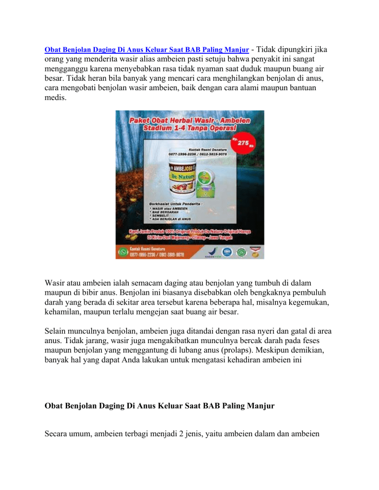 Obat Benjolan Daging Di Anus Keluar Saat BAB Paling Manjur - Tidak dipungkiri jika orang yang menderita wasir alias ambeien pasti setuju bahwa penyakit ini sangat mengganggu karena menyebabkan rasa tidak nyaman saat duduk maupun buang air besar. Tidak heran bila banyak yang mencari cara menghilangkan benjolan di anus, cara mengobati benjolan wasir ambeien, baik dengan cara alami maupun bantuan medis. Wasir atau ambeien ialah semacam daging atau benjolan yang tumbuh di dalam maupun di bibir anus. Benjolan ini biasanya disebabkan oleh bengkaknya pembuluh darah yang berada di sekitar area tersebut karena beberapa hal, misalnya kegemukan, kehamilan, maupun terlalu mengejan saat buang air besar. Selain munculnya benjolan, ambeien juga ditandai dengan rasa nyeri dan gatal di area anus. Tidak jarang, wasir juga mengakibatkan munculnya bercak darah pada feses maupun benjolan yang menggantung di lubang anus (prolaps). Meskipun demikian, banyak hal yang dapat Anda lakukan untuk mengatasi kehadiran ambeien ini Obat Benjolan Daging Di Anus Keluar Saat BAB Paling Manjur Secara umum, ambeien terbagi menjadi 2 jenis, yaitu ambeien dalam dan ambeien luar. Perbedaan yang utama dari kedua jenis ambeien tersebut adalah letak terbentuknya ambeien. Apa saja ciri-cirinya? Mari simak ulasan berikut. JENIS AMBEIEN DAN CIRI CIRINYA Ambeien terjadi ketika pembuluh darah di usus besar bagian akhir (rektum) dan dubur atau anus membengkak. Berdasarkan lokasi dan gejala yang ditimbulkan, ambeien terbagi menjadi 2 jenis, yaitu: Ambeien dalam (internal hemorrhoid) Disebut demikian karena pembengkakan yang terjadi berada di dalam anus, tepatnya di liang rektum. Ambeien internal jauh di dalam rektum dan tidak terlihat dari luar. Umumnya, ambeien dalam tidak menimbulkan keluhan sakit karena di liang rektum tidak banyak terdapat saraf. Seringkali, tanda pertama bahwa wasir internal hadir adalah pendarahan dubur. Gejala ambeien dalam yang lain adalah gatal dan nyeri pada anus. Gejala ini biasanya baru muncul ketika ambeien dalam menjadi semakin besar. Mengejan kadang-kadang dapat mendorong wasir internal sehingga menjorok melalui anus. Ini disebut ambeien yang menonjol atau prolaps dan bisa terasa sakit. Ambeien luar (external hemorrhoid) Pada jenis ambeien ini, lokasi pembengkakannya berada di luar rektum atau lebih tepatnya di sekitar lubang anus. Orang yang mengalami ambeien luar dapat mengeluhkan beberapa gejala, seperti: Rasa perih dan panas di sekitar anus. Gatal pada anus. Adanya benjolan atau pembengkakan di sekitar anus. BAB berdarah. Dari gejalanya, ambeien luar terasa lebih nyeri dan sering kali membuat penderitanya merasa tidak nyaman. Hal ini karena pembuluh darah yang mengalami pembengkakan berada di bawah kulit sekitar anus, di mana ada lebih banyak saraf di area tersebut. Obat Benjolan Daging Di Anus Keluar Saat BAB Paling Manjur CIRI CIRI AMBEIEN ATAU WASIR SECARA UMUM Secara umum, ciri-ciri yang sering dialami penderita adalah perdarahan saat sedang buang air besar. Perdarahan ini bisa berupa bercak darah pada feses atau tetesan darah yang mengalir dari dubur. Selain itu, ada beberapa ciri lain yang bisa dideteksi, di antaranya: 1. Rasa Mengganjal Saat Buang Air Besar Sering kali kita merasa ada sesuatu yang membuat proses buang air besar tertahan. Akibatnya kita akan mengejan dan berusaha mengeluarkan feses dari dubur. Dalam beberapa kasus, mengejan justru akan membuat pembuluh vena pecah dan menimbulkan benjolan (ambeien). Namun, apabila sejak awal penyebab BAB tertahan adalah benjolan tersebut, maka proses mengejan justru akan memperparah ambeien atau wasir yang sudah dimiliki. Jika dibiarkan lama kelamaan akan timbul perdarahan. 2. Rasa Tidak Nyaman pada Anus Selain perdarahan dan gatal, penderita ambeien atau wasir biasanya akan memiliki benjolan di lubang anus. Nah, benjolan inilah yang sering kali menimbulkan rasa tidak nyaman. Ketika merasa tidak nyaman, penderita akan mengalami kesulitan saat harus duduk atau jongkok dalam waktu yang lama. 3. Prolaps Prolaps merupakan keluarnya bagian ambeien atau wasir dari lubang anus. Muncul benjolan keluar dari anus setelah buang air besar. Benjolan dapat masuk sendiri atau harus didorong terlebih dahulu. Jadi, jika saat meraba bagian dubur, Anda mendapati daging yang menonjol berwarna merah muda (lebih terang) dari area sekitarnya dan terasa perih atau bahkan mengeluarkan darah, bisa dipastikan Anda menderita penyakit ambeien atau wasir. 4. Anemia Skunder Wajah pucat, tubuh mudah lemas dan sulit berkonsensentrasi. Gejala ini biasanya muncul bila telah terjadi komplikasi anemia akibat perdarahan yang berlebihan. Perdarahan pada dubur akibat ambeien tentu saja akan membuat penderita mengalami kukurangan darah. Hal ini sering kali menjadi pemicu penyakit lain, salah satunya anemia sekunder. Apabila hal ini yang Anda alami, bisa saja penyebabnya adalah ambeien atau wasir. 5. Infeksi di Daerah Dubur Luka pada ambeien akibat perdarahan akan membuat kuman mudah masuk ke dalam tubuh, hal ini akan menimbulkan infeksi. Jika anus terasa sakit dan perih setiap buang air besar, bisa jadi Anda memiliki ambeien atau wasir. Tingkatan Stadium Wasir Atau sakit Ambeien Wasir stadium 1 : Wasir jenis ini biasanya tidak sampai prolaps. Rasanya hanya kurang nyaman saat BAB. Ambeien stadium 2 : Bagian anus sudah bisa diraba ada benjolan, namun biasanya benjolan bisa masuk dengan sendirinya dan kadang ada rasa panas serta gatal. Wasir stadium 3 : Benjolan pada anus sudah besar dan susah masuk lagi harus dibantu dengan jari. Ambeien stadium 4 : Benjolan wasie sudah besar sekali dan sulit untuk dimasukan lagi meskipun dengan bantuan tangan, selain itu juga menjadi sering pendarahan. Cara menghilangkan benjolan ambeien dengan bantuan medis Dokter akan memprioritaskan penanganan tanpa operasi, namun bila wasir Anda sudah sangat parah atau amat mengganggu, bukan tidak mungkin Anda akan diminta menjalani prosedur pembedahan. Cara menghilangkan benjolan ambeien tanpa operasi adalah: Rubber 