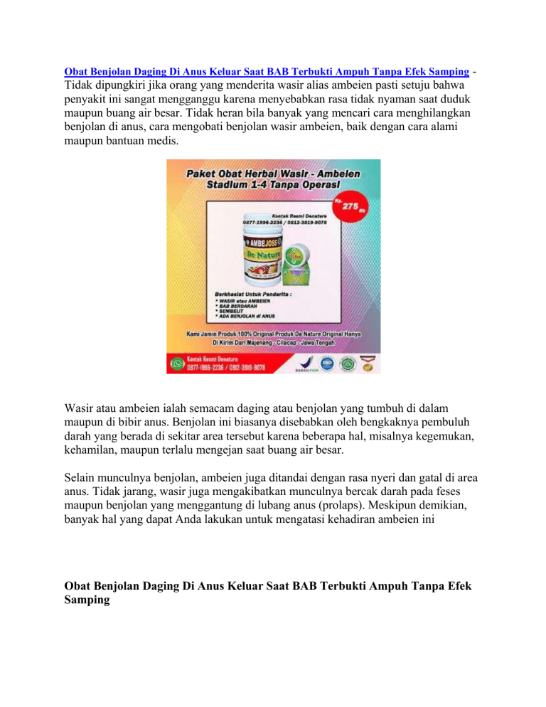 Obat Benjolan Daging Di Anus Keluar Saat BAB Terbukti Ampuh Tanpa Efek Samping - Tidak dipungkiri jika orang yang menderita wasir alias ambeien pasti setuju bahwa penyakit ini sangat mengganggu karena menyebabkan rasa tidak nyaman saat duduk maupun buang air besar. Tidak heran bila banyak yang mencari cara menghilangkan benjolan di anus, cara mengobati benjolan wasir ambeien, baik dengan cara alami maupun bantuan medis. Wasir atau ambeien ialah semacam daging atau benjolan yang tumbuh di dalam maupun di bibir anus. Benjolan ini biasanya disebabkan oleh bengkaknya pembuluh darah yang berada di sekitar area tersebut karena beberapa hal, misalnya kegemukan, kehamilan, maupun terlalu mengejan saat buang air besar. Selain munculnya benjolan, ambeien juga ditandai dengan rasa nyeri dan gatal di area anus. Tidak jarang, wasir juga mengakibatkan munculnya bercak darah pada feses maupun benjolan yang menggantung di lubang anus (prolaps). Meskipun demikian, banyak hal yang dapat Anda lakukan untuk mengatasi kehadiran ambeien ini Obat Benjolan Daging Di Anus Keluar Saat BAB Terbukti Ampuh Tanpa Efek Samping Secara umum, ambeien terbagi menjadi 2 jenis, yaitu ambeien dalam dan ambeien luar. Perbedaan yang utama dari kedua jenis ambeien tersebut adalah letak terbentuknya ambeien. Apa saja ciri-cirinya? Mari simak ulasan berikut. JENIS AMBEIEN DAN CIRI CIRINYA Ambeien terjadi ketika pembuluh darah di usus besar bagian akhir (rektum) dan dubur atau anus membengkak. Berdasarkan lokasi dan gejala yang ditimbulkan, ambeien terbagi menjadi 2 jenis, yaitu: Ambeien dalam (internal hemorrhoid) Disebut demikian karena pembengkakan yang terjadi berada di dalam anus, tepatnya di liang rektum. Ambeien internal jauh di dalam rektum dan tidak terlihat dari luar. Umumnya, ambeien dalam tidak menimbulkan keluhan sakit karena di liang rektum tidak banyak terdapat saraf. Seringkali, tanda pertama bahwa wasir internal hadir adalah pendarahan dubur. Gejala ambeien dalam yang lain adalah gatal dan nyeri pada anus. Gejala ini biasanya baru muncul ketika ambeien dalam menjadi semakin besar. Mengejan kadang-kadang dapat mendorong wasir internal sehingga menjorok melalui anus. Ini disebut ambeien yang menonjol atau prolaps dan bisa terasa sakit. Ambeien luar (external hemorrhoid) Pada jenis ambeien ini, lokasi pembengkakannya berada di luar rektum atau lebih tepatnya di sekitar lubang anus. Orang yang mengalami ambeien luar dapat mengeluhkan beberapa gejala, seperti: Rasa perih dan panas di sekitar anus. Gatal pada anus. Adanya benjolan atau pembengkakan di sekitar anus. BAB berdarah. Dari gejalanya, ambeien luar terasa lebih nyeri dan sering kali membuat penderitanya merasa tidak nyaman. Hal ini karena pembuluh darah yang mengalami pembengkakan berada di bawah kulit sekitar anus, di mana ada lebih banyak saraf di area tersebut. Obat Benjolan Daging Di Anus Keluar Saat BAB Terbukti Ampuh Tanpa Efek Samping CIRI CIRI AMBEIEN ATAU WASIR SECARA UMUM Secara umum, ciri-ciri yang sering dialami penderita adalah perdarahan saat sedang buang air besar. Perdarahan ini bisa berupa bercak darah pada feses atau tetesan darah yang mengalir dari dubur. Selain itu, ada beberapa ciri lain yang bisa dideteksi, di antaranya: 1. Rasa Mengganjal Saat Buang Air Besar Sering kali kita merasa ada sesuatu yang membuat proses buang air besar tertahan. Akibatnya kita akan mengejan dan berusaha mengeluarkan feses dari dubur. Dalam beberapa kasus, mengejan justru akan membuat pembuluh vena pecah dan menimbulkan benjolan (ambeien). Namun, apabila sejak awal penyebab BAB tertahan adalah benjolan tersebut, maka proses mengejan justru akan memperparah ambeien atau wasir yang sudah dimiliki. Jika dibiarkan lama kelamaan akan timbul perdarahan. 2. Rasa Tidak Nyaman pada Anus Selain perdarahan dan gatal, penderita ambeien atau wasir biasanya akan memiliki benjolan di lubang anus. Nah, benjolan inilah yang sering kali menimbulkan rasa tidak nyaman. Ketika merasa tidak nyaman, penderita akan mengalami kesulitan saat harus duduk atau jongkok dalam waktu yang lama. 3. Prolaps Prolaps merupakan keluarnya bagian ambeien atau wasir dari lubang anus. Muncul benjolan keluar dari anus setelah buang air besar. Benjolan dapat masuk sendiri atau harus didorong terlebih dahulu. Jadi, jika saat meraba bagian dubur, Anda mendapati daging yang menonjol berwarna merah muda (lebih terang) dari area sekitarnya dan terasa perih atau bahkan mengeluarkan darah, bisa dipastikan Anda menderita penyakit ambeien atau wasir. 4. Anemia Skunder Wajah pucat, tubuh mudah lemas dan sulit berkonsensentrasi. Gejala ini biasanya muncul bila telah terjadi komplikasi anemia akibat perdarahan yang berlebihan. Perdarahan pada dubur akibat ambeien tentu saja akan membuat penderita mengalami kukurangan darah. Hal ini sering kali menjadi pemicu penyakit lain, salah satunya anemia sekunder. Apabila hal ini yang Anda alami, bisa saja penyebabnya adalah ambeien atau wasir. 5. Infeksi di Daerah Dubur Luka pada ambeien akibat perdarahan akan membuat kuman mudah masuk ke dalam tubuh, hal ini akan menimbulkan infeksi. Jika anus terasa sakit dan perih setiap buang air besar, bisa jadi Anda memiliki ambeien atau wasir. Tingkatan Stadium Wasir Atau sakit Ambeien Wasir stadium 1 : Wasir jenis ini biasanya tidak sampai prolaps. Rasanya hanya kurang nyaman saat BAB. Ambeien stadium 2 : Bagian anus sudah bisa diraba ada benjolan, namun biasanya benjolan bisa masuk dengan sendirinya dan kadang ada rasa panas serta gatal. Wasir stadium 3 : Benjolan pada anus sudah besar dan susah masuk lagi harus dibantu dengan jari. Ambeien stadium 4 : Benjolan wasie sudah besar sekali dan sulit untuk dimasukan lagi meskipun dengan bantuan tangan, selain itu juga menjadi sering pendarahan. Cara menghilangkan benjolan ambeien dengan bantuan medis Dokter akan memprioritaskan penanganan tanpa operasi, namun bila wasir Anda sudah sangat parah atau amat mengganggu, bukan tidak mungkin Anda akan diminta menjalani prosedur pembedahan. Cara 