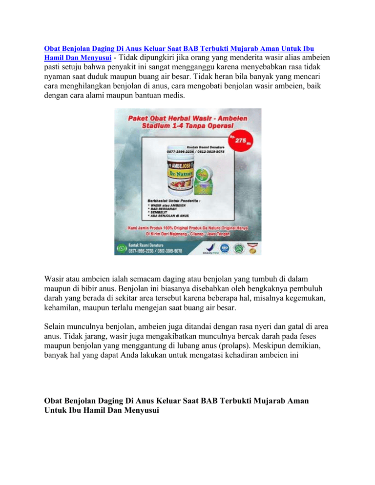 Obat Benjolan Daging Di Anus Keluar Saat BAB Terbukti Mujarab Aman Untuk Ibu Hamil Dan Menyusui - Tidak dipungkiri jika orang yang menderita wasir alias ambeien pasti setuju bahwa penyakit ini sangat mengganggu karena menyebabkan rasa tidak nyaman saat duduk maupun buang air besar. Tidak heran bila banyak yang mencari cara menghilangkan benjolan di anus, cara mengobati benjolan wasir ambeien, baik dengan cara alami maupun bantuan medis. Wasir atau ambeien ialah semacam daging atau benjolan yang tumbuh di dalam maupun di bibir anus. Benjolan ini biasanya disebabkan oleh bengkaknya pembuluh darah yang berada di sekitar area tersebut karena beberapa hal, misalnya kegemukan, kehamilan, maupun terlalu mengejan saat buang air besar. Selain munculnya benjolan, ambeien juga ditandai dengan rasa nyeri dan gatal di area anus. Tidak jarang, wasir juga mengakibatkan munculnya bercak darah pada feses maupun benjolan yang menggantung di lubang anus (prolaps). Meskipun demikian, banyak hal yang dapat Anda lakukan untuk mengatasi kehadiran ambeien ini Obat Benjolan Daging Di Anus Keluar Saat BAB Terbukti Mujarab Aman Untuk Ibu Hamil Dan Menyusui Secara umum, ambeien terbagi menjadi 2 jenis, yaitu ambeien dalam dan ambeien luar. Perbedaan yang utama dari kedua jenis ambeien tersebut adalah letak terbentuknya ambeien. Apa saja ciri-cirinya? Mari simak ulasan berikut. JENIS AMBEIEN DAN CIRI CIRINYA Ambeien terjadi ketika pembuluh darah di usus besar bagian akhir (rektum) dan dubur atau anus membengkak. Berdasarkan lokasi dan gejala yang ditimbulkan, ambeien terbagi menjadi 2 jenis, yaitu: Ambeien dalam (internal hemorrhoid) Disebut demikian karena pembengkakan yang terjadi berada di dalam anus, tepatnya di liang rektum. Ambeien internal jauh di dalam rektum dan tidak terlihat dari luar. Umumnya, ambeien dalam tidak menimbulkan keluhan sakit karena di liang rektum tidak banyak terdapat saraf. Seringkali, tanda pertama bahwa wasir internal hadir adalah pendarahan dubur. Gejala ambeien dalam yang lain adalah gatal dan nyeri pada anus. Gejala ini biasanya baru muncul ketika ambeien dalam menjadi semakin besar. Mengejan kadang-kadang dapat mendorong wasir internal sehingga menjorok melalui anus. Ini disebut ambeien yang menonjol atau prolaps dan bisa terasa sakit. Ambeien luar (external hemorrhoid) Pada jenis ambeien ini, lokasi pembengkakannya berada di luar rektum atau lebih tepatnya di sekitar lubang anus. Orang yang mengalami ambeien luar dapat mengeluhkan beberapa gejala, seperti: Rasa perih dan panas di sekitar anus. Gatal pada anus. Adanya benjolan atau pembengkakan di sekitar anus. BAB berdarah. Dari gejalanya, ambeien luar terasa lebih nyeri dan sering kali membuat penderitanya merasa tidak nyaman. Hal ini karena pembuluh darah yang mengalami pembengkakan berada di bawah kulit sekitar anus, di mana ada lebih banyak saraf di area tersebut. Obat Benjolan Daging Di Anus Keluar Saat BAB Terbukti Mujarab Aman Untuk Ibu Hamil Dan Menyusui CIRI CIRI AMBEIEN ATAU WASIR SECARA UMUM Secara umum, ciri-ciri yang sering dialami penderita adalah perdarahan saat sedang buang air besar. Perdarahan ini bisa berupa bercak darah pada feses atau tetesan darah yang mengalir dari dubur. Selain itu, ada beberapa ciri lain yang bisa dideteksi, di antaranya: 1. Rasa Mengganjal Saat Buang Air Besar Sering kali kita merasa ada sesuatu yang membuat proses buang air besar tertahan. Akibatnya kita akan mengejan dan berusaha mengeluarkan feses dari dubur. Dalam beberapa kasus, mengejan justru akan membuat pembuluh vena pecah dan menimbulkan benjolan (ambeien). Namun, apabila sejak awal penyebab BAB tertahan adalah benjolan tersebut, maka proses mengejan justru akan memperparah ambeien atau wasir yang sudah dimiliki. Jika dibiarkan lama kelamaan akan timbul perdarahan. 2. Rasa Tidak Nyaman pada Anus Selain perdarahan dan gatal, penderita ambeien atau wasir biasanya akan memiliki benjolan di lubang anus. Nah, benjolan inilah yang sering kali menimbulkan rasa tidak nyaman. Ketika merasa tidak nyaman, penderita akan mengalami kesulitan saat harus duduk atau jongkok dalam waktu yang lama. 3. Prolaps Prolaps merupakan keluarnya bagian ambeien atau wasir dari lubang anus. Muncul benjolan keluar dari anus setelah buang air besar. Benjolan dapat masuk sendiri atau harus didorong terlebih dahulu. Jadi, jika saat meraba bagian dubur, Anda mendapati daging yang menonjol berwarna merah muda (lebih terang) dari area sekitarnya dan terasa perih atau bahkan mengeluarkan darah, bisa dipastikan Anda menderita penyakit ambeien atau wasir. 4. Anemia Skunder Wajah pucat, tubuh mudah lemas dan sulit berkonsensentrasi. Gejala ini biasanya muncul bila telah terjadi komplikasi anemia akibat perdarahan yang berlebihan. Perdarahan pada dubur akibat ambeien tentu saja akan membuat penderita mengalami kukurangan darah. Hal ini sering kali menjadi pemicu penyakit lain, salah satunya anemia sekunder. Apabila hal ini yang Anda alami, bisa saja penyebabnya adalah ambeien atau wasir. 5. Infeksi di Daerah Dubur Luka pada ambeien akibat perdarahan akan membuat kuman mudah masuk ke dalam tubuh, hal ini akan menimbulkan infeksi. Jika anus terasa sakit dan perih setiap buang air besar, bisa jadi Anda memiliki ambeien atau wasir. Tingkatan Stadium Wasir Atau sakit Ambeien Wasir stadium 1 : Wasir jenis ini biasanya tidak sampai prolaps. Rasanya hanya kurang nyaman saat BAB. Ambeien stadium 2 : Bagian anus sudah bisa diraba ada benjolan, namun biasanya benjolan bisa masuk dengan sendirinya dan kadang ada rasa panas serta gatal. Wasir stadium 3 : Benjolan pada anus sudah besar dan susah masuk lagi harus dibantu dengan jari. Ambeien stadium 4 : Benjolan wasie sudah besar sekali dan sulit untuk dimasukan lagi meskipun dengan bantuan tangan, selain itu juga menjadi sering pendarahan. Cara menghilangkan benjolan ambeien dengan bantuan medis Dokter akan memprioritaskan penanganan tanpa operasi, namun bila wasir Anda sudah sangat parah atau amat mengganggu, bukan tidak mungkin And