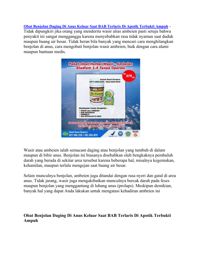 Obat Benjolan Daging Di Anus Keluar Saat BAB Terlaris Di Apotik Terbukti Ampuh - Tidak dipungkiri jika orang yang menderita wasir alias ambeien pasti setuju bahwa penyakit ini sangat mengganggu karena menyebabkan rasa tidak nyaman saat duduk maupun buang air besar. Tidak heran bila banyak yang mencari cara menghilangkan benjolan di anus, cara mengobati benjolan wasir ambeien, baik dengan cara alami maupun bantuan medis. Wasir atau ambeien ialah semacam daging atau benjolan yang tumbuh di dalam maupun di bibir anus. Benjolan ini biasanya disebabkan oleh bengkaknya pembuluh darah yang berada di sekitar area tersebut karena beberapa hal, misalnya kegemukan, kehamilan, maupun terlalu mengejan saat buang air besar. Selain munculnya benjolan, ambeien juga ditandai dengan rasa nyeri dan gatal di area anus. Tidak jarang, wasir juga mengakibatkan munculnya bercak darah pada feses maupun benjolan yang menggantung di lubang anus (prolaps). Meskipun demikian, banyak hal yang dapat Anda lakukan untuk mengatasi kehadiran ambeien ini Obat Benjolan Daging Di Anus Keluar Saat BAB Terlaris Di Apotik Terbukti Ampuh Secara umum, ambeien terbagi menjadi 2 jenis, yaitu ambeien dalam dan ambeien luar. Perbedaan yang utama dari kedua jenis ambeien tersebut adalah letak terbentuknya ambeien. Apa saja ciri-cirinya? Mari simak ulasan berikut. JENIS AMBEIEN DAN CIRI CIRINYA Ambeien terjadi ketika pembuluh darah di usus besar bagian akhir (rektum) dan dubur atau anus membengkak. Berdasarkan lokasi dan gejala yang ditimbulkan, ambeien terbagi menjadi 2 jenis, yaitu: Ambeien dalam (internal hemorrhoid) Disebut demikian karena pembengkakan yang terjadi berada di dalam anus, tepatnya di liang rektum. Ambeien internal jauh di dalam rektum dan tidak terlihat dari luar. Umumnya, ambeien dalam tidak menimbulkan keluhan sakit karena di liang rektum tidak banyak terdapat saraf. Seringkali, tanda pertama bahwa wasir internal hadir adalah pendarahan dubur. Gejala ambeien dalam yang lain adalah gatal dan nyeri pada anus. Gejala ini biasanya baru muncul ketika ambeien dalam menjadi semakin besar. Mengejan kadang-kadang dapat mendorong wasir internal sehingga menjorok melalui anus. Ini disebut ambeien yang menonjol atau prolaps dan bisa terasa sakit. Ambeien luar (external hemorrhoid) Pada jenis ambeien ini, lokasi pembengkakannya berada di luar rektum atau lebih tepatnya di sekitar lubang anus. Orang yang mengalami ambeien luar dapat mengeluhkan beberapa gejala, seperti: Rasa perih dan panas di sekitar anus. Gatal pada anus. Adanya benjolan atau pembengkakan di sekitar anus. BAB berdarah. Dari gejalanya, ambeien luar terasa lebih nyeri dan sering kali membuat penderitanya merasa tidak nyaman. Hal ini karena pembuluh darah yang mengalami pembengkakan berada di bawah kulit sekitar anus, di mana ada lebih banyak saraf di area tersebut. Obat Benjolan Daging Di Anus Keluar Saat BAB Terlaris Di Apotik Terbukti Ampuh CIRI CIRI AMBEIEN ATAU WASIR SECARA UMUM Secara umum, ciri-ciri yang sering dialami penderita adalah perdarahan saat sedang buang air besar. Perdarahan ini bisa berupa bercak darah pada feses atau tetesan darah yang mengalir dari dubur. Selain itu, ada beberapa ciri lain yang bisa dideteksi, di antaranya: 1. Rasa Mengganjal Saat Buang Air Besar Sering kali kita merasa ada sesuatu yang membuat proses buang air besar tertahan. Akibatnya kita akan mengejan dan berusaha mengeluarkan feses dari dubur. Dalam beberapa kasus, mengejan justru akan membuat pembuluh vena pecah dan menimbulkan benjolan (ambeien). Namun, apabila sejak awal penyebab BAB tertahan adalah benjolan tersebut, maka proses mengejan justru akan memperparah ambeien atau wasir yang sudah dimiliki. Jika dibiarkan lama kelamaan akan timbul perdarahan. 2. Rasa Tidak Nyaman pada Anus Selain perdarahan dan gatal, penderita ambeien atau wasir biasanya akan memiliki benjolan di lubang anus. Nah, benjolan inilah yang sering kali menimbulkan rasa tidak nyaman. Ketika merasa tidak nyaman, penderita akan mengalami kesulitan saat harus duduk atau jongkok dalam waktu yang lama. 3. Prolaps Prolaps merupakan keluarnya bagian ambeien atau wasir dari lubang anus. Muncul benjolan keluar dari anus setelah buang air besar. Benjolan dapat masuk sendiri atau harus didorong terlebih dahulu. Jadi, jika saat meraba bagian dubur, Anda mendapati daging yang menonjol berwarna merah muda (lebih terang) dari area sekitarnya dan terasa perih atau bahkan mengeluarkan darah, bisa dipastikan Anda menderita penyakit ambeien atau wasir. 4. Anemia Skunder Wajah pucat, tubuh mudah lemas dan sulit berkonsensentrasi. Gejala ini biasanya muncul bila telah terjadi komplikasi anemia akibat perdarahan yang berlebihan. Perdarahan pada dubur akibat ambeien tentu saja akan membuat penderita mengalami kukurangan darah. Hal ini sering kali menjadi pemicu penyakit lain, salah satunya anemia sekunder. Apabila hal ini yang Anda alami, bisa saja penyebabnya adalah ambeien atau wasir. 5. Infeksi di Daerah Dubur Luka pada ambeien akibat perdarahan akan membuat kuman mudah masuk ke dalam tubuh, hal ini akan menimbulkan infeksi. Jika anus terasa sakit dan perih setiap buang air besar, bisa jadi Anda memiliki ambeien atau wasir. Tingkatan Stadium Wasir Atau sakit Ambeien Wasir stadium 1 : Wasir jenis ini biasanya tidak sampai prolaps. Rasanya hanya kurang nyaman saat BAB. Ambeien stadium 2 : Bagian anus sudah bisa diraba ada benjolan, namun biasanya benjolan bisa masuk dengan sendirinya dan kadang ada rasa panas serta gatal. Wasir stadium 3 : Benjolan pada anus sudah besar dan susah masuk lagi harus dibantu dengan jari. Ambeien stadium 4 : Benjolan wasie sudah besar sekali dan sulit untuk dimasukan lagi meskipun dengan bantuan tangan, selain itu juga menjadi sering pendarahan. Cara menghilangkan benjolan ambeien dengan bantuan medis Dokter akan memprioritaskan penanganan tanpa operasi, namun bila wasir Anda sudah sangat parah atau amat mengganggu, bukan tidak mungkin Anda akan diminta menjalani prosedur pembedahan. Cara 