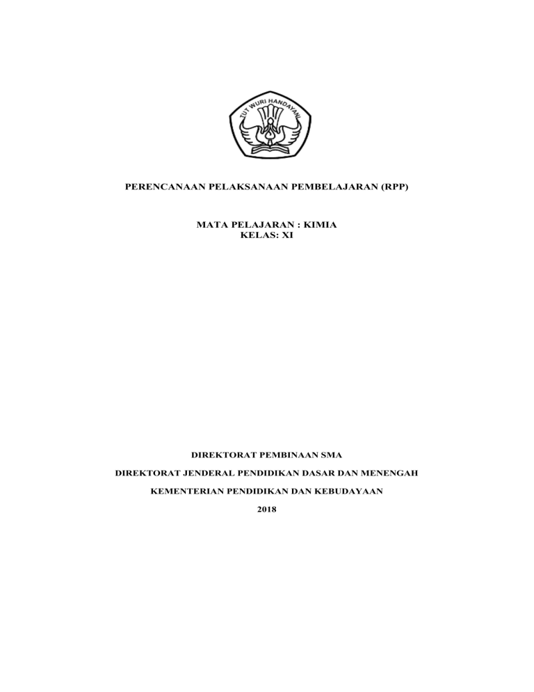 PERENCANAAN PELAKSANAAN PEMBELAJARAN (RPP) MATA PELAJARAN : KIMIA KELAS: XI DIREKTORAT PEMBINAAN SMA DIREKTORAT JENDERAL PENDIDIKAN DASAR DAN MENENGAH KEMENTERIAN PENDIDIKAN DAN KEBUDAYAAN 2018 RENCANA PELAKSANAAN PEMBELAJARAN (RPP) Satuan Pendidikan Mata Pelajaran Kelas /Semester Materi Pokok Tahun Pelajaran Alokasi Waktu : SMA N : KIMIA : XI/Ganjil : Termokimia : 2018/2019 : 12 JP ( 3 Pertemuan) A. Kompetensi inti Rumusan Kompetensi Sikap Spiritual adalah “Menghayati dan mengamalkan ajaran agama yang dianutnya”. Adapun rumusan Kompetensi Sikap Sosial adalah “Menunjukkan perilaku jujur, disiplin, tanggung jawab, peduli (gotong royong, kerja sama, toleran, damai), santun, responsif, dan pro-aktif dan menunjukkan sikap sebagai bagian dari solusi atas berbagai permasalahan dalam berinteraksi secara efektif dengan lingkungan sosial dan alam serta menempatkan diri sebagai cerminan bangsa dalam pergaulan dunia”. Kedua kompetensi tersebut dicapai melalui pembelajaran tidak langsung (indirect teaching), yaitu keteladanan, pembiasaan, dan budaya sekolah, dengan memperhatikan karakteristik mata pelajaran serta kebutuhan dan kondisi siswa. 3. Memahami, menerapkan, menganalisis dan mengevaluasi pengetahuan faktual, konseptual, prosedural, dan metakognitif berdasarkan rasa ingintahunya tentang ilmu pengetahuan, teknologi, seni, budaya, dan humaniora dengan wawasan kemanusiaan, kebangsaan, kenegaraan, dan peradaban terkait penyebab fenomena dan kejadian, serta menerapkan pengetahuan prosedural pada bidang kajian yang spesifik sesuai dengan bakat dan minatnya untuk memecahkan masalah 4. Mengolah, menalar, menyaji, dan mencipta dalam ranah konkret dan ranah abstrak terkait dengan pengembangan dari yang dipelajarinya di sekolah secara mandiri serta bertindak secara efektif dan kreatif, dan mampu menggunakan metode sesuai kaidah keilmuan B. Kompetensi Dasar dan Indikator Pencapaian Kompetensi (IPK) Kompetensi Dasar Dari KI 3 3.4 3.5 Kompetensi Dasar Dari KI 4 Menjelaskan konsep perubahan entalpi 4.4 pada tekanan tetap dalam persamaan termokimia 4.5 Menjelaskan jenis entalpi reaksi, hukum Hess dan konsep energi ikatan Indikator Pencapaian Kompetensi Dari KI 3 3.4.1 Menjelaskan konsep perubahan entalpi pada tekanan tetap dan penggunaannya dalam persamaan termokimia 3.4.2 Menjelaskan Istilah-istilah dan Satuan dalam Termokimia 3.4.3 Menjelaskan Hukum Kekekalan Energi 3.4.4 Menganalisis Hubungan Energi Dalam, Kalor, dan Kerja dengan Hukum Termokimia 3.4.5 Mendeskrifsikan Sistem & Lingkungan 3.4.6 Menjelaskan Reaksi Eksoterm dan Endoterm 3.4.7 Menjelaskan Persamaan Termokimia 3.5.1 Menjelaskan berbagai jenis entalpi reaksi (entalpi pembentukan, entalpi pembakaran, dan lain-lain), hukum Hess dan konsep energi ikatan 3.5.2 Menjelaskan Perubahan Entalpi Standar (∆Ho) 3.5.3 Menjelaskan Penentuan ∆H Reaksi Nilai Karakter Menyimpulkan hasil analisis data percobaan termokimia pada tekanan tetap Membandingkan perubahan entalpi beberapa reaksi berdasarkan data hasil percobaan Indikator Pencapaian Kompetensi Dari KI 4 4.4.1 Melakukan percobaan reaksi eksoterm dan reaksi endoterm 4.4.2 Melakukan percobaan penentuan H suatu reaksi. 4.4.3 Melakukan percobaan termokimia pada tekanan tetap 4.5.1 Menghitung H reaksi berdasarkan hukum Hess, 4.5.2 Menghitung H reaksi berdasarkan data perubahan entalpi pembentukan standar 4.5.3 Menghitung H reaksi berdasarkan data energi ikatan Religius Mandiri Gotong royong Kejujuran Kerja keras Percaya diri Kerjasama C. Tujuan Pembelajaran Melalui kegiatan pembelajaran menggunakan model Problem Based Learning yang menuntun peserta didik untuk mengamati (membaca) permasalahan, menuliskan penyelesaian dan mempresentasikan hasilnya di depan kelas, Selama dan setelah mengikuti proses pembelajaran ini peserta didik diharapkan dapat Memahami konsep ∆H sebagai kalor reaksi pada tekanan tetap dan penggunaannya dalam persamaan termokimia Memahami Istilah-istilah dan Satuan dalam Termokimia Memahami Hukum Kekekalan Energi Memahami Hubungan Energi Dalam, Kalor, dan Kerja dengan Hukum Termokimia Memahami Sistem & Lingkungan Memahami Reaksi Eksoterm dan Endoterm Memahami Persamaan Termokimia Memahami berbagai jenis entalpi reaksi (entalpi pembentukan, entalpi pembakaran, dan lainlain), hukum Hess dan konsep energi ikatan Memahami Perubahan Entalpi Standar (∆Ho) Menjelaskan Penentuan ∆H Reaksi dengan rasa ingin tahu, tanggung jawab, disiplin selama proses pembelajaran, bersikap jujur, santun, percaya diri, pantang menyerah, memiliki sikap responsif (berpikir kritis) dan proaktif (kreatif), serta mampu berkomunikasi dan bekerjasama dengan baik Fokus nilai-nilai sikap: Kejujuran, Kedisiplinan Kepedulian dan Tanggung jawab D. Materi Pembelajaran 1. Materi Pembelajaran Reguler a. Fakta: Entalpi : energi yang terkandung dalam suatu zat dengan lambing H Energi : kemampuan suatu materi untuk melakukan kerja. Energi dalam : jumlah energi dari semua energi yang dimiliki oleh sistem molekul. b. Konsep Hukum kekekalan energi “Energi tidak dapat diciptakan atau dimusnahkan. Energi dapat diubah dari suatu bentuk energi menjadi bentuk lain”. Entalpi (H) suatu zat ditentukan oleh jumlah energi dari semua bentuk energi yang dimiliki zat tersebut yang jumlahnya tidak dapat diukur. Perubahan entalpi (ΔH) dapat ditentukan dari jumlah kalor yang dilepaskan atau diserap oleh reaksi kimia. Kalor reaksi yang dilepaskan atau diserap oleh suatu reaksi tidak tergantung pada jalannya reaksi , tetapi tergantung pada keadaan zat-zat yang bereaksi dan zat-zat hasil reaksi. c. Prinsip Sistem & Lingkungan Terbagi atas tiga yaitu : 1) Sistem terbuka : sistem yang memungkinkan terjadinya pertukaran kalor dan materi antara sistem dan lingkungan. 2) Sistem tertutup : sistem yang memungkinkan terjadinya pertukaran kalor antara sistem dan lingkungan tetapi tidak terjadi pertukaran materi. 3) Sistem terisolasi : sistem yang tidak memungkinkan terjadinya pertukaran kalor dan materi antara sistem dan lingkungan. d. Prosedur