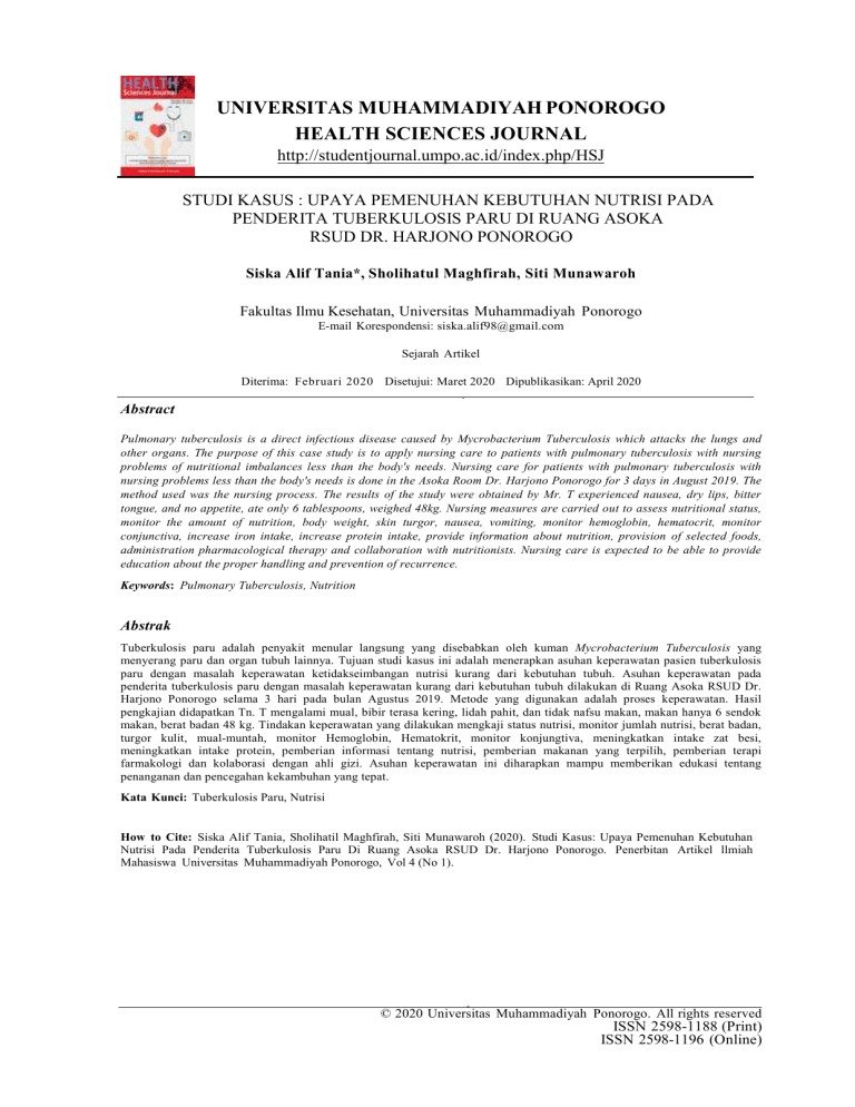 UNIVERSITAS MUHAMMADIYAH PONOROGO HEALTH SCIENCES JOURNAL http://studentjournal.umpo.ac.id/index.php/HSJ STUDI KASUS : UPAYA PEMENUHAN KEBUTUHAN NUTRISI PADA PENDERITA TUBERKULOSIS PARU DI RUANG ASOKA RSUD DR. HARJONO PONOROGO Siska Alif Tania*, Sholihatul Maghfirah, Siti Munawaroh Fakultas Ilmu Kesehatan, Universitas Muhammadiyah Ponorogo E-mail Korespondensi: [email protected] Sejarah Artikel Diterima: Februari 2020 Disetujui: Maret 2020 Dipublikasikan: April 2020 Abstract Pulmonary tuberculosis is a direct infectious disease caused by Mycrobacterium Tuberculosis which attacks the lungs and other organs. The purpose of this case study is to apply nursing care to patients with pulmonary tuberculosis with nursing problems of nutritional imbalances less than the body's needs. Nursing care for patients with pulmonary tuberculosis with nursing problems less than the body's needs is done in the Asoka Room Dr. Harjono Ponorogo for 3 days in August 2019. The method used was the nursing process. The results of the study were obtained by Mr. T experienced nausea, dry lips, bitter tongue, and no appetite, ate only 6 tablespoons, weighed 48kg. Nursing measures are carried out to assess nutritional status, monitor the amount of nutrition, body weight, skin turgor, nausea, vomiting, monitor hemoglobin, hematocrit, monitor conjunctiva, increase iron intake, increase protein intake, provide information about nutrition, provision of selected foods, administration pharmacological therapy and collaboration with nutritionists. Nursing care is expected to be able to provide education about the proper handling and prevention of recurrence. Keywords: Pulmonary Tuberculosis, Nutrition Abstrak Tuberkulosis paru adalah penyakit menular langsung yang disebabkan oleh kuman Mycrobacterium Tuberculosis yang menyerang paru dan organ tubuh lainnya. Tujuan studi kasus ini adalah menerapkan asuhan keperawatan pasien tuberkulosis paru dengan masalah keperawatan ketidakseimbangan nutrisi kurang dari kebutuhan tubuh. Asuhan keperawatan pada penderita tuberkulosis paru dengan masalah keperawatan kurang dari kebutuhan tubuh dilakukan di Ruang Asoka RSUD Dr. Harjono Ponorogo selama 3 hari pada bulan Agustus 2019. Metode yang digunakan adalah proses keperawatan. Hasil pengkajian didapatkan Tn. T mengalami mual, bibir terasa kering, lidah pahit, dan tidak nafsu makan, makan hanya 6 sendok makan, berat badan 48 kg. Tindakan keperawatan yang dilakukan mengkaji status nutrisi, monitor jumlah nutrisi, berat badan, turgor kulit, mual-muntah, monitor Hemoglobin, Hematokrit, monitor konjungtiva, meningkatkan intake zat besi, meningkatkan intake protein, pemberian informasi tentang nutrisi, pemberian makanan yang terpilih, pemberian terapi farmakologi dan kolaborasi dengan ahli gizi. Asuhan keperawatan ini diharapkan mampu memberikan edukasi tentang penanganan dan pencegahan kekambuhan yang tepat. Kata Kunci: Tuberkulosis Paru, Nutrisi How to Cite: Siska Alif Tania, Sholihatil Maghfirah, Siti Munawaroh (2020). Studi Kasus: Upaya Pemenuhan Kebutuhan Nutrisi Pada Penderita Tuberkulosis Paru Di Ruang Asoka RSUD Dr. Harjono Ponorogo. Penerbitan Artikel llmiah Mahasiswa Universitas Muhammadiyah Ponorogo, Vol 4 (No 1). © 2020 Universitas Muhammadiyah Ponorogo. All rights reserved ISSN 2598-1188 (Print) ISSN 2598-1196 (Online) 2 | Health Sciences Journal Vol 4 (No 1)(2020): 1 - 1 4 PENDAHULUAN Tuberkulosis paru (TB paru) adalah penyakit terutama Jawa Timur pada tahun 2015 menempati menyerang penyakit parenkim paru dan urutan kedua di Indonesia dalam jumlah penyakit infeksi yang disebabkan bakteri penemuan penderita penemuan TB BTA + berbentuk batang (basil) yang dikenal kasus baru. Pada tahun 2016, jumlah dengan nama Mycobacterium tuberculosis semua kasus TB diobati sebanyak 47.478 (Depkes RI, 2012). Menurut World Health kasus dari perkiraan jumlah kasus sebesar Organization (WHO) laporan global 2013 123.414 kasus atau Case Detection Rate mengatakan bahwa penderita TB di dunia (CDR) TB sebesar 39% (Profil Kesehatan sebanyak 9 juta orang dan 1,5 juta orang Provinsi Jawa Timur, 2016). diantaranya infeksius, yang Jawa Barat (Kemenkes, 2011). Provinsi meninggal akibat TB, Tuberkulosis dapat menular Indonesia termasuk sebagai salah satu dari diakibatkan karena kebiasaan buruk pasien 22 negara yang memiliki beban TB yang TB paru yang meludah sembarangan. tinggi (High Burden Countries-HBC). Selain itu, kebersihan lingkungan juga Jumlah kasus baru TBC di Indonesia tahun dapat mempengaruhi penyebaran virus. 2013 Misalnya, rumah yang kurang baik dalam sebanyak 460.000 dan sekitar 140.000 kematian di Indonesia setiap pengaturan tahunnya disebabkan oleh TBC (WHO, akibat kurang lancarnya pergantian udara 2013). dan Indonesia sampai dengan tahun 2014 ventilasi. sinar matahari berkembang biaknya Kondisi lembab dapat membantu virus (Sunaryo, menempati urutan kedua dari 5 negara 2013). Lingkungan yang lembab, gelap terbesar di dunia sebagai penyumbang dan tidak memiliki ventilasi memebrikan penderita TB terbanyak setelah negara andil besar bagi seseorang terjangkit TB India, China, Nigeria dan Pakistan. Pada paru, penyakit TB paru sangat cepat tahun 2015, beban global penyakit TB menyebar (prevalensi dan mortalitas) akan relatif terutama bagi kelompok sosial ekonomi dibandingkan tahun 1990, dan setidaknya rendah 70% orang yang terinveksi TB dapat penyebaran infeksi TB paru sangat tinggi, dideteksi dengan strategi DOTS dan 85% maka tidak berlebihan jika penyakit TB diantaranya merupakan dinyatakan sembuh (Kemenkes RI, 2015). Di Provinsi Jawa Timur memiliki kasus TB terbanyak kedua setelah Provinsi dan dan menginfeksi kurang penyakit gizi. manusia Kecepatan yang mematikan (Anggraeni, 2012). Penyakit makan infeksi tambahan dan pada kurangnya umumnya Health Sciences Journal Vol 4 (No 1)(2020): 1 - 1 4 mempunyai hubungan penyimpangan dengan diperoleh dari seseorang (Ruswanto, 2010). Ketidak- observasi pada seimbangan nutrisi kurang dari kebutuhan penyelesaian ka