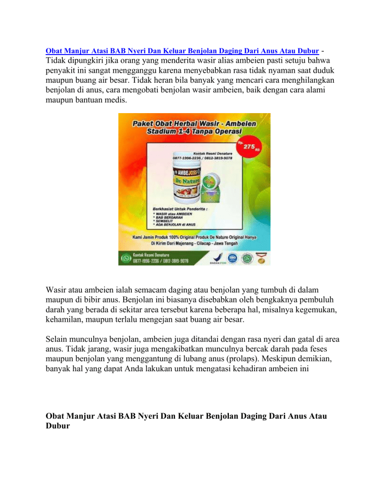 Obat Manjur Atasi BAB Nyeri Dan Keluar Benjolan Daging Dari Anus Atau Dubur - Tidak dipungkiri jika orang yang menderita wasir alias ambeien pasti setuju bahwa penyakit ini sangat mengganggu karena menyebabkan rasa tidak nyaman saat duduk maupun buang air besar. Tidak heran bila banyak yang mencari cara menghilangkan benjolan di anus, cara mengobati benjolan wasir ambeien, baik dengan cara alami maupun bantuan medis. Wasir atau ambeien ialah semacam daging atau benjolan yang tumbuh di dalam maupun di bibir anus. Benjolan ini biasanya disebabkan oleh bengkaknya pembuluh darah yang berada di sekitar area tersebut karena beberapa hal, misalnya kegemukan, kehamilan, maupun terlalu mengejan saat buang air besar. Selain munculnya benjolan, ambeien juga ditandai dengan rasa nyeri dan gatal di area anus. Tidak jarang, wasir juga mengakibatkan munculnya bercak darah pada feses maupun benjolan yang menggantung di lubang anus (prolaps). Meskipun demikian, banyak hal yang dapat Anda lakukan untuk mengatasi kehadiran ambeien ini Obat Manjur Atasi BAB Nyeri Dan Keluar Benjolan Daging Dari Anus Atau Dubur Secara umum, ambeien terbagi menjadi 2 jenis, yaitu ambeien dalam dan ambeien luar. Perbedaan yang utama dari kedua jenis ambeien tersebut adalah letak terbentuknya ambeien. Apa saja ciri-cirinya? Mari simak ulasan berikut. JENIS AMBEIEN DAN CIRI CIRINYA Ambeien terjadi ketika pembuluh darah di usus besar bagian akhir (rektum) dan dubur atau anus membengkak. Berdasarkan lokasi dan gejala yang ditimbulkan, ambeien terbagi menjadi 2 jenis, yaitu: Ambeien dalam (internal hemorrhoid) Disebut demikian karena pembengkakan yang terjadi berada di dalam anus, tepatnya di liang rektum. Ambeien internal jauh di dalam rektum dan tidak terlihat dari luar. Umumnya, ambeien dalam tidak menimbulkan keluhan sakit karena di liang rektum tidak banyak terdapat saraf. Seringkali, tanda pertama bahwa wasir internal hadir adalah pendarahan dubur. Gejala ambeien dalam yang lain adalah gatal dan nyeri pada anus. Gejala ini biasanya baru muncul ketika ambeien dalam menjadi semakin besar. Mengejan kadang-kadang dapat mendorong wasir internal sehingga menjorok melalui anus. Ini disebut ambeien yang menonjol atau prolaps dan bisa terasa sakit. Ambeien luar (external hemorrhoid) Pada jenis ambeien ini, lokasi pembengkakannya berada di luar rektum atau lebih tepatnya di sekitar lubang anus. Orang yang mengalami ambeien luar dapat mengeluhkan beberapa gejala, seperti: Rasa perih dan panas di sekitar anus. Gatal pada anus. Adanya benjolan atau pembengkakan di sekitar anus. BAB berdarah. Dari gejalanya, ambeien luar terasa lebih nyeri dan sering kali membuat penderitanya merasa tidak nyaman. Hal ini karena pembuluh darah yang mengalami pembengkakan berada di bawah kulit sekitar anus, di mana ada lebih banyak saraf di area tersebut. Obat Manjur Atasi BAB Nyeri Dan Keluar Benjolan Daging Dari Anus Atau Dubur CIRI CIRI AMBEIEN ATAU WASIR SECARA UMUM Secara umum, ciri-ciri yang sering dialami penderita adalah perdarahan saat sedang buang air besar. Perdarahan ini bisa berupa bercak darah pada feses atau tetesan darah yang mengalir dari dubur. Selain itu, ada beberapa ciri lain yang bisa dideteksi, di antaranya: 1. Rasa Mengganjal Saat Buang Air Besar Sering kali kita merasa ada sesuatu yang membuat proses buang air besar tertahan. Akibatnya kita akan mengejan dan berusaha mengeluarkan feses dari dubur. Dalam beberapa kasus, mengejan justru akan membuat pembuluh vena pecah dan menimbulkan benjolan (ambeien). Namun, apabila sejak awal penyebab BAB tertahan adalah benjolan tersebut, maka proses mengejan justru akan memperparah ambeien atau wasir yang sudah dimiliki. Jika dibiarkan lama kelamaan akan timbul perdarahan. 2. Rasa Tidak Nyaman pada Anus Selain perdarahan dan gatal, penderita ambeien atau wasir biasanya akan memiliki benjolan di lubang anus. Nah, benjolan inilah yang sering kali menimbulkan rasa tidak nyaman. Ketika merasa tidak nyaman, penderita akan mengalami kesulitan saat harus duduk atau jongkok dalam waktu yang lama. 3. Prolaps Prolaps merupakan keluarnya bagian ambeien atau wasir dari lubang anus. Muncul benjolan keluar dari anus setelah buang air besar. Benjolan dapat masuk sendiri atau harus didorong terlebih dahulu. Jadi, jika saat meraba bagian dubur, Anda mendapati daging yang menonjol berwarna merah muda (lebih terang) dari area sekitarnya dan terasa perih atau bahkan mengeluarkan darah, bisa dipastikan Anda menderita penyakit ambeien atau wasir. 4. Anemia Skunder Wajah pucat, tubuh mudah lemas dan sulit berkonsensentrasi. Gejala ini biasanya muncul bila telah terjadi komplikasi anemia akibat perdarahan yang berlebihan. Perdarahan pada dubur akibat ambeien tentu saja akan membuat penderita mengalami kukurangan darah. Hal ini sering kali menjadi pemicu penyakit lain, salah satunya anemia sekunder. Apabila hal ini yang Anda alami, bisa saja penyebabnya adalah ambeien atau wasir. 5. Infeksi di Daerah Dubur Luka pada ambeien akibat perdarahan akan membuat kuman mudah masuk ke dalam tubuh, hal ini akan menimbulkan infeksi. Jika anus terasa sakit dan perih setiap buang air besar, bisa jadi Anda memiliki ambeien atau wasir. Tingkatan Stadium Wasir Atau sakit Ambeien Wasir stadium 1 : Wasir jenis ini biasanya tidak sampai prolaps. Rasanya hanya kurang nyaman saat BAB. Ambeien stadium 2 : Bagian anus sudah bisa diraba ada benjolan, namun biasanya benjolan bisa masuk dengan sendirinya dan kadang ada rasa panas serta gatal. Wasir stadium 3 : Benjolan pada anus sudah besar dan susah masuk lagi harus dibantu dengan jari. Ambeien stadium 4 : Benjolan wasie sudah besar sekali dan sulit untuk dimasukan lagi meskipun dengan bantuan tangan, selain itu juga menjadi sering pendarahan. Cara menghilangkan benjolan ambeien dengan bantuan medis Dokter akan memprioritaskan penanganan tanpa operasi, namun bila wasir Anda sudah sangat parah atau amat mengganggu, bukan tidak mungkin Anda akan diminta menjalani prosedur pembedahan. Cara menghilan
