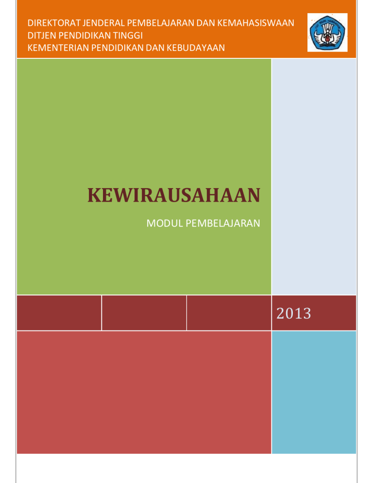 DIREKTORAT JENDERAL PEMBELAJARAN DAN KEMAHASISWAAN DITJEN PENDIDIKAN TINGGI KEMENTERIAN PENDIDIKAN DAN KEBUDAYAAN KEWIRAUSAHAAN MODUL PEMBELAJARAN 2013 Modul Pembelajaran Kewirausahaan ii PRAKATA Tahun 2013 Kementerian Pendidikan dan Kebudayaan akan merubah kurikulum mulai dari pendidikan dasar sampai pendidikan tinggi. Sesuai dengan Undang-Undang No 12 tahun 2012, bahwa perguruan tinggi memiliki otonomi dalam penyusunan kurikulum, namun pada pelaksanaannya diperlukan rambu-rambu yang sama agar dapat mencapai hasil yang optimal. Disamping itu, peserta didik di perguruan tinggi merupakan insan dewasa , sehingga dianggap sudah memiliki kesadaran dalam mengembangkan potensi diri untuk menjadi intelektual, ilmuwan, praktisi, dan atau professional. Sehubungan dengan itu, maka perubahan pada proses pembelajaran menjadi penting dan akan menciptakan iklim akademik yang akan meningkatkan kompetensi mahasiswa baik hardskills maupun softskills. Hal ini sesuai dengan tujuan Pendidikan Tinggi dalam UU No 12 tahun 12 yaitu menjadi manusia yang beriman dan bertakwa kepada Tuhan Yang Maha Esa dan berakhlak mulia, sehat, berilmu, cakap, kreatif, mandiri, terampil, kompeten, dan berbudaya untuk kepentingan bangsa Untuk mewujudkan tujuan tersebut, seluruh mahasiswa harus mengikuti pembelajaran mata kuliah dasar umum yang dikenal dengan MKDU (general education). Sebagian dari MKDU telah dinyatakan dalam UU No 12 tahun 2012 sebagai mata kuliah wajib, yaitu Agama, Pancasila, Kewarganegaraan, dan Bahasa Indonesia. Dalam rangka menyempurnakan capaian pembelajaran, maka MKDU ditambah dengan bahasa Inggris, Kewirausahaan, dan mata kuliah yang mendorong pada pengembangan karakter lainnya, baik yang terintegrasi maupun individu. Mata Kuliah Kewirausahaan merupakan pelajaran yang membentuk karakter wirausaha atau minimal mahasiswa menambah pengetahuan mahasiswa mengenai seluk-beluk bisnis baik dari sisi soft skill maupun hard skill sehingga mahasiswa mampu memanfaatkan peluangpeluang yang ada di sekitarnya dalam menciptakan usaha sendiri setelah lulus maupun saat masih kuliah. Pada tahun ini dihasilkan rencana pembelajaran secara rinci, beserta bahan ajar yang kami berharap dapat digunakan oleh kalangan dosen pengampu di perguruan tinggi. Penyusunan rencana pembelajaran dan bahan ajar ini didanai oleh Satker Direktorat Pembelajaran dan Kemahasiswaan Ditjen Dikti tahun 2012. Bahan ini akan diunggah di web Dikti agar menjadi sumber belajar terbuka bagi semua. Kepada tim penulis kami mengucapkan terima kasih atas dedikasi, waktu dan curahan pemikirannya untuk menuangkan buah pemikiran untuk memantapkan Kewirausahaan di perguruan tinggi. Penyempurnaan secara periodik akan tetap dilakukan, untuk ini kami mohon kepada para pengguna dapat memberikan masukan secara tertulis, baik langsung kepada penulis maupun kepada Direktorat Pembelajaran dan Kemahasiswaan Ditjen Dikti. Semoga bahan ajar ini bermanfaat dan dapat digunakan sebaik-baiknya, Jakarta 10 Januari 2013 Direktur Jenderal Pendidikan Tinggi Djoko Santoso Modul Pembelajaran Kewirausahaan ii MODUL KEWIRAUSAHAAN TUJUAN PEMBELAJARAN KOMPETENSI KEWIRAUSAHAAN : Mahasiswa akan dapat memahami, menerapkan dan menjadikan pola hidup berwirausaha dengan kemampuan berkomunikasi, memimpin dan menerapkan manajemen usaha dalam mengelola usahanya dengan baik dan benar. Modul Pembelajaran Kewirausahaan iii Daftar Isi PRAKATA ............................................................................................................................................ ii MODUL KEWIRAUSAHAAN................................................................................................................ iii TUJUAN PEMBELAJARAN KOMPETENSI KEWIRAUSAHAAN : ............................................................. iii DAFTAR ISI ........................................................................................................................................ iv PENDAHULUAN ................................................................................................................................. ix RENCANA PEMBELAJARAN SATU SEMESTER UNTUK KOMPETENSI: KEWIRAUSAHAAN .................... xi BAGIAN 1 : KOMPETENSI KARAKTER ..................................................................................................1 METODE PEMBELAJARAN KOMPETENSI KARAKTER ...........................................................................2 KRITERIA PENILAIAN KOMPETENSI KARAKTER ...................................................................................3 BAB I. KARAKTER WIRAUSAHA SUKSES : Membangun Mimpi dan Mengejar Cita-cita (dream) .............4 Suplemen bab 1. WIRAUSAHA DAN IMPIAN ........................................................................................9 1.1. Impian menjadi wirausahawan .....................................................................................9 1.2. Impian Harus Smart ....................................................................................................14 1.3. Pengertian Entrepreneur/Wirausaha ..........................................................................15 1.4. Pendapat para pakar mengenai kewirausahaan. .........................................................16 1.5. Keuntungan dan Kerugian Wirausaha .........................................................................18 1.6. Langkah-langkah memulai wirausaha .........................................................................19 BAB II. Karakter Wirausaha Sukses : Memotivasi Diri Sendiri (Self Motivated) ...................................23 Suplemen Bab 2. KARAKTER KEWIRAUSAHAAN .................................................................................32 2.1. Karakter Wirausahawan..............................................................................................32 2.2. Faktor-faktor Yang Menyebabkan Kegagalan Wirausaha .............................................46 BAB III. Karakter Wirausaha Sukses : Menyelesaikan Masalah 1 : ...