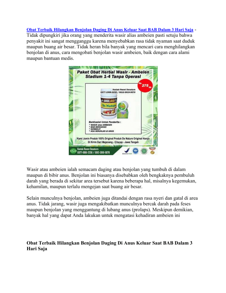 Obat Terbaik Hilangkan Benjolan Daging Di Anus Keluar Saat BAB Dalam 3 Hari Saja - Tidak dipungkiri jika orang yang menderita wasir alias ambeien pasti setuju bahwa penyakit ini sangat mengganggu karena menyebabkan rasa tidak nyaman saat duduk maupun buang air besar. Tidak heran bila banyak yang mencari cara menghilangkan benjolan di anus, cara mengobati benjolan wasir ambeien, baik dengan cara alami maupun bantuan medis. Wasir atau ambeien ialah semacam daging atau benjolan yang tumbuh di dalam maupun di bibir anus. Benjolan ini biasanya disebabkan oleh bengkaknya pembuluh darah yang berada di sekitar area tersebut karena beberapa hal, misalnya kegemukan, kehamilan, maupun terlalu mengejan saat buang air besar. Selain munculnya benjolan, ambeien juga ditandai dengan rasa nyeri dan gatal di area anus. Tidak jarang, wasir juga mengakibatkan munculnya bercak darah pada feses maupun benjolan yang menggantung di lubang anus (prolaps). Meskipun demikian, banyak hal yang dapat Anda lakukan untuk mengatasi kehadiran ambeien ini Obat Terbaik Hilangkan Benjolan Daging Di Anus Keluar Saat BAB Dalam 3 Hari Saja Secara umum, ambeien terbagi menjadi 2 jenis, yaitu ambeien dalam dan ambeien luar. Perbedaan yang utama dari kedua jenis ambeien tersebut adalah letak terbentuknya ambeien. Apa saja ciri-cirinya? Mari simak ulasan berikut. JENIS AMBEIEN DAN CIRI CIRINYA Ambeien terjadi ketika pembuluh darah di usus besar bagian akhir (rektum) dan dubur atau anus membengkak. Berdasarkan lokasi dan gejala yang ditimbulkan, ambeien terbagi menjadi 2 jenis, yaitu: Ambeien dalam (internal hemorrhoid) Disebut demikian karena pembengkakan yang terjadi berada di dalam anus, tepatnya di liang rektum. Ambeien internal jauh di dalam rektum dan tidak terlihat dari luar. Umumnya, ambeien dalam tidak menimbulkan keluhan sakit karena di liang rektum tidak banyak terdapat saraf. Seringkali, tanda pertama bahwa wasir internal hadir adalah pendarahan dubur. Gejala ambeien dalam yang lain adalah gatal dan nyeri pada anus. Gejala ini biasanya baru muncul ketika ambeien dalam menjadi semakin besar. Mengejan kadang-kadang dapat mendorong wasir internal sehingga menjorok melalui anus. Ini disebut ambeien yang menonjol atau prolaps dan bisa terasa sakit. Ambeien luar (external hemorrhoid) Pada jenis ambeien ini, lokasi pembengkakannya berada di luar rektum atau lebih tepatnya di sekitar lubang anus. Orang yang mengalami ambeien luar dapat mengeluhkan beberapa gejala, seperti: Rasa perih dan panas di sekitar anus. Gatal pada anus. Adanya benjolan atau pembengkakan di sekitar anus. BAB berdarah. Dari gejalanya, ambeien luar terasa lebih nyeri dan sering kali membuat penderitanya merasa tidak nyaman. Hal ini karena pembuluh darah yang mengalami pembengkakan berada di bawah kulit sekitar anus, di mana ada lebih banyak saraf di area tersebut. Obat Terbaik Hilangkan Benjolan Daging Di Anus Keluar Saat BAB Dalam 3 Hari Saja CIRI CIRI AMBEIEN ATAU WASIR SECARA UMUM Secara umum, ciri-ciri yang sering dialami penderita adalah perdarahan saat sedang buang air besar. Perdarahan ini bisa berupa bercak darah pada feses atau tetesan darah yang mengalir dari dubur. Selain itu, ada beberapa ciri lain yang bisa dideteksi, di antaranya: 1. Rasa Mengganjal Saat Buang Air Besar Sering kali kita merasa ada sesuatu yang membuat proses buang air besar tertahan. Akibatnya kita akan mengejan dan berusaha mengeluarkan feses dari dubur. Dalam beberapa kasus, mengejan justru akan membuat pembuluh vena pecah dan menimbulkan benjolan (ambeien). Namun, apabila sejak awal penyebab BAB tertahan adalah benjolan tersebut, maka proses mengejan justru akan memperparah ambeien atau wasir yang sudah dimiliki. Jika dibiarkan lama kelamaan akan timbul perdarahan. 2. Rasa Tidak Nyaman pada Anus Selain perdarahan dan gatal, penderita ambeien atau wasir biasanya akan memiliki benjolan di lubang anus. Nah, benjolan inilah yang sering kali menimbulkan rasa tidak nyaman. Ketika merasa tidak nyaman, penderita akan mengalami kesulitan saat harus duduk atau jongkok dalam waktu yang lama. 3. Prolaps Prolaps merupakan keluarnya bagian ambeien atau wasir dari lubang anus. Muncul benjolan keluar dari anus setelah buang air besar. Benjolan dapat masuk sendiri atau harus didorong terlebih dahulu. Jadi, jika saat meraba bagian dubur, Anda mendapati daging yang menonjol berwarna merah muda (lebih terang) dari area sekitarnya dan terasa perih atau bahkan mengeluarkan darah, bisa dipastikan Anda menderita penyakit ambeien atau wasir. 4. Anemia Skunder Wajah pucat, tubuh mudah lemas dan sulit berkonsensentrasi. Gejala ini biasanya muncul bila telah terjadi komplikasi anemia akibat perdarahan yang berlebihan. Perdarahan pada dubur akibat ambeien tentu saja akan membuat penderita mengalami kukurangan darah. Hal ini sering kali menjadi pemicu penyakit lain, salah satunya anemia sekunder. Apabila hal ini yang Anda alami, bisa saja penyebabnya adalah ambeien atau wasir. 5. Infeksi di Daerah Dubur Luka pada ambeien akibat perdarahan akan membuat kuman mudah masuk ke dalam tubuh, hal ini akan menimbulkan infeksi. Jika anus terasa sakit dan perih setiap buang air besar, bisa jadi Anda memiliki ambeien atau wasir. Tingkatan Stadium Wasir Atau sakit Ambeien Wasir stadium 1 : Wasir jenis ini biasanya tidak sampai prolaps. Rasanya hanya kurang nyaman saat BAB. Ambeien stadium 2 : Bagian anus sudah bisa diraba ada benjolan, namun biasanya benjolan bisa masuk dengan sendirinya dan kadang ada rasa panas serta gatal. Wasir stadium 3 : Benjolan pada anus sudah besar dan susah masuk lagi harus dibantu dengan jari. Ambeien stadium 4 : Benjolan wasie sudah besar sekali dan sulit untuk dimasukan lagi meskipun dengan bantuan tangan, selain itu juga menjadi sering pendarahan. Cara menghilangkan benjolan ambeien dengan bantuan medis Dokter akan memprioritaskan penanganan tanpa operasi, namun bila wasir Anda sudah sangat parah atau amat mengganggu, bukan tidak mungkin Anda akan diminta menjalani prosedur pembedahan.