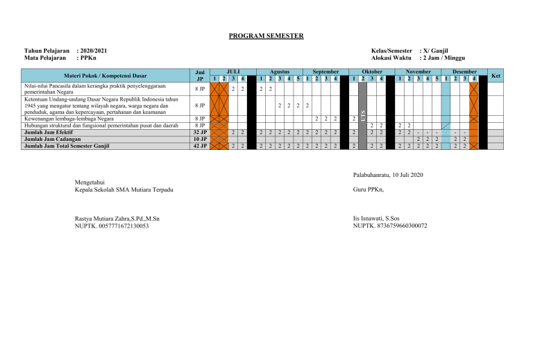 PROGRAM SEMESTER : 2020/2021 : PPKn Materi Pokok / Kompetensi Dasar Nilai-nilai Pancasila dalam kerangka praktik penyelenggaraan pemerintahan Negara Ketentuan Undang-undang Dasar Negara Republik Indonesia tahun 1945 yang mengatur tentang wilayah negara, warga negara dan penduduk, agama dan kepercayaan, pertahanan dan keamanan Kewenangan lembaga-lembaga Negara Hubungan struktural dan fungsional pemerintahan pusat dan daerah Jumlah Jam Efektif Jumlah Jam Cadangan Jumlah Jam Total Semester Ganjil Kelas/Semester Alokasi Waktu Jml JP 8 JP 1 2 JULI 3 4 2 2 1 Agustus 2 3 4 2 2 8 JP 8 JP 8 JP 32 JP 10 JP 42 JP 2 2 5 1 2 2 September 2 3 4 1 Oktober 2 3 4 UTS Tahun Pelajaran Mata Pelajaran 2 2 2 2 1 : X/ Ganjil : 2 Jam / Minggu November 2 3 4 5 2 2 2 2 2 2 2 2 2 2 2 2 2 2 2 2 2 2 2 2 2 2 2 2 2 2 2 2 2 2 2 2 2 2 2 2 2 2 2 2 Palabuhanratu, 10 Juli 2020 Mengetahui Kepala Sekolah SMA Mutiara Terpadu Guru PPKn, Rastya Mutiara Zahra,S.Pd.,M.Sn NUPTK. 0057771672130053 Iis Isnawati, S.Sos NUPTK. 8736759660300072 2 2 1 Desember 2 3 4 2 2 2 2 Ket PROGRAM SEMESTER : 2020/2021 : PPKn Materi Pokok / Kompetensi Dasar Faktor-faktor pembentuk integrasi nasional Indikator ancaman terhadap negara dan upaya penyelesaiannya di bidang Ideologi, politik, ekonomi, sosial, budaya, pertahanan, dan keamanan Arti pentingnya Wawasan Nusantara Jumlah Jam Efektif Jumlah Jam Cadangan Jumlah Jam Total Semester Genap Kelas/Semester Alokasi Waktu Jml JP 10 JP 1 Januari 2 3 4 2 2 2 5 2 1 2 6 JP 8 JP 24 JP 14 JP 38 JP Februari 2 3 4 2 2 2 1 2 2 2 2 2 2 2 2 2 2 2 2 2 2 2 2 2 2 2 2 Maret 3 4 UTS Tahun Pelajaran Mata Pelajaran 1 2 2 2 2 2 2 2 2 2 2 April 3 4 2 2 2 2 1 2 2 2 2 2 : X / Genap : 2 Jam / Minggu Mei 3 4 2 2 Palabuhanratu, 10 Juli 2020 Mengetahui Kepala Sekolah SMA Mutiara Terpadu Guru PPKn, Rastya Mutiara Zahra,S.Pd.,M.Sn NUPTK. 0057771672130053 Iis Isnawati, S.Sos NUPTK. 8736759660300072 5 1 2 2 2 2 2 Juni 3 4 Ket