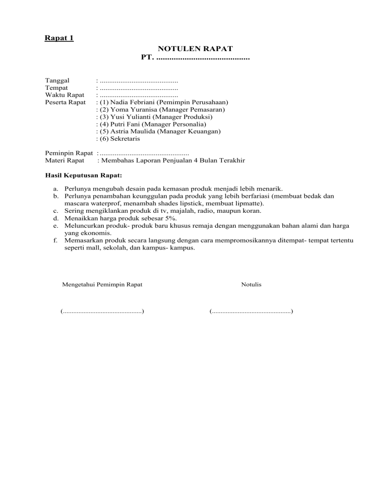 Rapat 1 NOTULEN RAPAT PT. ........................................... Tanggal Tempat Waktu Rapat Peserta Rapat : .......................................... : .......................................... : .......................................... : (1) Nadia Febriani (Pemimpin Perusahaan) : (2) Yoma Yuranisa (Manager Pemasaran) : (3) Yusi Yulianti (Manager Produksi) : (4) Putri Fani (Manager Personalia) : (5) Astria Maulida (Manager Keuangan) : (6) Sekretaris Peminpin Rapat : ................................................ Materi Rapat : Membahas Laporan Penjualan 4 Bulan Terakhir Hasil Keputusan Rapat: a. Perlunya mengubah desain pada kemasan produk menjadi lebih menarik. b. Perlunya penambahan keunggulan pada produk yang lebih berfariasi (membuat bedak dan mascara waterprof, menambah shades lipstick, membuat lipmatte). c. Sering mengiklankan produk di tv, majalah, radio, maupun koran. d. Menaikkan harga produk sebesar 5%. e. Meluncurkan produk- produk baru khusus remaja dengan menggunakan bahan alami dan harga yang ekonomis. f. Memasarkan produk secara langsung dengan cara mempromosikannya ditempat- tempat tertentu seperti mall, sekolah, dan kampus- kampus. Mengetahui Pemimpin Rapat Notulis (..............................................) (..............................................) Rapat 2 NOTULEN RAPAT PT. ........................................... Tanggal Tempat Waktu Rapat Peserta Rapat : .......................................... : .......................................... : .......................................... : (1) Sekretaris PT. INDONESIA PERSADA : (2) Bpk. Ali selaku Pimpinan PT. PELINDO : (3) Nola Ayu selaku Sekretaris PT. PELINDO Pemimpin Rapat : Anggi Mariatus Sholihah Materi Rapat : Kerjasama dalam bidang Pengolahan Pertambangan Minyak Mentah antara PT, INDONESIA PERSADA dengan PT, PELINDO, meliputi: 1. Managerial Sumber Daya Manusia 2. Pengelolaan serta Alokasi Modal 3. Pembagian Keuntungan serta Beban Resiko Kerugian Hasil Keputusan Rapat: 1) PT. PELINDO bersedia memberikan bantuan tenaga SDM kepada PT. INDONESIA PERSADA mengenai proyek kerjasama dalam pengelolaan minyak mentah. 2) Mengenai penanaman modal 65% dari PT INDONESIA PERSADA dan 35% dari PT. PELINDO. 3) Untuk pembagian keuntungan telah disepakati 60% untuk PT. INDONESIA PERSADA dan 40% untuk PT. PELINDO. Untuk masalah kerugian akan ditanggung oleh kedua belah pihak. Mengetahui Pemimpin Rapat Notulis (..............................................) (..............................................)