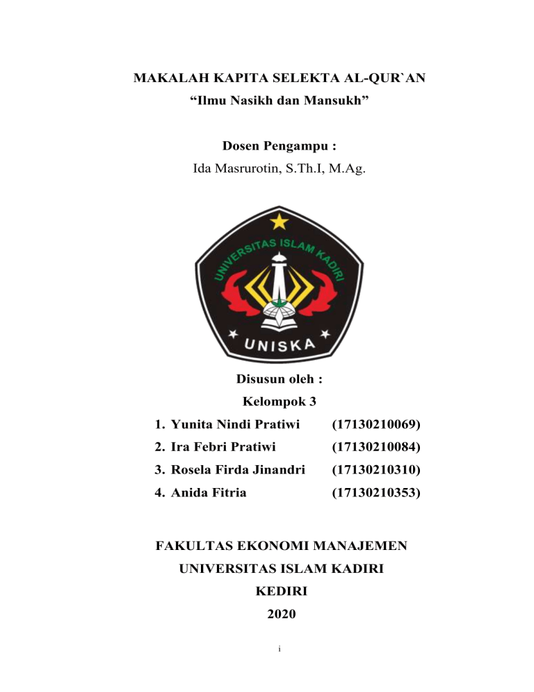 MAKALAH KAPITA SELEKTA AL-QUR`AN “Ilmu Nasikh dan Mansukh” Dosen Pengampu : Ida Masrurotin, S.Th.I, M.Ag. Disusun oleh : Kelompok 3 1. Yunita Nindi Pratiwi (17130210069) 2. Ira Febri Pratiwi (17130210084) 3. Rosela Firda Jinandri (17130210310) 4. Anida Fitria (17130210353) FAKULTAS EKONOMI MANAJEMEN UNIVERSITAS ISLAM KADIRI KEDIRI 2020 i KATA PENGANTAR Puji syukur kami panjatkan kehadirat Allah SWT, yang telah memberikan rahmat, taufik serta hidayah-Nya sehingga kami dapat menyelesaikan makalah kelompok kami yang berjudul “ILMU NASIKH DAN MANSUKH”. Tak lupa pula kami haturkan shalawat serta salam atas junjungan Nabi besar Muhammad SAW, yang telah membawa kita dari alam kegelapan menuju alam yang terang benderang . Kami menyusun makalah kami dari berbagai sumber seperti buku, literatur, internet, dll., yang kami tau semuanya itu jauh dari kata sempurna. Untuk itu kami mengharapkan kritik, saran dan masukkan guna untuk membuat makalah kami lebih sempurna lagi di tugas-tugas berikutnya. Demikian makalah ini kami buat, atas perhatiannya kami ucapkan terima kasih dan semoga makalah ini dapat bermanfaat bagi kita semua yang membacanya. Kediri, 16 Oktober 2020 Penulis Kelompok 3 i DAFTAR ISI KATA PENGANTAR ......................................................................................................... i DAFTAR ISI....................................................................................................................... ii BAB I .................................................................................................................................. 1 PENDAHULUAN .............................................................................................................. 1 1.1 Latar Belakang .................................................................................................... 1 1.2 Rumusan Masalah ............................................................................................... 1 1.3 Tujuan Makalah .................................................................................................. 1 BAB II................................................................................................................................. 2 PEMBAHASAN ................................................................................................................. 2 2.1 Pengertian Nasikh dan Mansukh......................................................................... 2 2.1.1 Pengertian Nasikh ....................................................................................... 2 2.1.2 Pengertian Mansukh.................................................................................... 3 2.2 Syarat-Syarat Terjadinya Nasikh ........................................................................ 3 2.3 Macam-Macam Naskh ........................................................................................ 4 2.4 Hikmah Naskh dan Mansukh dalam Al-Quran ................................................... 9 2.5 Contoh-Contoh Nasikh-Mansukh ..................................................................... 10 BAB III ............................................................................................................................. 16 PENUTUP ........................................................................................................................ 16 3.1 Kesimpulan ............................................................................................................. 16 3.2 Saran ........................................................................................................................ 16 DAFTAR PUSTAKA ....................................................................................................... 17 ii BAB I PENDAHULUAN 1.1 Latar Belakang Ilmu Nasikh wa Mansukh merupakan bagian penting dalam ilmu Alquran yang wajib diketahui oleh mujtahid. Mengatahui Nasikh wa Mansukh dalam Alquran dijadikan syarat yang harus dipenuhi mujtahid dalam menentukan hukum. Meskipun demikian, pendapat tentang konsep ini dalam ushul fiqih dan studi qur’an masih debatable dan menuai perbedaan pendapat di kalangan ulama. Kontroversi tentang teori naskh ini mencuat menjadi isu yang tak kunjung berakhir. Terdapat perbedaan pendapat antara ulama mutaqaddimin dan mutaakhirin dalam mendefinisikan nasakh secara terminologis. Perbedaan pendapat tersebut bersumber pada banyaknya pengertian nasakh secara etimologi. 1.2 Rumusan Masalah 1. Apa pengertian dari nasikh dan mansukh ? 2. Apa saja syarat terjadinya nasikh dan mansukh ? 3. Apa saja macam-macam naskh secara umum? 4. Apa saja hikmah Naskh dan Mansukh dalam Al-Quran? 5. Apa saja contoh-contoh nasikh dan mansukh? 1.3 Tujuan Makalah 1. Untuk mengetahui pengertian dari nasikh dan mansukh. 2. Untuk mengetahui apa syarat terjadinya nasikh dan mansukh. 3. Untuk mengetahui macam-macam naskh secara umum. 4. Untuk mengetahui macam-macam naskh dalam Al Qur’an. 5. Untuk mengetahui hikmah naskh dan mansukh dalam Al Qur’an. 6. Untuk mengetahui contoh-contoh nasikh dan masnsukh. 1 BAB II PEMBAHASAN 2.1 Pengertian Nasikh dan Mansukh 2.1.1 Pengertian Nasikh An naskh menurut bahasa arab mengarah kepada dua arti : Pertama memiliki arti “Izaalatu syai wa i’daamuhu” yaitu menghilangkan sesuatu dan meniadakannya atas dasar Allah SWT: َّ ن ْخ َ ُم ْ ُه َى َ ُه َُخ (Qs. Al-Hajj: 52) ي َسن َف ش َى ْق ُلي اَم َ َف َْ َف م ََّ َف مكُ َف اء َ َف ُ ُ َۦَه َّى Lafadz yansakhu dalam ayat diatas bermakna menghilangkan atau meniadakan bisikan-bisikan syaithan dan penyesatnya. Kedua memiliki arti “Naqlu al syay’I wa tahwiluhu ma’a baqaaihi fi nafsihi” yaitu menyalin dan memindahkan sesuatu yang tetap menjaga perkara yang disalin tersebut. Makna ini diambil dari penuturan ayat Al-Qur’an: ْ َم اَم ن (Qs. Al Jaatsiyah : 29) ي َا َسم اُنَم ن َف ْع َاس َ ْف ََ ْنَُقَ َف ُ ن