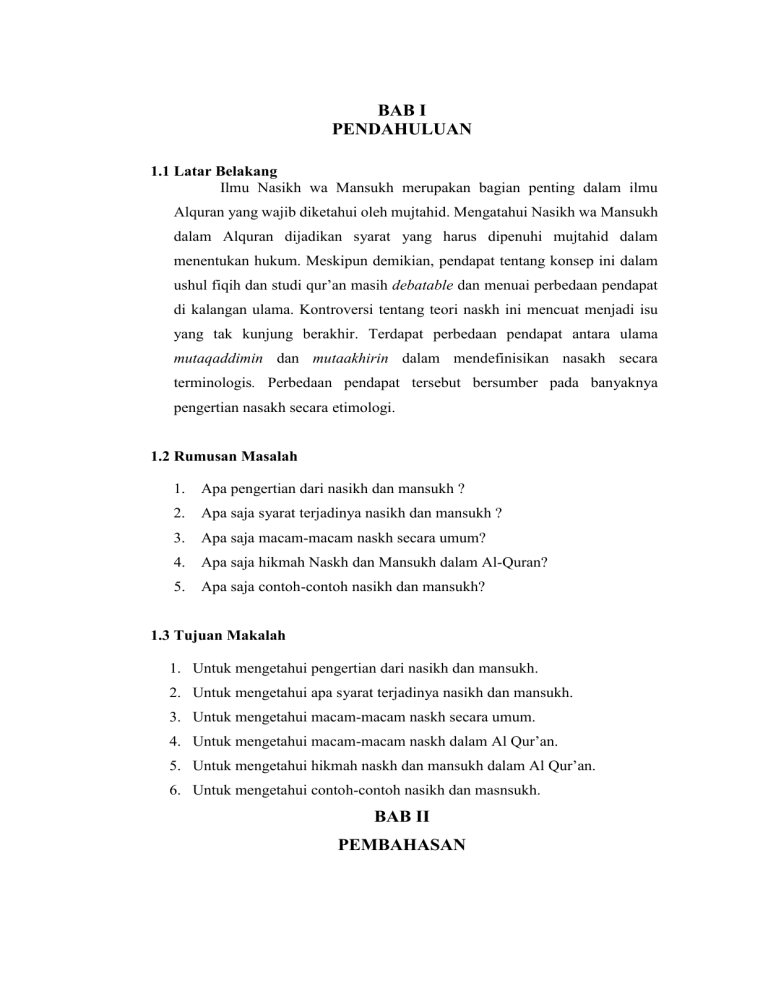 BAB I PENDAHULUAN 1.1 Latar Belakang Ilmu Nasikh wa Mansukh merupakan bagian penting dalam ilmu Alquran yang wajib diketahui oleh mujtahid. Mengatahui Nasikh wa Mansukh dalam Alquran dijadikan syarat yang harus dipenuhi mujtahid dalam menentukan hukum. Meskipun demikian, pendapat tentang konsep ini dalam ushul fiqih dan studi qur’an masih debatable dan menuai perbedaan pendapat di kalangan ulama. Kontroversi tentang teori naskh ini mencuat menjadi isu yang tak kunjung berakhir. Terdapat perbedaan pendapat antara ulama mutaqaddimin dan mutaakhirin dalam mendefinisikan nasakh secara terminologis. Perbedaan pendapat tersebut bersumber pada banyaknya pengertian nasakh secara etimologi. 1.2 Rumusan Masalah 1. Apa pengertian dari nasikh dan mansukh ? 2. Apa saja syarat terjadinya nasikh dan mansukh ? 3. Apa saja macam-macam naskh secara umum? 4. Apa saja hikmah Naskh dan Mansukh dalam Al-Quran? 5. Apa saja contoh-contoh nasikh dan mansukh? 1.3 Tujuan Makalah 1. Untuk mengetahui pengertian dari nasikh dan mansukh. 2. Untuk mengetahui apa syarat terjadinya nasikh dan mansukh. 3. Untuk mengetahui macam-macam naskh secara umum. 4. Untuk mengetahui macam-macam naskh dalam Al Qur’an. 5. Untuk mengetahui hikmah naskh dan mansukh dalam Al Qur’an. 6. Untuk mengetahui contoh-contoh nasikh dan masnsukh. BAB II PEMBAHASAN 2.1 Pengertian Nasikh dan Mansukh 2.1.1 Pengertian Nasikh An naskh menurut bahasa arab mengarah kepada dua arti : Pertama memiliki arti “Izaalatu syai wa i’daamuhu” yaitu menghilangkan sesuatu dan meniadakannya atas dasar Allah SWT: َّ ن ْخ َ ُم ْ ُه َى َ ُه َُخ (Qs. Al-Hajj: 52) ي َسن َف ش َى ْق ُلي اَم َ َف َْ َف م ََّ َف مكُ َف اء َ َف ُ ُ َۦَه َّى Lafadz yansakhu dalam ayat diatas bermakna menghilangkan atau meniadakan bisikan-bisikan syaithan dan penyesatnya. Kedua memiliki arti “Naqlu al syay’I wa tahwiluhu ma’a baqaaihi fi nafsihi” yaitu menyalin dan memindahkan sesuatu yang tetap menjaga perkara yang disalin tersebut. Makna ini diambil dari penuturan ayat Al-Qur’an: َ َََ ْنَُق ْ َم اَم ن (Qs. Al Jaatsiyah : 29) ي َا َسم اُنَم ن َف ْعف َاس َ ْف ُ ن َس Yaitu bermakna memindahkan amal-amal kalian ke dalam shuhuf (lembaranlembaran) Adapun al Zarkasyi berpendapat, An Naskh bisa diartikan ke dalam empat makna, yatu bermakna al Izalah (menghilangkan/menghapus) sesuai ayat Qs. Al Hajj: 52, at Tabdiil (mengganti) seperti dalam firman Allah SWT; “wa idza baddalnaa aayatan makaana aayatin” Qs. An Nahl: 101, bisa berarti at Tahwil (merubah), dan juga berarti an Naql (memindah). Sedangkan secara istilah, Ushuliyyun dan Fuqoha mendefinisikan an Naskh dengan arti “rof’u as syaari’ hukman syar’iyyan bi dalilin syar’iyyin mutaraakhin ‘anhu” yaitu pengangkatan (penghapusan) oleh as Syaari’ (Allah Swt) terhadap hukum syara’ (yang lampau) dengan dalil syara’ yang terbaru. Yang dimaksud dengan pengangkatan hukum syara’ adalah penghapusan kontinuitas pengamalan hukum tersebut dengan mengamalkan hukum yang ditetapkan terakhir. 2.1.2 Pengertian Mansukh Pengertian mansukh menurut bahasa berarti sesuatu yang dihapus/dihilangkan/dipindah ataupun disalin/dinukil. Sedangkan menurut istilah para ulama’, mansukh ialah hukum syara’ yang diambil dari dalil syara’ yang pertama, yang belum diubah dengan dibatalkan dan diganti dengan hukum dari dalil syara’ baru yang datang kemudian. Tegasnya, dalam mansukh itu adalah berupa ketentuan hukum syara’ pertama yang telah diubah dan diganti dengan yang baru, karena adanya situasi dan kondisi yang menghendaki perubahan dan penggantian hukum.1 2.2 Syarat-Syarat Terjadinya Nasikh Dari pengertian diatas bisa disimpulkan bahwa terjadinya naskh harus memenuhi beberapa syarat: 1. Hukum yang di-naskh harus bersifat hukum syar’i 2. Dalil yang berfungsi menghapus hukum berupa khitab syar’i (wahyu ilahi) yang muncul lebih akhir dari pada khitab yang di-naskh hukumnya. 3. Khitab yang dihapus hukumnya tidak dibatasi oleh waktu tertentu. Apabila dibatasi waktu maka hukum tersebut terhapus dengan habis masa waktunya dan tidak dianggap sebagai naskh. Sebagian ulama ada yang memperluas syarat-syarat terjadinya naskh menjadi beberapa poin yaitu: 1. Hukum yang terkandung pada nasikh bertentangan dengan hukum pada mansukh. 2. Yang mansukh harus lebih awal dari Nasikh. 3. Hukum yang di-nasakh mesti hal-hal yang menyangkut dengan perintah, larangan, dan hukuman. 4. Hukum yang di-nasakh tidak terbatas waktu tertentu, mesti berlaku sepanjang waktu. 5. Hukum yang terkandung dalam mansukh telah ditetapkan sebelum munculnya nasikh. 6. Status nash nasikh mesti sama dengan nash mansukh. Maka nash yang zhanni tidak bisa menasakh-kan yang qath’i. Tentu tidak sah pula dalil yang besifat 1 Abdul Djalal. Ulumul Qur’an (Surabaya: Dunia Ilmu, 2012), hal. 122 ahad untuk me-nasakh-kan dalil yang mutawatir. Dari situ diketahui bahwa hanya terjadi pada Amr (perintah) dan Nahyi (larangan), baik secara shorih (jelas) dalam perintah ataupun dengan lafadz khabar (berita) yang mengandung makna perintah dan larangandengan syarat tidak berhubungan dengan urusan. 2.3 Macam-Macam Naskh Secara Umum An Naskh terbagi menjadi empat bagian yaitu: 1. Nasakh Al-Qur’an dengan Al-Qur’an Nasakh yang pertama ini telah disepakati oleh seluruh orang yang menyetujui nasakh mengenai kebolehannya.2 Contohnya, kasus hukum iddah (masa tenggang) bagi seorang janda yang semula satu tahun, tertera pada Qs. Al- Baqarah:240 berikut: ۡ َاِوصي َّٗة ِِّل َ ۡز َٰ َوجهمِ َّم َٰت َ ًعاِإل ٖۚ ىِٱل َح ۡولِغ َۡي َرِإ ۡخ َر ٢٤٠ِاج َ ِو َيذَ ُرونَ ِأ َ ۡز َٰ َو ٗج َ َوٱلَّذِينَ ِيُت ََوفَّ ۡونَ ِمن ُك ۡم Dan orang-orang yang akan meninggal dunia di antara kamu dan meninggalkan isteri, hendaklah berwasiat untuk isteri-isterinya, (yaitu) diberi nafkah h