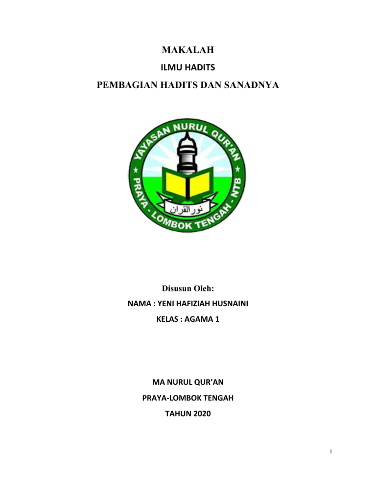 MAKALAH ILMU HADITS PEMBAGIAN HADITS DAN SANADNYA Disusun Oleh: NAMA : YENI HAFIZIAH HUSNAINI KELAS : AGAMA 1 MA NURUL QUR’AN PRAYA-LOMBOK TENGAH TAHUN 2020 i KATA PENGANTAR Assalamu’alaikum. Wr. Wb. Puji syukur kami ucapkan kepada Allah Swt, yang telah memberikan rahmatnya kepada kami sehingga kami dapat menyelesaikan tugas ini. Tidak lupa pula kami kami ucapkan kepada junjungan kami nabi Muhammad Saw. Yang telah memberikan pelajaran kepada kita semua sebagai umat Islam. Dan trimakasih kepada seluruh pihak-pihak yang telah membantu dan mendukung kami dalam menyelesaikan tugas ini sehingga dapat akhir yang cukup memuaskan. Inilah usaha keras kami, kami harap dapat bemanfaat bagi pembaca umumnya dan bagi kami khususnya. Akhir kata kami ucapkan banyak terimakasih dan mohon maaf yang sebesarbesarnya. Semoga bermanfaat. Amiiin. Wassalamu’alaikum. Wr. Wb. Penulis ii DAFTAR ISI HALAMAN JUDUL ................................................................................. ............................. i KATA PENGANTAR.................................................................................... ........................ ii DAFTAR ISI................................................................................................... ......................... iii BAB I PENDAHULUAN A. Latar Belakang................................................................................. .............................. 1 B. Rumusan Masalah............................................................................ .............................. 1 BAB II PEMBAHASAN A. Klasifikasi Hadits Ditinjau Dari Bentuk Asal................................. ................................ 2 B. Klasifikasi Hadits Ditinjau Dari Sifat Asal..................................... ................................ 4 C. Hadits Berdasarkan Kwantitas Sanad Dan Perawinya................... ................................. 5 D. Hadits Berdasarkan Kwalitas Sanad............................................... ............................... 7 E. Maqbul Dan Maqdud....................................................................... ................................ 9 F. Berdasarkan Penisbatannya (Sumber Hadits).................................. ............................... 11 BAB III PENUTUP A. Kesimpulan...................................................................................... ............................... 13 B. Saran................................................................................................ ................................ 14 DAFTAR PUSTAKA.................................................................................... ..................... 17 iii BAB I PENDAHULUAN A. LATAR BELAKANG Di dalam mengklasifikasikan hadîts, ulama hadîts berbeda-beda di dalam menetapkan jumlah macam-macam hadîts. Ibn Taimiyah mengungkapkan, “secara umum, berdasarkan keadaan Perawi dan keadaan matan hadits sangat banyak macamnya. Menurut Imam Al-Nawâwiy pembagian hadîts mencapai 65 macam, menurut Al-Suyûtiy pembagian hadîts mencapai 82 macam, menurut Ibn Katsîr sebanyak 65 macam dan Abu Fadhl al-Jizâwiy –di dalam kitab AlTuras- membaginya menjadi 63 macam. Hal ini terjadi karena mereka melihat klasifikasinya secara umum, dengan tidak melihat dan menggunakan tipologi yang jelas. Untuk memudahkan pemahaman dan pengenalan hadîts nabi beserta istilah-istilah yang terkait dengannya, maka pemakalah akan menjabarkannya di dalam makalah singkat yang berjudul “Klasifiksi Hadîts Ditinjau Dari Berbagai Aspek”. Pembahasannya meliputi: Pembagian hadîts berdasarkan bentuk asal, pembagian hadîts berdasarkan sifat asal, pembagian hadîts berdasarkan Jumlah periwayat, pembagian hadîts berdasarkan kwalitas serta pembagian hadîts berdasarkan penisbatan. B. RUMUSAN MASALAH 1. Bagaimana Klasifikasi Hadits Ditinjau Dari Bentuk Asalnya? 2. Bagaimana Klasifikasi Hadits Ditinjau Dari Sifat Asalnya? 3. Bagaimana Klasifikasi Hadits Berdasarkan Kwantitas Sanad Dan Perawinya? 4. Bagaimana Klasifikasi Hadits Berdasarkan Kwalitas Sanadnya? 5. Apa yang dimaksud dengan Maqbul Dan Maqdud 6. Bagaimana Klasifikasi Berdasarkan Penisbatannya (Sumber Hadits)? 1 BAB II PEMBAHASAN Hadits dapat diklasifikasi menjadi : A. KLASIFIKASI HADITS DITINJAU DARI BENTUK ASAL Ulama hadits mendefinisikan hadits secara bahasa dengan ( ال جدي دyang baru) dengan lawannya ( ال قدي مlama) dan secara umum yang dimaksud dengannya adalah segala perkataan Nabi SAW yang dinukilkan dan disampaikan oleh manusia baik dari segi mendengar atau segi wahyu dalam keadaan terjaga atau pun tidur. Sedangkan menurut istilah segala sesuatu yang disandarkan kepada Nabi SAW berupa perkataan, perbuatan, ketetapan dan sifat. Didalam buku Manhaj Naqd fi ulumil hadits, Nuruddin Ithr mendefinisikan bahwa hadits segala sesuatu yang disandarkan kepada Nabi SAW berupa perkataan, perbuatan, ketetapan, sifat kholqiyyah (penciptaan), Khuluqiyyah (Akhlak) atau apa saja yang disandarkan kepada para sahabat dan tabi’in.[1] Diantara contoh hadits yang menggambarkan akhlak Nabi adalah هللا ص لى هللا ع ل يه و س لم أ جود ل نا سا و ك ان ر سول ك ان ودل نا ساأج ف ى رم ضان “Adalah Rasulullah itu manusia yang penyantun dan lebih penyantun lagi dibulan ramadhan” dan contoh yang menggambarkan Nabi seorang manusia ciptaan Allah SWT و ال ب ال ق ص ير, ل يس ب ال طوي ل ا ل بائ ن, وأح س نه خ ل قا,ال لهر سول ص لى هللا ع ل يه و س لم ح س نأ ال ناس ك ان وجها “Adalah Rasulullah manusia yang paling baik/indah wajahnya, paling mulia akhlaknya, tidak terlalu tinggi dan tidak pula terlalu pendek”. a. Hadits Qouli Hadits Qouli adalah semua ucapan Nabi SAW yang disampaikan dalam berbagai macam tempat dan kesempatan, dan ulama ushul fiqh juga mendefinisikan hadits Qouli dengan defenisi yang sama.[2] 2 Contoh hadits yang menggambarkan perkataan Nabi SAW: