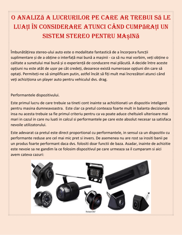 O analiză a lucrurilOr pe care ar trebui să le luați în cOnsiderare atunci când cumpărați un sistem stereO pentru mașină Îmbunătățirea stereo-ului auto este o modalitate fantastică de a încorpora funcții suplimentare și de a obține o interfață mai bună a mașinii - ca să nu mai vorbim, veți obține o calitate a sunetului mai bună și o experiență de conducere mai plăcută. A decide între aceste opțiuni nu este atât de ușor pe cât credeți, deoarece există numeroase opțiuni din care să optați. Permiteți-ne să simplificam putin, astfel încât să fiți mult mai încrezători atunci când veți achiziționa un player auto pentru vehiculul dvs. drag. Performantele dispozitivului. Este primul lucru de care trebuie sa tineti cont inainte sa achizitionati un dispozitiv inteligent pentru masina dumneavoastra. Este clar ca pretul conteaza foarte mult in balanta decizionala insa nu acesta trebuie sa fie primul criteriu pentru ca va poate aduce cheltuieli ulterioare mai mari in cazul in care nu luati in calcul si performantele pe care este absolut necesar sa satisfaca nevoile utilizatorului. Este adevarat ca pretul este direct proportional cu performantele, in sensul ca un dispozitiv cu performante reduse are cel mai mic pret si invers. De asemenea nu are rost sa irositi banii pe un produs foarte performant daca dvs. folositi doar functii de baza. Asadar, inainte de achizitie este nevoie sa ne gandim la ce folosim dispozitivul pe care urmeaza sa il cumparam si aici avem cateva cazuri: - Vreau un aparat pe care sa pot instala o camera de marsarier, navigatie passat b7 sa ascult radio, sa am Bluetooth, sa pot rula muzica sau filme de pe un stick, atunci recomandarea ar fi sa achizitionati un MP5 Player fara Android. - Am nevoie sa pot rula muzica de pe stick, sa rulez programul de navigatie, sa redau un DVD, sa instalez o camera marsarier, Bluetooth si sa ma pot conecta la internet deci nu am nevoie de un processor foarte puternic sau de memorie RAM mare cu atat mai putin de o memorie interna mare. O unitate cu processor Quad Core(entry level) 16GB memorie interna, 1/2GB RAM este recomandata. - In cazul in care pretentiile cresc si doriti ca unitatea sa ruleze mai multe programe in acelasi timp la o viteza decenta sau vreti sa instalati numeroase aplicatii din Android Marketplace cum ar fi Spotify, waze, youtube etc atunci va recomandam o configuratie mai puternica processor PX5 sau PX6 cu 4GB RAM si 32/64GB memorie interna. Surse audio Primul și cel mai important lucru pe care ar trebui să-l observați înainte de a investi într-un sistem stereo pentru mașină este să vă asigurați că suportă tot felul de formate de redare. În aceste zile există diferite formate în care fișierele audio pot fi codate. În general, sistem navigatie auto calitatea fișierului audio depinde de tipul de format. În timp ce formatele precum MP3 și AAC oferă o calitate obișnuită, alte forme precum ALAC, WAV și FLAC etc. oferă o rezoluție înaltă, o calitate a sunetului mai bună. Prin urmare, asigurați-vă că sunetul auto pentru care alegeți acceptă toate formatele de redare. De asemenea, trebuie să vă asigurați că sistemul stereo al mașinii dvs. găzduiește toate tipurile diferite de surse audio, de exemplu, un CD / DVD, radio, USB, AUX, Bluetooth, card SD sau smartphone. Integrarea aplicațiilor și a smartphone-urilor În aceste zile, majoritatea oamenilor caută o unitate care poate fi asociată cu smartphone-ul lor și poate funcționa sincronizat cu acesta. Unul dintre cele mai mari suplimente din tehnologie în ultima perioadă este integrarea smartphone-urilor cu Apple Car Play și Android auto. Acest lucru simplifică mult conducerea și vă permite să vă gestionați cu ușurință smartphone-ul prin unitatea principală pentru o experiență de conducere mult mai placuta și mai sigură. Există mai multe mărci care să lanseze această tehnologie revoluționară și aceste mărci se concentrează acum pe preluarea wireless Apple Car Play și Wireless Android Mirroring pentru a duce lucrurile la nivelul următor. Navigare GPS Un sistem de navigație GPS vă asigură că vă aflați pe calea cea bună ori de câte ori vă aflați într-o zonă nouă cu care nu sunteți familiarizați. Vă permite să navigați la destinație fără a fi nevoie să vă opriți la fiecare colț de stradă și să solicitați indicații de orientare unui localnic. Multe aparate de pe piața sunt dotate cu sisteme GPS integrate, cum ar fi navigatia Opel Astra h sau navigatia vw b7 și nu trebuie să cheltuiți bani suplimentari pentru asta functie. Cu o nouă tehnologie de integrare a smartphone-urilor, puteți utiliza cu ușurință navigația GPS si pe navigatia originala a mașinii fara a mai fi nevoie sa o inlocuiti. Dimensiuni fizice și comenzi. În unele cazuri, un aparat 1Din sau unul 2DIN poate fi un înlocuitor direct pentru vehiculul dvs., în timp ce în alte cazuri este posibil să aveți nevoie de un kit de bord specific vehiculului pentru a permite instalarea perfectă. Uneori se întâmplă să fie nevoie să modificati conexiunile originale si de aceea este recomandat sa apelati la un service profesionist pentru realizarea montajului. In multe din cazuri insa conexiunile produselor se potrivesc perfect si nu este necesara nici o modificare pentru a integra noul dispozitiv in bordul masinii. Nu contează dacă aveți necesitati legate de serviciu de care trebuie să vă ocupați sau doriți doar să vă relaxați și să vă bucurați de un film sau un serial TV sau dacă doriți să instalati o platforma de învățare online ușoară pentru copiii dvs. Puteți îndeplini toate sarcinile cu un singur dispozitiv simplu.