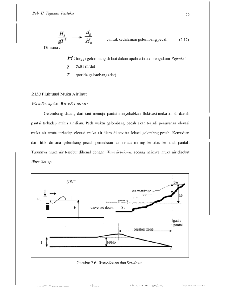 Bab II Tinjauan Pustaka 22 ; untuk kedalainan gelombang pecah (2.17) Dimana : H :tinggi gelombang di laut dalam apabila tidak mengalami Refraksi g : 9,81 m/det T :peride gelombang (det) 2.1.3.3 Fluktuasi Muka Air Iaut Wave Set-up dan Wave Set-down · Gelombang datang dari taut menuju pantai menyebabkan fluktuasi muka air di daerah pantai terhadap muk:a air diam. Pada waktu gelombang pecah akan terjadi penurunan elevasi muka air rerata terhadap elevasi muka air diam di sekitar lokasi gelombng pecah. Kemudian dari titik dimana gelombang pecah pennukaan air rerata miring ke atas ke arah pantaL Turunnya muka air tersebut dikenal dengan Wave Set-down, sedang naiknya muka air disebut Wave Set-up. I .I S.W.L wave set-up .......... Ho i h ................ ... . .········ .... .............rr:::::.·::... ......... ....................... wave set-down ! Sb ! igaris Gambar 2.6. Wave Set-up dan Set-down . ...... ...· -- ·--,.., .. .. .....,........... ·1· -- - ··· ···· ····-·-····-:··-···········:·1 ··-. -··-·· r --::-- -·-· ····-·· - ---·-···-···