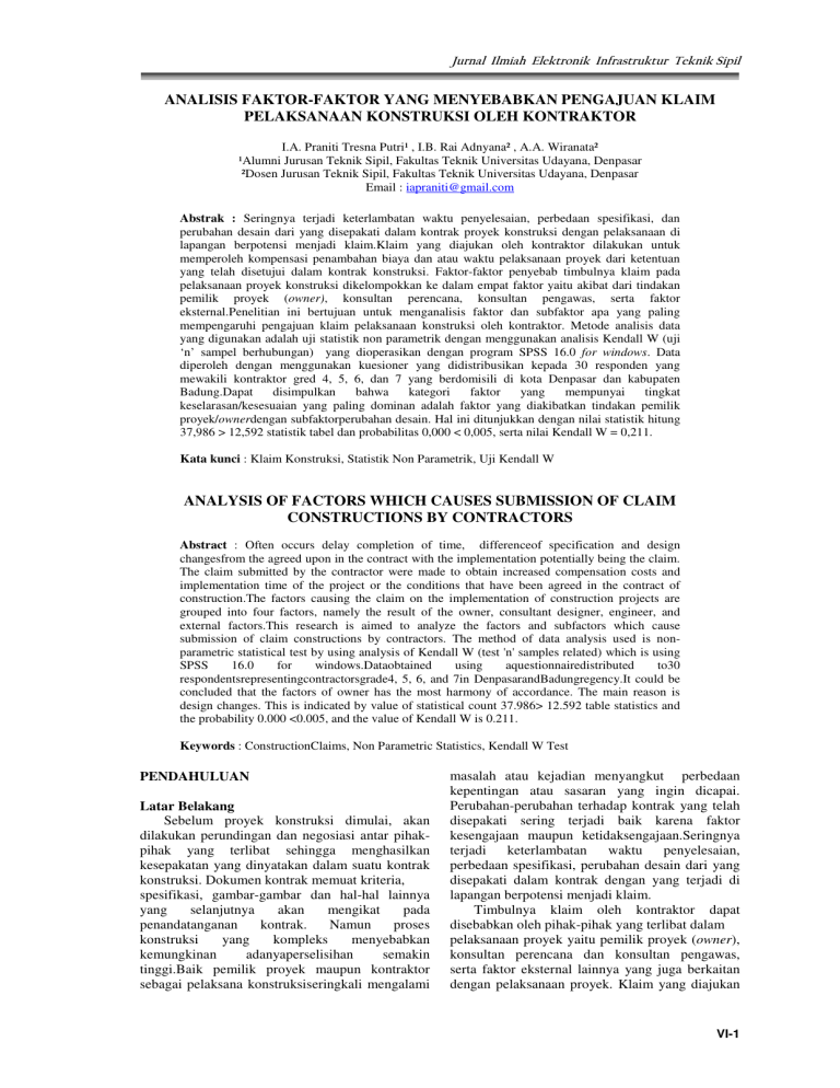 Jurnal Ilmiah Elektronik Infrastruktur Teknik Sipil ANALISIS FAKTOR-FAKTOR YANG MENYEBABKAN PENGAJUAN KLAIM PELAKSANAAN KONSTRUKSI OLEH KONTRAKTOR I.A. Praniti Tresna Putri¹ , I.B. Rai Adnyana² , A.A. Wiranata² ¹Alumni Jurusan Teknik Sipil, Fakultas Teknik Universitas Udayana, Denpasar ²Dosen Jurusan Teknik Sipil, Fakultas Teknik Universitas Udayana, Denpasar Email : [email protected] Abstrak : Seringnya terjadi keterlambatan waktu penyelesaian, perbedaan spesifikasi, dan perubahan desain dari yang disepakati dalam kontrak proyek konstruksi dengan pelaksanaan di lapangan berpotensi menjadi klaim.Klaim yang diajukan oleh kontraktor dilakukan untuk memperoleh kompensasi penambahan biaya dan atau waktu pelaksanaan proyek dari ketentuan yang telah disetujui dalam kontrak konstruksi. Faktor-faktor penyebab timbulnya klaim pada pelaksanaan proyek konstruksi dikelompokkan ke dalam empat faktor yaitu akibat dari tindakan pemilik proyek (owner), konsultan perencana, konsultan pengawas, serta faktor eksternal.Penelitian ini bertujuan untuk menganalisis faktor dan subfaktor apa yang paling mempengaruhi pengajuan klaim pelaksanaan konstruksi oleh kontraktor. Metode analisis data yang digunakan adalah uji statistik non parametrik dengan menggunakan analisis Kendall W (uji ‘n’ sampel berhubungan) yang dioperasikan dengan program SPSS 16.0 for windows. Data diperoleh dengan menggunakan kuesioner yang didistribusikan kepada 30 responden yang mewakili kontraktor gred 4, 5, 6, dan 7 yang berdomisili di kota Denpasar dan kabupaten Badung.Dapat disimpulkan bahwa kategori faktor yang mempunyai tingkat keselarasan/kesesuaian yang paling dominan adalah faktor yang diakibatkan tindakan pemilik proyek/ownerdengan subfaktorperubahan desain. Hal ini ditunjukkan dengan nilai statistik hitung 37,986 > 12,592 statistik tabel dan probabilitas 0,000 < 0,005, serta nilai Kendall W = 0,211. Kata kunci : Klaim Konstruksi, Statistik Non Parametrik, Uji Kendall W ANALYSIS OF FACTORS WHICH CAUSES SUBMISSION OF CLAIM CONSTRUCTIONS BY CONTRACTORS Abstract : Often occurs delay completion of time, differenceof specification and design changesfrom the agreed upon in the contract with the implementation potentially being the claim. The claim submitted by the contractor were made to obtain increased compensation costs and implementation time of the project or the conditions that have been agreed in the contract of construction.The factors causing the claim on the implementation of construction projects are grouped into four factors, namely the result of the owner, consultant designer, engineer, and external factors.This research is aimed to analyze the factors and subfactors which cause submission of claim constructions by contractors. The method of data analysis used is nonparametric statistical test by using analysis of Kendall W (test 'n' samples related) which is using SPSS 16.0 for windows.Dataobtained using aquestionnairedistributed to30 respondentsrepresentingcontractorsgrade4, 5, 6, and 7in DenpasarandBadungregency.It could be concluded that the factors of owner has the most harmony of accordance. The main reason is design changes. This is indicated by value of statistical count 37.986> 12.592 table statistics and the probability 0.000 <0.005, and the value of Kendall W is 0.211. Keywords : ConstructionClaims, Non Parametric Statistics, Kendall W Test PENDAHULUAN Latar Belakang Sebelum proyek konstruksi dimulai, akan dilakukan perundingan dan negosiasi antar pihakpihak yang terlibat sehingga menghasilkan kesepakatan yang dinyatakan dalam suatu kontrak konstruksi. Dokumen kontrak memuat kriteria, spesifikasi, gambar-gambar dan hal-hal lainnya yang selanjutnya akan mengikat pada penandatanganan kontrak. Namun proses konstruksi yang kompleks menyebabkan kemungkinan adanyaperselisihan semakin tinggi.Baik pemilik proyek maupun kontraktor sebagai pelaksana konstruksiseringkali mengalami masalah atau kejadian menyangkut perbedaan kepentingan atau sasaran yang ingin dicapai. Perubahan-perubahan terhadap kontrak yang telah disepakati sering terjadi baik karena faktor kesengajaan maupun ketidaksengajaan.Seringnya terjadi keterlambatan waktu penyelesaian, perbedaan spesifikasi, perubahan desain dari yang disepakati dalam kontrak dengan yang terjadi di lapangan berpotensi menjadi klaim. Timbulnya klaim oleh kontraktor dapat disebabkan oleh pihak-pihak yang terlibat dalam pelaksanaan proyek yaitu pemilik proyek (owner), konsultan perencana dan konsultan pengawas, serta faktor eksternal lainnya yang juga berkaitan dengan pelaksanaan proyek. Klaim yang diajukan VI-1 Analisis Faktor-Faktor yang Menyebabkan Pengajuan Klaim ………………. (Putri, Adnyana, dan Wiranata) yaitu berupa permintaan kompensasi tambahan biaya dan atau waktu.Kompensasi tersebut diminta untuk meraih kembali kerugian yang dialami kontraktor akibat penambahan biaya dan atau waktu pelaksanaan proyek.Jika tidak diselesaikan sedini mungkin, klaim ini mempunyai kecenderungan menjadi perselisihan dan berdampak pada penurunan kinerja terhadap biaya dan atau waktu pelaksanaan proyek secara keseluruhan. Oleh karena itu, sangatlah penting bagi kontraktor untuk menganalisis faktor-faktor apa saja yang menyebabkan timbulnya klaim. MATERI Pihak-Pihak yang Terlibat dalam Kontrak Konstruksi Pihak-pihak yang terlibat dalam proyek konstruksi dari tahap perencanaan sampai pelaksanaan dapat dikelompokan menjadi (Ervianto, 2005): 1. Pemilik Proyek Yaitu badan yang memiliki proyek dan memberikan pekerjaan atau menyuruh memberikan pekerjaan kepada pihak penyedia jasa dan yang membayar biaya pekerjaan tersebut.Pengguna jasa dapat berupa perseorangan, badan/lembaga/instansi pemerintah maupun swasta. 2. Konsultan Yaitu pihak/badan yang disebut konsultan dapat dibedakan menjadi dua, yaitu konsultan perencana dan konsultan pengawas. a. Konsultan Perencana Adalah orang/badan yang membuat perencanaan bangunan secara lengkap baik bidang arsitektur, sipil dan bidang lain yang melekat e