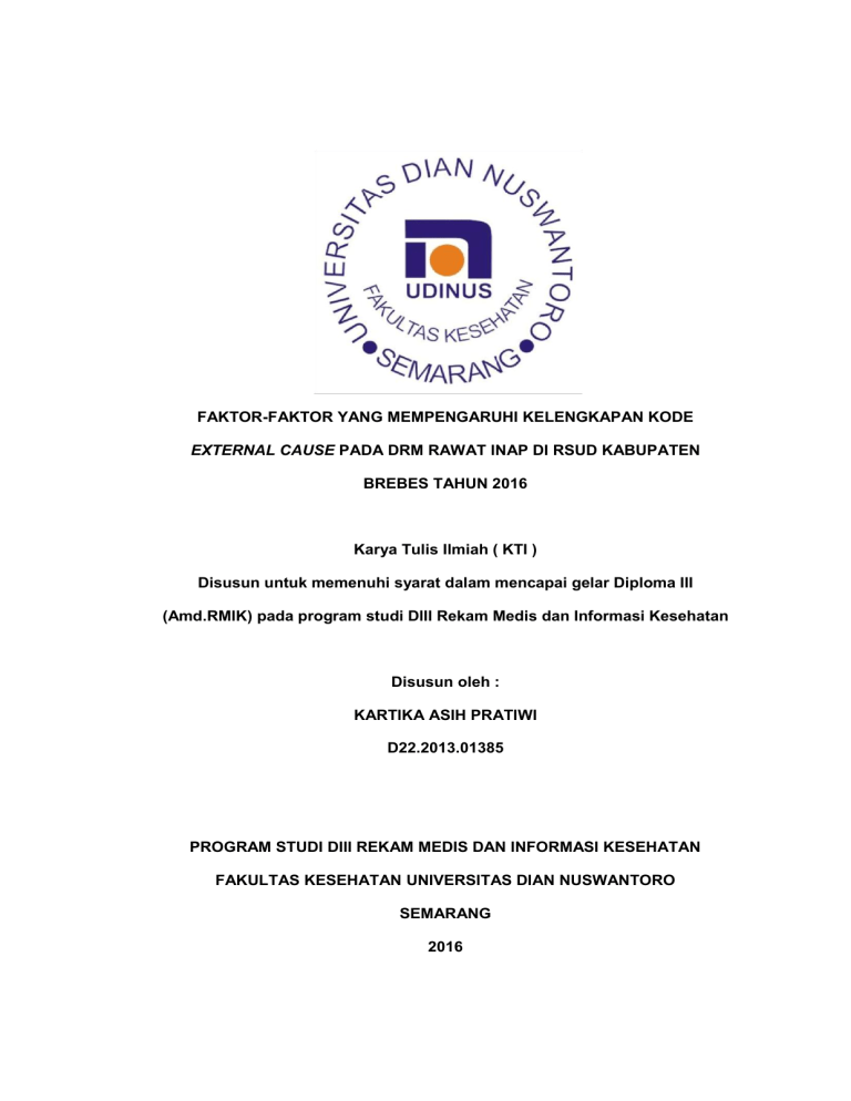 FAKTOR-FAKTOR YANG MEMPENGARUHI KELENGKAPAN KODE EXTERNAL CAUSE PADA DRM RAWAT INAP DI RSUD KABUPATEN BREBES TAHUN 2016 Karya Tulis Ilmiah ( KTI ) Disusun untuk memenuhi syarat dalam mencapai gelar Diploma III (Amd.RMIK) pada program studi DIII Rekam Medis dan Informasi Kesehatan Disusun oleh : KARTIKA ASIH PRATIWI D22.2013.01385 PROGRAM STUDI DIII REKAM MEDIS DAN INFORMASI KESEHATAN FAKULTAS KESEHATAN UNIVERSITAS DIAN NUSWANTORO SEMARANG 2016 HALAMAN HAK CIPTA © 2016 Hak Cipta Karya Tulis Ilmiah Ada Pada Penulis HALAMAN PERSEMBAHAN Alhamdullillah . . . Segala puji syukur kupanjatkan kepada Allah SWT karena tanpa Kehendak dan Ridho-NYA tugas akhir ini tidak akan selesai dengan baik Kepada Mamah ( Tuti Hidayati ) dan Bapak ( Dustam Maskendar ) Tercinta yang tak pernah behenti memanjatkan doa disetiap hembusan nafasnya, serta tak kenal lelah berjuang menyekolahkan anak-anaknya Adikku Puteri Intan Pratiwi, Syiffa Rellya Hakim dan Gugah Razaka Hakim yang selalu menjadi obat penghibur setiap hari Mbah Ayi, Mbah Rembet yang sabar menunggu kelulusanku dan melihat wisuda Cece Eyo, Aa Takib, Uwa Uji, Bude Titi yang ikut membantu orang tuaku untuk menguliahkan aku Pembimbingku Bu Dyah yang selalu memberikan kemudahan dan arahan dalam pembuatan KTI ini dan teman seperjuangan bimbingan. Ari Sulistiyo ku tersayang dan My Biggest Motivator Kakak Sanis Rismawati disana yang juga selalu hadir di BBM dan telepon untuk menyemangati Sandi Ari Wibowo, Septi Mahfuroh, Oktania Pratiwi pendamping super sabar dan sayang yang bantu dan temenin kemana-mana dan ngehibur saat lelah melanda Pasukan Nakula Raya 4 “ Wiwit, Hera, Desi, Yosi, Elma, Juntet, Rini, Nita“ dan TikaWe yang juga sering muncul dikos . . . the best kalian semua 2 tahun sama-sama RIWAYAT HIDUP Nama : Kartika Asih Pratiwi Tempat, Tanggal Lahir : Brebes, 08 Desember 1994 Jenis Kelamin : Perempuan Agama : Islam Alamat : Perum Taman Indo Jalan Mangga I B5/2 Rt005/Rw006, Kaligangsa Wetan, Brebes Riwayat Pendidikan 1. TK Aisyiyah Bustanul Athfal Abepura Jayapura, tahun 2000 2. SD Negeri 02 Brebes, tahun 2004 3. SMP Negeri 02 Brebes, tahun 2007 4. SMA Negeri 1 Tegal, tahun 2010 5. Diterima di Program Studi DIII Rekam Medis dan Informasi Kesehatan Universitas Dian Nuswantoro Semarang tahun 2013 KATA PENGANTAR Puji syukur kami penulis panjatkan kehadirat Allah SWT karena atas berkah rahmat dan hidayah-NYA sehingga penulis mampu menyelesaikan Karya Tulis Ilmiah yang berjudul “Faktor-Faktor Yang Mempengaruhi Kelengkapan Kode External Cause Pada DRM Rawat Inap Di Rsud Kabupaten Brebes Tahun 2016 “. Karya Tulis Ilmiah ini disusun guna sebagai salah satu syarat menyelesaikan program pendidikan Diploma III Rekam Medis dan Informasi Kesehatan Fakultas Kesehatan Universitas Dian Nuswantoro Semarang. Penulis menyadari Karya Tulis Ilmiah ini tidak akan berjalan dengan lancar tanpa bantuan dan dukungan dari berbagai pihak. Pada kesempatan ini penulis ingin menyampaikan terima kasih kepada pihak-pihak yang telah membantu dalam penyelesaian Karya Tulis Ilmiah ini. Ucapan terima kasih ini penulis berikan kepada : 1. Dr. dr. Sri Andarini Indreswari, M.Kes selaku Dekan Fakultas Kesehatan Universitas Dian Nuswantoro Semarang. 2. Arif Kurniadi, S.Kom selaku Ketua Program Studi D3 Rekam Medis dan Informasi Kesehatan Universitas Dian Nuswantoro Semarang. 3. Drg. OO Suprana M.Kes selaku Direktur RSUD Brebes. 4. Indra Gunawan, Amd.PK, S.KM selaku kepala bagian Rekam Medis. 5. Dyah Ernawati, S.Kep, Ners, MKes sebagai dosen pembimbing Karya Tulis Ilmiah. 6. Segenap staf Rekam Medis RSUD Brebes dan semua pihak yang telah membantu baik secara langsung maupun tidak langsung dalam penyusunan laporan praktik ini. Dalam pembuatan laporan ini, penulis menyadari bahwa Karya Tulis Ilmiah ini masih banyak terdapat kekurangan dan jauh dari kesempurnaan. Oleh karena itu, penulis berharap pembaca dapat memberikan kritik dan saran yang baik dan bersifat membangun agar penulisan ini dapat menjadi lebih baik lagi. Semarang, Juli 2016 Penulis Program Studi DIII Rekam Medis dan Informasi Kesehatan Fakultas Kesehatan Universitas Dian Nuswantoro Semarang 2016 ABSTRAK KARTIKA ASIH PRATIWI FAKTOR-FAKTOR YANG MEMPENGARUHI KELENGKAPAN KODE EXTERNAL CAUSE PADA DOKUMEN REKAM MEDIS RAWAT INAP DI RSUD KABUPATEN BREBES TAHUN 2016 xviii + 73 hal + 10 tabel + 5 gambar + 9 lampiran Kode external cause (penyebab luar) adalah kodefikasi penyakit yang harus disertakan pada dokumen rekam medis pasien dengan diagnosa cedera, keracunan, dan kecelakaan. Oleh karena itu petugas rekam medis harus menguasai cara pengkodean penyakit sesuai dengan kaidah ICD-10. Petugas rekam medis dituntut untuk dapat memberikan kode yang akurat. Maka dari itu pengetahuan yang baik harus dimiliki petugas tentang pemberian kode penyakit. Pada survei awal dari sample 10 dokumen rekam medis rawat inap kasus kecelakaan ditemukan 70% menyertakan kode cedera tetapi tidak dilengkapi dengan kode external cause, sedangkan 30% adalah dokumen rekam medis `yang lengkap menyertakan kode cedera dan kode external causes, walaupun masih ditemukan didalamnya 2 dokumen rekam medis yang hanya terisi sampai karakter keempat dan 1 dokumen rekam medis terisi lengkap sampai karakter kelima. Tujuan dari penelitian ini adalah mendeskripsikan pengetahuan, sikap, dan cara melakukan pengkodean external cause pada petugas rekam medis. Jenis penelitian yang digunakan adalah penelitian dengan metode observasi. Populasi yang digunakan adalah petugas rekam medis di URM RSUD Kabupaten Brebes sebanyak 12 orang diambil dengan teknik total sampling. Hasil yang diperoleh dari penelitian yaitu 61,1% petugas rekam medis pada tingkatan mengetahui, 68,8% pada tingkatan mampu memahami, 47,2% pada tingkatan mampu mengaplikasikan, 50% pada tingkatan mampu menganalisis, 25% pada tingkatan mampu mengevaluasi. Sikap petugas rekam medis tentang pengisian kode external cause menunjukkan 60,2% petugas menyatakan setuju, 21,6%, dan 18,2% tidak setuju. Petugas melakukan langkahlan