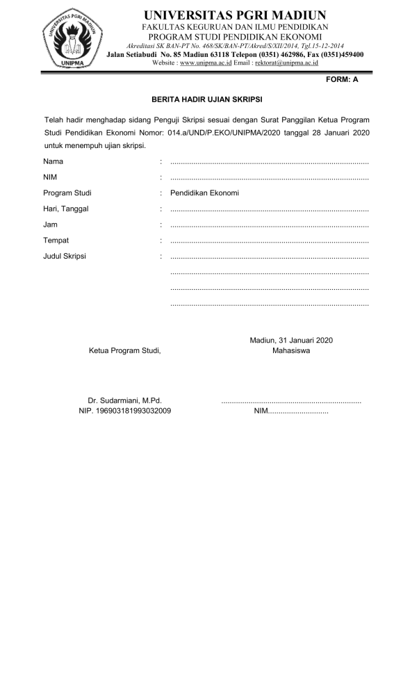 UNIVERSITAS PGRI MADIUN FAKULTAS KEGURUAN DAN ILMU PENDIDIKAN PROGRAM STUDI PENDIDIKAN EKONOMI Akreditasi SK BAN-PT No. 468/SK/BAN-PT/Akred/S/XII/2014, Tgl.15-12-2014 Jalan Setiabudi No. 85 Madiun 63118 Telepon (0351) 462986, Fax (0351)459400 Website : www.unipma.ac.id Email : [email protected] FORM: A BERITA HADIR UJIAN SKRIPSI Telah hadir menghadap sidang Penguji Skripsi sesuai dengan Surat Panggilan Ketua Program Studi Pendidikan Ekonomi Nomor: 014.a/UND/P.EKO/UNIPMA/2020 tanggal 28 Januari 2020 untuk menempuh ujian skripsi. Nama : ............................................................................................... NIM : ............................................................................................... Program Studi : Pendidikan Ekonomi Hari, Tanggal : ............................................................................................... Jam : ............................................................................................... Tempat : ............................................................................................... Judul Skripsi : ............................................................................................... ............................................................................................... ............................................................................................... ............................................................................................... Ketua Program Studi, Madiun, 31 Januari 2020 Mahasiswa Dr. Sudarmiani, M.Pd. NIP. 196903181993032009 ................................................................... NIM............................. UNIVERSITAS PGRI MADIUN FAKULTAS KEGURUAN DAN ILMU PENDIDIKAN PROGRAM STUDI PENDIDIKAN EKONOMI Akreditasi SK BAN-PT No. 468/SK/BAN-PT/Akred/S/XII/2014, Tgl.15-12-2014 Jalan Setiabudi No. 85 Madiun 63118 Telepon (0351) 462986, Fax (0351)459400 Website : www.unipma.ac.id Email : [email protected] FORM: B FORMAT PENILAIAN UJIAN SKRIPSI Nama : ............................................................................................... NIM : ............................................................................................... Program Studi : Pendidikan Ekonomi Judul Skripsi : .............................................................................................. .............................................................................................. .............................................................................................. .............................................................................................. Hari, Tanggal ........................, ……. Januari 2020 ASPEK PENILAIAN Aspek Umum Permasalahan Rancangan Penelitian (Deskriptif, Korelasi, Eksperimen) Pembahasan 3. (Latar belakang, rumusan, tujuan, dan pentingnya pembahasan masalah) 4. Populasi dan sampling 5. Jenis dan Sumber Data 6. Teknik Pengumpulan Data 7. Analisis Data 8. Kesempurnaan Skripsi (Kepustakaan, Indeks, dan Lampiran lainnya) 9. Kajian Kepustakaan 10. Pengetikan B. Aspek Khusus 11. Penguasaan Materi 12. Penguasaan Metode Pembahasan Penulisan 13. Penampilan Dalam Mempertahankan 14. Kesimpulan (Saran dan Pendapat) JUMLAH Nilai Akhir (Rata-rata) NILAI A. 1. 2. Keterangan: - Butir 4,5,6 dan 7 jika skripsi berdasarkan Field Research - Skala Nilai : 0 – 100 Ekuivalen nilai : A= 4= 81 - 100 B= 3= 71 - 80 C= 2= 57 - 70 D= 1= 41 - 56 E= 0= 0 - 40 Madiun, ………. Januari 2020 Penguji I/ II/III ............................................................. NIDN. UNIVERSITAS PGRI MADIUN FAKULTAS KEGURUAN DAN ILMU PENDIDIKAN PROGRAM STUDI PENDIDIKAN EKONOMI Akreditasi SK BAN-PT No. 468/SK/BAN-PT/Akred/S/XII/2014, Tgl.15-12-2014 Jalan Setiabudi No. 85 Madiun 63118 Telepon (0351) 462986, Fax (0351)459400 Website : www.unipma.ac.id Email : [email protected] FORM: C BERITA ACARA UJIAN SKRIPSI Yang bertanda tangan di bawah ini: Penguji I Nama : ............................................................................................... NIDN : ............................................................................................... Jabatan Akademik : ............................................................................................... Pangkat/ Golongan : ............................................................................................... Nama : ............................................................................................... NIDN : ............................................................................................... Jabatan Akademik : ............................................................................................... Pangkat/ Golongan : ............................................................................................... Nama : ............................................................................................... NIDN : ............................................................................................... Jabatan Akademik : ............................................................................................... Pangkat/ Golongan : ............................................................................................... Penguji II Penguji III Menyatakan dengan sesungguhnya bahwa telah menguji skripsi sesuai dengan Surat Keputusan Dekan FKIP UNIVERSITAS PGRI MADIUN Nomor: 0034/Q/FKIP/UNIPMA/2020/SK tanggal 27 Januari 2020 tentang ujian skripsi mahasiswa Nama : ............................................................................................... NIM : ............................................................................................... Program Studi : Pendidikan Ekonomi Hari, Tanggal : .............................................................................................. Jam : .............................................................................................. Tempat : .......