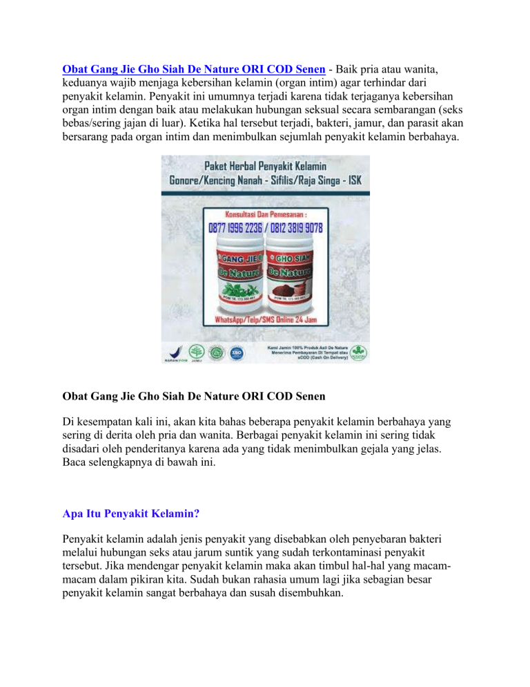Obat Gang Jie Gho Siah De Nature ORI COD Senen - Baik pria atau wanita, keduanya wajib menjaga kebersihan kelamin (organ intim) agar terhindar dari penyakit kelamin. Penyakit ini umumnya terjadi karena tidak terjaganya kebersihan organ intim dengan baik atau melakukan hubungan seksual secara sembarangan (seks bebas/sering jajan di luar). Ketika hal tersebut terjadi, bakteri, jamur, dan parasit akan bersarang pada organ intim dan menimbulkan sejumlah penyakit kelamin berbahaya. Obat Gang Jie Gho Siah De Nature ORI COD Senen Di kesempatan kali ini, akan kita bahas beberapa penyakit kelamin berbahaya yang sering di derita oleh pria dan wanita. Berbagai penyakit kelamin ini sering tidak disadari oleh penderitanya karena ada yang tidak menimbulkan gejala yang jelas. Baca selengkapnya di bawah ini. Apa Itu Penyakit Kelamin? Penyakit kelamin adalah jenis penyakit yang disebabkan oleh penyebaran bakteri melalui hubungan seks atau jarum suntik yang sudah terkontaminasi penyakit tersebut. Jika mendengar penyakit kelamin maka akan timbul hal-hal yang macammacam dalam pikiran kita. Sudah bukan rahasia umum lagi jika sebagian besar penyakit kelamin sangat berbahaya dan susah disembuhkan. Mengapa Bisa Mengidap Penyakit Kelamin? Seperti yang sudah dijelaskan sebelumnya jika penyakit kelamin biasanya menular melalui jarum suntik dan hubungan seksual maka dari itu sering disebut juga dengan Penyakit Menular Seksual (PMS) atau Infeksi Menular Seksual (IMS). Infeksi menular seksual atau penyakit menular seksual adalah infeksi yang menular melalui hubungan intim. Penyakit ini dapat ditandai dengan ruam atau lepuhan dan rasa nyeri di area kelamin. Ada banyak jenis penyakit menular seksual, di antaranya chlamydia, gonore/kencing nanah, sifilis/raja singa, trikomoniasis, dan HIV. Sesuai namanya, penyakit menular seksual menyebar melalui hubungan intim, baik secara vaginal, anal, maupun oral. Tidak hanya hubungan intim, penularan juga dapat terjadi melalui transfusi darah dan berbagi jarum suntik dengan penderita. Infeksi juga dapat ditularkan dari ibu hamil ke janin, baik selama kehamilan atau saat persalinan. Berapa Lama Gejala Penyakit Kelamin Bisa Terasakan? Penyakit menular seksual tidak selalu menimbulkan gejala atau bisa hanya menyebabkan gejala ringan. Oleh karena itu, tidak heran beberapa orang baru mengetahui dirinya menderita penyakit menular seksual setelah muncul komplikasi atau ketika pasangannya terdiagnosis menderita penyakit menular seksual. Gejala yang dapat muncul akibat penyakit menular seksual akan berbeda-beda tergantung jenis penyakitnya, namun umumnya berupa: Muncul benjolan, luka, atau lepuhan di sekitar penis, vagina, anus, atau mulut. Vagina atau penis terasa gatal dan terbakar. Nyeri ketika buang air kecil atau berhubungan intim. Keluar cairan dari penis (kencing nanah) atau vagina (keputihan). Nyeri perut bagian bawah. Demam dan menggigil. Muncul pembengkakan kelenjar getah bening atau benjolan di selangkangan. Muncul ruam kulit di badan, tangan, atau kaki. Kulit penis kering, ruam, dan kemerahan. Selain beberapa gejala di atas, wanita juga bisa merasakan gejala lain, yaitu perdarahan di luar masa menstruasi dan muncul bau tidak sedap dari vagina. Ini juga merupakan salah satu tanda gejala penyakit kelamin wanita. Sementara pada pria, gejala lain penyakit menular seksual yang dapat dialami adalah nyeri, sperma berdarah, atau pembengkakan pada testis. Obat Gang Jie Gho Siah De Nature ORI COD Senen Kapan Harus Melakukan Penanganan? Segeralah lakukan penanganan jika Anda mengalami keluhan pada organ intim atau gejala-gejala di atas. Anda juga perlu memeriksakan diri jika pasangan Anda diketahui menderita penyakit menular seksual, atau bila Anda melakukan hubungan seksual yang berisiko, misalnya tanpa kondom, salah dalam menggunakan kondom, dan sering bergonta-ganti pasangan. Macam-Macam Penyakit Menular Seksual Penyakit menular seksual dapat disebabkan oleh infeksi bakteri, virus, jamur, dan parasit. Berikut ini adalah macam-macam penyakit menular seksual: 1. Sifilis Sifilis disebabkan oleh bakteri Treponema pallidum. Penyakit yang juga dikenal dengan sebutan “raja singa” ini menimbulkan luka pada alat kelamin atau mulut. Melalui luka inilah penularan akan terjadi. 2. Gonore Gonore, yang dikenal juga dengan kencing nanah, disebabkan oleh bakteri Neisseria gonorrhoeae. Penyakit ini menyebabkan keluarnya cairan dari penis atau vagina dan rasa nyeri ketika buang air kecil. Bakteri penyebab gonore juga dapat menimbulkan infeksi di bagian tubuh lain, jika terjadi kontak dengan sperma atau cairan vagina. 3. Human papillomavirus (HPV) Infeksi menular seksual ini disebabkan oleh virus dengan nama yang sama, yaitu HPV. Virus HPV dapat menyebabkan kutil kelamin hingga kanker serviks pada perempuan. Gejala kanker serviks stadium awal sering kali tidak khas bahkan tak bergejala. Penularan HPV terjadi melalui kontak langsung atau melakukan hubungan seksual dengan penderita. 4. Infeksi HIV Infeksi HIV disebabkan oleh human immunodeficiency virus yang menyerang sistem kekebalan tubuh. Penyebaran virus ini dapat terjadi melalui hubungan seks tanpa kondom, berbagi penggunaan alat suntik, transfusi darah, atau saat persalinan. 5. Chlamydia Penyakit infeksi menular seksual ini disebabkan oleh bakteri Chlamydia trachomatis. Pada wanita, chlamydia menyerang leher rahim. Sedangkan pada pria, menyerang saluran keluar urine di penis. Penularan dapat terjadi dari luka pada area kelamin. 6. Trikomoniasis Penyakit menular seksual ini disebabkan oleh parasit Trichomonas vaginalis. Penyakit trikomoniasis bisa menimbulkan keputihan pada wanita atau malah tidak menimbulkan gejala, sehingga sering kali seseorang secara tidak sadar menularkan penyakit ini ke pasangan seksualnya. Bagaimana Mengatasi Penyakit Kelamin Dengan Baik Dan Benar? Pengobatan terhadap penyakit menular seksual disesuaikan dengan penyebab infeksi, melalui pemberian obat-obatan berikut ini: Antibiotik Antibiotik digunakan untuk mengobati berbag