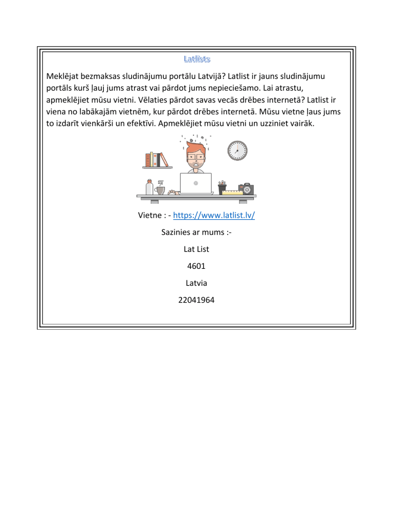 Meklējat bezmaksas sludinājumu portālu Latvijā? Latlist ir jauns sludinājumu portāls kurš ļauj jums atrast vai pārdot jums nepieciešamo. Lai atrastu, apmeklējiet mūsu vietni. Vēlaties pārdot savas vecās drēbes internetā? Latlist ir viena no labākajām vietnēm, kur pārdot drēbes internetā. Mūsu vietne ļaus jums to izdarīt vienkārši un efektīvi. Apmeklējiet mūsu vietni un uzziniet vairāk. Vietne : - https://www.latlist.lv/ Sazinies ar mums :Lat List 4601 Latvia 22041964