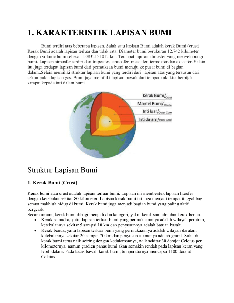 1. KARAKTERISTIK LAPISAN BUMI Bumi terdiri atas beberapa lapisan. Salah satu lapisan Bumi adalah kerak Bumi (crust). Kerak Bumi adalah lapisan terluar dan tidak rata. Diameter bumi berukuran 12.742 kilometer dengan volume bumi sebesar 1,08321×1012 km. Terdapat lapisan atmosfer yang menyelubungi bumi. Lapisan atmosfer terdiri dari troposfer, stratosfer, mesosfer, termosfer dan eksosfer. Selain itu, juga terdapat lapisan bumi dari permukaan bumi menuju ke pusat bumi di bagian dalam..Selain memiliki struktur lapisan bumi yang terdiri dari lapisan atas yang tersusun dari sekumpulan lapisan gas. Bumi juga memiliki lapisan bawah dari tempat kaki kita berpijak sampai kepada inti dalam bumi. Struktur Lapisan Bumi 1. Kerak Bumi (Crust) Kerak bumi atau crust adalah lapisan terluar bumi. Lapisan ini membentuk lapisan litosfer dengan ketebalan sekitar 80 kilometer. Lapisan kerak bumi ini juga menjadi tempat tinggal bagi semua makhluk hidup di bumi. Kerak bumi juga menjadi bagian bumi yang paling aktif bergerak. Secara umum, kerak bumi dibagi menjadi dua kategori, yakni kerak samudra dan kerak benua. Kerak samudra, yaitu lapisan terluar bumi yang permukaannnya adalah wilayah perairan, ketebalannya sekitar 5 sampai 10 km dan penyusunnya adalah batuan basalt. Kerak benua, yaitu lapisan terluar bumi yang permukaannya adalah wilayah daratan, ketebalannya sekitar 20 sampai 70 km dan penyusun utamanya adalah granit. Suhu di kerak bumi terus naik seiring dengan kedalamannya, naik sekitar 30 derajat Celcius per kilometernya, namun gradien panas bumi akan semakin rendah pada lapisan keran yang lebih dalam. Pada batas bawah kerak bumi, temperaturnya mencapai 1100 derajat Celcius. 2. Selimut/Mantel Bumi (Mantle) Selimut bumi atau selubung bumi atau mantel bumi merupakan lapisan yang berada di antara bagian kerak bumi dan inti bumi. Mantel bumi menjadi bagian lapisan bumi terbesar. Mantel bumi mencakup lebih dari 80% volume Bumi secara keseluruhan. Suhunya bisa mencapai 3000 derajat Celcius. Secara umum mantel bumi dibagi menjadi dua bagian, yakni mantel bumi bagian atas dan mantel bumi bagian bawah. Mantel bumi bagian atas, berada pada kedalaman 400 km dengan lapisan yang bersifat plastis dan semiplastis karena suhu dan tekanan pada mantel atas berada pada kondisi setimbang. Mantel bumi bagian bawah, berada pada kedalaman 2900 km dengan lapisan yang bersifat pada karena adanya tekanan dari lapisan di atasnya. Mantel bawah mengandung besi dan mineral SIMA. Lapisan selimut bumi sering disebut sebagai lapisan astenosfer. Pada lapisan ini, terjadi pergerakan lempeng-lempeng yang disebabkan oleh gaya konveksi atau energi dari panas bumi. Pergerakan tersebut sangat mempengaruhi bentuk muka bumi.Total ketebalan selubung bumi ini sekitar 2800 kilometer. Komposisi penyusun mantel bumi didominasi oleh senyawa magnesium, besi, aluminium, kalium, silikon dan oksigen. Pada wilayah selubung bagian atas akan mulai terbentuk intrusi magma yang diakibatkan oleh batuan yang menyusup dan meleleh. 3. Inti Bumi (Core) Inti bumi atau core adalah lapisan terdalam bumi. Lapisan inti bumi terletak mulai kedalaman 2900 km sampai ke pusat bumi atau sekitar kedalaman 6300 km. Suhu di inti bumi berkisar antara 2000 derajat Celcius di bagian luar, hingga 4500 derajat Celcius di bagian dalamnya. Secara umum, berdasarkan zat penyusunnya, inti bumi dibagi menjadi dua bagian yakni inti bumi bagian luar atau outer core serta inti bumi bagian dalam atau inner core. Inti bumi bagian luar (outer core), terletak di antara kedalaman 2900 km sampai 5100 km dan tersusun dari logam padat. Inti bumi bagian dalam (inner core), terletak di antara kedalaman 5100 km sampai pusat bumi dan tersusun dari logam cair. Antara inti bagian luar dan dalam, dipisahkan oleh lapisan yang disebut sebagai lehman discontinuity. Material penyusun inti bumi terdiri dari senyawa besi dan nikel. Nah demikian referensi lapisan-lapisan bumi beserta struktur, karakteristik, komponen penyusun dan penjelasannya. Secara umum lapisan bumi terdiri kerak bumi, mantel bumi serta inti bumi bagian luar dan bagian dalam. Semoga bisa menambah wawasan dan pengetahuan. 2. PROSES TEKTONISME DAN PENGARUHNYA TERHADAP KEHIDUPAN Tektonisme merupakan tenaga dari dalam bumi yang menyebabkan terjadinya perubahan letak muka bumi secara mendatar atau vertikal, baik yang mengakibatkan putusnya hubungan batuan maupun tidak. Tektonisme akan mengubah bentuk muka bumi menjadi naik atau turun. GERAK EPIROGENESA DAN OROGENESA A. Gerak Epirogenesa Suatu proses perubahan bentuk daratan yang disebabkan oleh tenaga yang lambat dari dalam dengan arah vertikal, baik ke atas maupun ke bawah meliputi wilayah yang luas. Gerakan tektonis epirogenesa ada 2 macam, yaitu epirogenesa positif dan epirogenesa negatif. Epirogenesa positif Merupakan gerak turunnya daratan sehingga terlihat seakan permukaan air laut naik, akibat adanya sedimen yang tebal. Contoh: Turunnya pulau-pulau di Indonesia bagian timur (Kep. Maluku dari barat daya sampai P. Banda). Epirogenesa negatif Merupakan gerak naiknya daratan sehingga terlihat seakan permukaan air laut turun, misal mencairnya lapisan es. Contoh: Naiknya Pulau Timor dan Pulau Buton Naiknya Dataran Tinggi Colorado di Amerika Serikat. B. Gerak Orogenesa - Orogenesa adalah gerakan pergeseran lapisan kulit bumi dengan arah vertical (domex = gunung) dan horizon dengan gerakannya relative cepat pada wilayah yang sempit. Gerakan ini menghasilkan gunung, patahan, dan lipatan. Merupakan suatu pergerakan lempeng tektonis yang sangat cepat meliputi wilayah yang sempit. Merupakan proses pembentukan gunuung akibat tabrakan lempeng benua, sesar bawah benua, perekahan kontinen, atau pergeseran punggung samudra dengan benua. Gerak orogenesa membentuk lipatan,patahan dan retakan batuan kulit bumi 1. Lipatan (Fault) Merupakan bentukan permukaan bumi yang terjadi karena tekanan yang lemah, tetapi berlangsung secara terus menerus. Puncak lipatan disebut antiklinal dan lembah lipatan disebut sinklinal