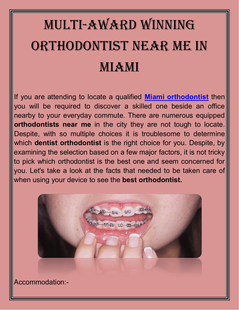 Multi-Award Winning Orthodontist Near Me In Miami If you are attending to locate a qualified Miami orthodontist then you will be required to discover a skilled one beside an office nearby to your everyday commute. There are numerous equipped orthodontists near me in the city they are not tough to locate. Despite, with so multiple choices it is troublesome to determine which dentist orthodontist is the right choice for you. Despite, by examining the selection based on a few major factors, it is not tricky to pick which orthodontist is the best one and seem concerned for you. Let's take a look at the facts that needed to be taken care of when using your device to see the best orthodontist. Accommodation:- If you locate a facility nearby it will surely continue to add a lot of comfort to your healthy living. Repeat visits to the orthodontist in the short-term are normal so you will be required to avoid having to visit cross-city every time you go for a treatment. If you own any coverage that restricts your preferences of North Miami orthodontist then it may also be a beneficial approach to pick from these alternatives to limit charges. This depends on the qualified list in your coverage duration as you should attend a non-listed orthodontic expert instead if it means shorter commute, better returns, and more reliable assistance. Cost:The affordable orthodontist should be your priority to see. Some orthodontists are charged more than other orthodontists and this is not constantly based on knowledge. It is great to find an orthodontist that has the expertise and below your coverage, if orthodontist charges are a major concern. If the expense is not a concern then directly get it into thought while comparing choices in a tiny list of modified orthodontists. Expertise:- Experience matters a lot when it comes to health concerns. You should give preference to the orthodontist specialist near me who offers the best treatment yet the affordable one. So you avoid suffering from financial crises. You should do your search by checking the orthodontist's qualifications such as degrees, certifications, authorisation, and several years working as an orthodontist to determine how adequate the person is. If you have tailored demands, like clear dental braces, then you should make sure that the orthodontist has appropriate qualifications along with the expertise in that area. Also, if your child necessitates an orthodontist then it would be promoted to locate a children-specific office. You can prefer to pick the orthodontist that accepts payment plans near me. This responsibility is as manageable as gathering a list of terms and doing some investigation to recognise which orthodontists best suit your demands. You should select if you have controls to assistance charge, sort of orthodontic care, or particular orthodontists you can pick from under your insurance policy. Later, you can commence looking for orthodontists in your area that meet your guidelines.