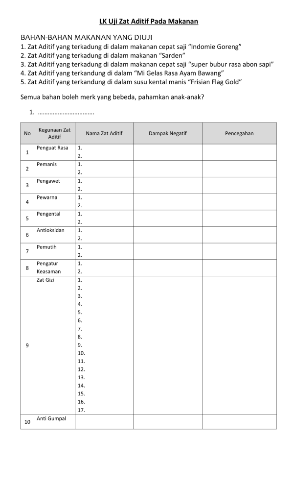LK Uji Zat Aditif Pada Makanan BAHAN-BAHAN MAKANAN YANG DIUJI 1. Zat Aditif yang terkadung di dalam makanan cepat saji “Indomie Goreng” 2. Zat Aditif yang terkadung di dalam makanan “Sarden” 3. Zat Aditif yang terkadung di dalam makanan cepat saji “super bubur rasa abon sapi” 4. Zat Aditif yang terkandung di dalam “Mi Gelas Rasa Ayam Bawang” 5. Zat Aditif yang terkandung di dalam susu kental manis “Frisian Flag Gold” Semua bahan boleh merk yang bebeda, pahamkan anak-anak? 1. ……………………………. No 1 2 3 4 5 6 7 8 Kegunaan Zat Aditif Penguat Rasa Pemanis Pengawet Pewarna Pengental Antioksidan Pemutih Pengatur Keasaman Zat Gizi 9 10 Anti Gumpal Nama Zat Aditif 1. 2. 1. 2. 1. 2. 1. 2. 1. 2. 1. 2. 1. 2. 1. 2. 1. 2. 3. 4. 5. 6. 7. 8. 9. 10. 11. 12. 13. 14. 15. 16. 17. Dampak Negatif Pencegahan 2. ………………………. No 1 2 3 4 5 6 7 8 Kegunaan Zat Aditif Penguat Rasa Pemanis Pengawet Pewarna Pengental Antioksidan Pemutih Pengatur Keasaman Zat Gizi 9 10 Anti Gumpal Nama Zat Aditif 1. 2. 1. 2. 1. 2. 1. 2. 1. 2. 1. 2. 1. 2. 1. 2. 1. 2. 3. 4. 5. 6. 7. 8. 9. 10. 11. 12. 13. 14. 15. 16. 17. Dampak Negatif Pencegahan 3. ………………………. No 1 2 3 4 5 6 7 8 Kegunaan Zat Aditif Penguat Rasa Pemanis Pengawet Pewarna Pengental Antioksidan Pemutih Pengatur Keasaman Zat Gizi 9 10 Anti Gumpal Nama Zat Aditif 1. 2. 1. 2. 1. 2. 1. 2. 1. 2. 1. 2. 1. 2. 1. 2. 1. 2. 3. 4. 5. 6. 7. 8. 9. 10. 11. 12. 13. 14. 15. 16. 17. Dampak Negatif Pencegahan 4. ………………………. No 1 2 3 4 5 6 7 8 Kegunaan Zat Aditif Penguat Rasa Pemanis Pengawet Pewarna Pengental Antioksidan Pemutih Pengatur Keasaman Zat Gizi 9 10 Anti Gumpal Nama Zat Aditif 1. 2. 1. 2. 1. 2. 1. 2. 1. 2. 1. 2. 1. 2. 1. 2. 1. 2. 3. 4. 5. 6. 7. 8. 9. 10. 11. 12. 13. 14. 15. 16. 17. Dampak Negatif Pencegahan 5. ………………………. No 1 2 3 4 5 6 7 8 Kegunaan Zat Aditif Penguat Rasa Pemanis Pengawet Pewarna Pengental Antioksidan Pemutih Pengatur Keasaman Zat Gizi 9 10 Anti Gumpal Nama Zat Aditif 1. 2. 1. 2. 1. 2. 1. 2. 1. 2. 1. 2. 1. 2. 1. 2. 1. 2. 3. 4. 5. 6. 7. 8. 9. 10. 11. 12. 13. 14. 15. 16. 17. Dampak Negatif Pencegahan