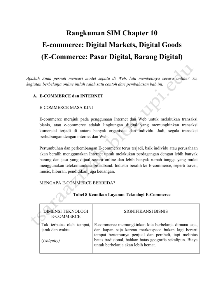 Rangkuman SIM Chapter 10 E-commerce: Digital Markets, Digital Goods (E-Commerce: Pasar Digital, Barang Digital) Apakah Anda pernah mencari model sepatu di Web, lalu membelinya secara online? Ya, kegiatan berbelanja online inilah salah satu contoh dari pembahasan bab ini. A. E-COMMERCE dan INTERNET E-COMMERCE MASA KINI E-commerce merajuk pada penggunaan Internet dan Web untuk melakukan transaksi bisnis, atau e-commerce adalah lingkungan digital yang memungkinkan transaksi komersial terjadi di antara banyak organisasi dan individu. Jadi, segala transaksi berhubungan dengan internet dan Web. Pertumbuhan dan perkembangan E-commerce terus terjadi, baik individu atau perusahaan akan beralih menggunakan Internet untuk melakukan perdagangan dengan lebih banyak barang dan jasa yang dijual secara online dan lebih banyak rumah tangga yang mulai menggunakan telekomunikasi broadband. Industri beralih ke E-commerce, seperti travel, music, hiburan, pendidikan juga keuangan. MENGAPA E-COMMERCE BERBEDA? Tabel 8 Keunikan Layanan Teknologi E-Commerce DIMENSI TEKNOLOGI E-COMMERCE SIGNIFIKANSI BISNIS Tak terbatas oleh tempat, E-commerce memungkinkan kita berbelanja dimana saja, dan kapan saja karena marketspace bukan lagi berarti jarak dan waktu tempat bertemunya penjual dan pembeli, tapi melintas batas tradisional, bahkan batas geografis sekalipun. Biaya (Ubiquity) untuk berbelanja akan lebih hemat. Jangkauan Global (Global reach) Standar Universal (Universal standards) Memungkinkan transaksi komersial melintasi batas-batas budaya dan negara dengan kenyamanan yang lebih tinggi dan biaya yang lebih efektif daripada dalam suatu sistem perdagangan yang tradisional. Akibatnya, ukuran pasar potensial untuk pedagang e-commerce secara kasar sama dengan ukuran populasi online dunia. Standar teknik untuk melakukan e-commerce merupakan standar universal, karena menggunakan internet. Keuntungannya : a. Bagi produsen akan menekan biaya masuk pasar (market entry cost)—biaya yang harus dikeluarkan oleh penjual untuk membawa barangnya ke pasar b. Bagi konsumen, standar universal mengurangi biaya pencarian (search cost)—usaha yang dibutuhkan untuk mendapatkan barang sesuai keinginan mereka Multifungsi/ Multi-manfaat Isi dari suatu pesan yang digunakan dalam marketing disajikan secara beragam, melalui video, audio, dan pesan lainnya. (Richness) Keinteraktifan (Interactivity) memungkinkan terjadinya komunikasi dua arah (interaksi yang interaktif) antara penjual dan konsumen. Kepadatan Informasi Biaya untuk mengakses informasi, menyimpan, dan berkomunikasi akan dapat ditekan, namun tetap menjaga keakuratan. (Information Density) Personalisasi/Penyesuaian (Personalization/ Customization) Personalisasi: Pedagang dapat memberikan pesan pemasaran kepada pelanggan sesuai kualifikasi yang diinginkan Penyesuaian : memudahkan dalam mengubah barang atau jasa yang dijual sesuai dengan preferensi pengguna atau perilaku yang ia tunjukkan sebelumnya. Contoh : harga, warna, dll Teknologi Sosial Model bisnis dimana dapat menghubungkan antara bisnis dengan akun media sosial (Social Technology) KONSEP UTAMA DALAM E-COMMERCE: PASAR DIGITAL DAN BARANG DIGITAL DALAM LAHAN PEMASARAN YANG GLOBAL 1. Internet mengurangi asimetri (ketimpangan) informasi. Jadi, dengan adanya internet, orang akan mudah mendapatkan informasi, sehingga tidak ada yang dirugikan dalam penawaran barang karena ada yang memiliki informasi lebih atas barang tersebut. 2. Pasar digital sangat fleksibel dan efisien karena beroperasi dengan biaya pencarian dan transaksi yang sangat kecil, biaya menu (menu cost, biaya penjual akibat perubahan harga) yang lebih rendah, diskriminasi harga, dan kemampuan untuk mengubah harga dengan dinamis yang disesuaikan dengan kondisi pasar. Dalam penentuan harga dinamis (dynamic pricing), harga dari sebuah barang bergantung pada karakteristik permintaan dari konsumen atau situasi pasokan dari penjual. Barang Digital Barang digital (digital goods) adalah barang yang dapat dikirimkan melalui jaringan digital. Musik, video, peranti lunak, koran, majalah, dan buku semuanya dapat dinyatakan, disimpan, dikirim, dan dijual sebagai barang digital Pasar Digital vs Pasar Tradisional Kualifikasi Pasar Digital Pasar Tradisional informasi ???? Berkurang Tinggi Biaya pencarian Rendah Tinggi Biaya Transaksi Gratifikasi keterlambatan Rendah Tinggi (waktu, perjalanan) dalam Tinggi Rendah (terima barang saat transaksi) Biaya menu Rendah Tinggi Harga yang dinamis Biaya yang Rendah, Instan Biaya Tinggi, lambat Diskriminasi harga Biaya yang Rendah, Instan Biaya Tinggi, lambat Segmentasi Pasar Biaya yang kalangan atas Biaya pengembalian Tergantung produk Efek Jaringan Kuat Lemah Intermediasi Berpotensi Kurang berpotensi Rendah, Biaya Tinggi, Kalangan menengah ke bawah karakteristik Tinggi B. E-COMMERCE : BISNIS DAN TEKNOLOGI TIPE/ JENIS E-COMMERCE : 1. Bisnis ke konsumen / Business-to-consumer (B2C) electronic commerce yang melibatkan penjualan produk dan layanan secara eceran kepada pembeli perorangan. Menjual music, buku, software. 2. Bisnis ke bisnis/ Business-to-business (B2B) electronic commerce yang melibatkan penjualan produk dan layanan antar perusahaan. Contoh : ChemConnect’s Web site yang menjual bahan kimia dan plastic 3. Konsumen ke konsumen/ Consumer-to-consumer (C2C) electronic commerce yang melibatkan konsumen yang menjual secara langsung ke konsumen. Contoh :eBay E – Commerce bisnis ke bisnis (B2B) masih didasarkan pada pada sitem berbayar untuk pertukaran data elektronik (EDI), yang memungkin pertukaran informasi komputer atara dua organisasi dari transaksi standar. MODEL BISNIS E-COMMERCE 1. Portal Penyedia mesin pencarian dan paket terintegrasi di Web seperti Google, Bing, Yahoo, MSN yang menyediakan jasa dan menu e-mail, kalender, belanja, dll dalam satu tempat 2. E-Tailer (toko yang menjual barang-barang secara online) 3. Content Provider Penyedia konten-konten informasi, seperti video, music, foto, seni, edukasi. Contohnya: Apple, youtube,