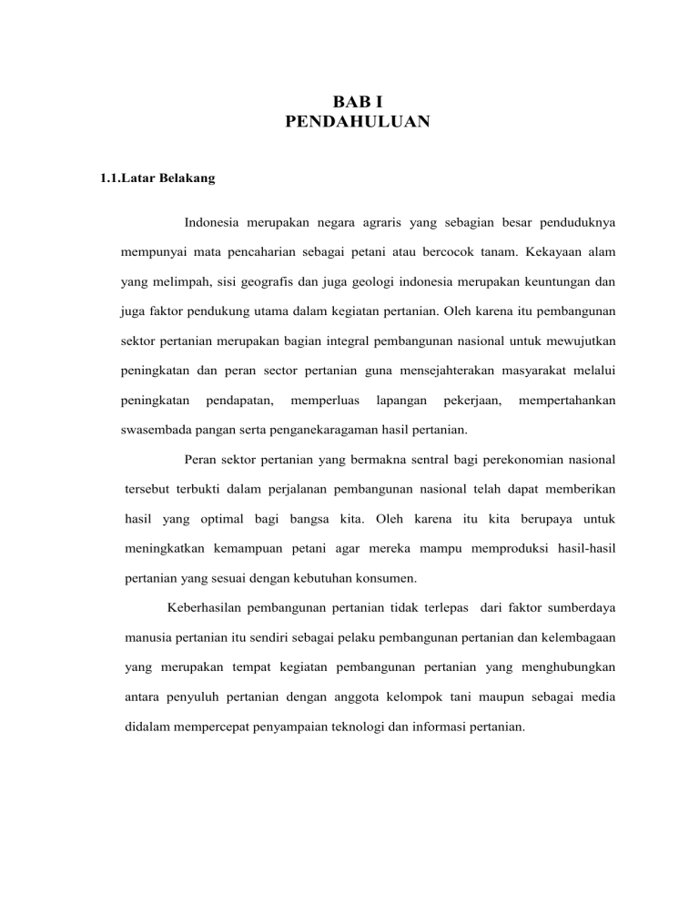 BAB I PENDAHULUAN 1.1.Latar Belakang Indonesia merupakan negara agraris yang sebagian besar penduduknya mempunyai mata pencaharian sebagai petani atau bercocok tanam. Kekayaan alam yang melimpah, sisi geografis dan juga geologi indonesia merupakan keuntungan dan juga faktor pendukung utama dalam kegiatan pertanian. Oleh karena itu pembangunan sektor pertanian merupakan bagian integral pembangunan nasional untuk mewujutkan peningkatan dan peran sector pertanian guna mensejahterakan masyarakat melalui peningkatan pendapatan, memperluas lapangan pekerjaan, mempertahankan swasembada pangan serta penganekaragaman hasil pertanian. Peran sektor pertanian yang bermakna sentral bagi perekonomian nasional tersebut terbukti dalam perjalanan pembangunan nasional telah dapat memberikan hasil yang optimal bagi bangsa kita. Oleh karena itu kita berupaya untuk meningkatkan kemampuan petani agar mereka mampu memproduksi hasil-hasil pertanian yang sesuai dengan kebutuhan konsumen. Keberhasilan pembangunan pertanian tidak terlepas dari faktor sumberdaya manusia pertanian itu sendiri sebagai pelaku pembangunan pertanian dan kelembagaan yang merupakan tempat kegiatan pembangunan pertanian yang menghubungkan antara penyuluh pertanian dengan anggota kelompok tani maupun sebagai media didalam mempercepat penyampaian teknologi dan informasi pertanian. 1.2.Maksud dan Tujuan Adapun secara terperinci maksud dan tujuan penyusunan programa penyuluhan pertanian ini adalah sebagai berikut : 1. Sebagai acuan dalam penyelenggaraan penyuluhan pertanian di wilayah Kecamatan Perak 2. Sebagai acuan bagi setiap penyuluh pertanian dalam menyusun rencana kegiatan penyuluhan. 3. Menyediakan bahan penyusunan perencanaan penyuluhan untuk disampaikan dalam forum musrenbang tahun berikutnya. 4. Sumbangan informasi bagi pemerintah daerah atau pusat dapat mengambil keputusan untuk menentukan kebijaksanaan pembangunan pertanian, di wilayah Kecamatan Perak. BAB II KEADAAN WILAYAH 2.1. Potensi Wilayah dan Agroekosistim Secara Geografis, kecamatan Perak kabupaten Jombang terletak ± 12 KM disebelah barat dari pusat kota pemerintah kabupaten Jombang dengan batas-batas sebagai berikut : o Sebelah Utara dengan Kec. Megaluh dan Jombang o Sebelah Timur dengan Kec. Diwek dan Gudo o Sebelah Selatan dengan Kec. BandarKedungmulyo dan Kab Kediri o Sebelah Barat dengan Kec. Bandarkedungmulyo Secara administratif Kecamatan Perak memiliki luas wilayah 29,04 km2 yang terbagi dalam 13 desa dan 37 dusun. Kecamatan Perak terletak pada 112’20’01” s.d 112’30’01” bujur timur dan 7’25’01” s.d 7’45’01” lintang selatan dengan topografi 99% datar. Wilayah kerja penyuluh pertanian Kecamatan Perak meliputi 37 Poktan dan 13 Gapoktan yang terbagi menjadi 7 wilayah kerja penyuluh pertanian dan dibina oleh 7 orang PPL serta 1 Orang POPT. Janti ganggong Kepuhkajang Sumberagung Pagerwojo Perak Sembung Glagahan Kalangsemanding Gadingmangu Plosogenuk Sukorejo Temuwulan Cangkringrandu Jarak Antar Desa Jantiganggong 0 1 3 4 4 5 5 6 5 7 7 8 8 Kepuhkajang 1 0 1 5 3 2 3 3 4 6 6 6 7 Sumberagung 3 1 0 2 1 2 4 5 2 5 6 6 7 Pagerwojo 4 5 2 0 1 2 4 5 2 5 6 6 7 Perak 4 3 1 1 0 1 3 2 1 4 5 5 6 7 Sembung 5 2 2 2 1 0 2 2 3 5 6 4 5 Glagahan 5 3 4 4 3 2 0 2 3 4 5 2 3 Kalangsemanding 6 3 5 5 2 2 2 0 1 3 4 5 6 Gadingmangu 5 4 2 2 1 3 3 1 0 3 4 6 7 6 Plosogenuk 7 6 5 5 4 5 4 3 3 0 1 4 3 Sukorejo 7 6 6 6 5 6 5 4 4 1 0 3 1 Temuwulan 8 6 6 6 5 4 2 5 6 4 3 0 1 Cangkringrandu 8 7 7 7 6 5 3 6 7 3 1 1 0 2.2. Sumber Daya Alam A. Penggunaan Luas Lahan Tabel I. Keadaan Penggunaan Lahan di kecamatan Perak tahun 2019 No Nama Desa / Luas Lahan Gapoktan (Ha) Sawah (Ha) Tegal (Ha) Pekarangan (Ha) 1 Perak 121 90 - 31 2 Pagerwojo 232 165 - 57 3 Sumberagung 187 106 - 81 4 Jantiganggong 141 111 - 30 5 Keepuhkajang 274 213 - 61 6 Sembung 123 103 20 20 7 Gadingmangu 175 135 - 40 8 Kalangsemanding 185 134 10 41 9 Plosogenuk 284 160 75 49 10 Glagahan 166 139 - 27 11 Temuwulan 157 122 - 35 12 Cangkringrandu 299 248 - 51 13 Sukorejo 307 289 18 63 Jumlah 2651 2015 123 586 Luas Lahan (Ha) 1 Perak 2 Pagerwojo 3 Sumberagung 4 Jantiganggong 5 Keepuhkajang 6 Sembung 7 Gadingmangu 8 Kalangsemanding 9 Plosogenuk Keadaan penggunaan lahan di wilayah Kecamatan Perak sebagian besar yaitu sawah, hal ini sangat berpotensi untuk mengembangkan usaha dibidang pertanian. B. Pola Tanam Tabel II. Pola tanam kecamatan perak tahun 2019 NO POLA TANAM LUAS (Ha) 1 Padi – Padi Padi 404 2 Padi – Padi –Jagung 1160 3 Padi – Padi – Semangka 54 4 Padi – Jagung – Jagung 131 5 Padi – Jagung – Garbis 46 6 Padi – Padi – Kacang Tanah 17 7 Padi – Padi – Sayuran 16 8 Tebu 187 Jumlah 2015 Pola Tanam 1 Padi – Padi Padi 2 Padi – Padi –Jagung 3 Padi – Padi – Semangka 4 Padi – Jagung – Jagung C. Potensi produksi dan produktivitas Usaha Tani Tabel 3. Produksi dan produktivitas usaha tani kecamatan Perak tahun 2019 NO Komoditas 1 Padi Luas Tanah (Ha) 1,212 Produksi (Ha) 8,484 Produktivitas (Kw / Ha) 700 2 Jagung 1,422 11,944 840 3 Kacang Tanah 17 136 800 NO Komoditas 4 Semangka Luas Tanah (Ha) 54 Produksi (Ha) 540 Produktivitas (Kw / Ha) 10000 5 Garbis 46 690 15000 6 Sayuran 16 192 12000 7 Tebu 187 16,83 9000 Jumlah 2,954 23,669 48,340 D. Iklim dan Curah Hujan No 1 2 Tahun Januari Februari 3 Maret 4 April 5 Mei 6 Juni 7 Juli 8 Agustus 9 September 10 Oktober 11 November 12 Desember Jumlah Rata-rata CH HH CH HH CH HH CH HH CH HH CH HH CH HH CH HH CH HH CH HH CH HH CH HH CH HH CH HH 2013 506 18 536 18 475 15 291 12 61 7 302 9 75 5 0 0 1 1 255 8 484 17 2986 110 248.8 9.17 2014 364 16 171 13 156 10 118 5 31 3 122 3 46 4 16 1 3 1 0 1 138 8 268 14 1433 79 119 6.6 2015 350 16 447 17 505 18 202 11 30 1 154 7 365 15 2053 85 171.1 7.1 2016 574 20 504 22 472 15 145 11 104 6 97 8 159 9 43 3 79 8 243 11 368 16 225 13 3013 142 251 11.8 2017 534 23 341 16 390 22 352 20 89 9 40 6 3 1 49 5 4 2 273 15 300 16 2375 135 198 11 Tabel IV. Data curah hujan rata-rata wilayah kecamatan perak tahun 2018 Sumber: Dinas Pengair