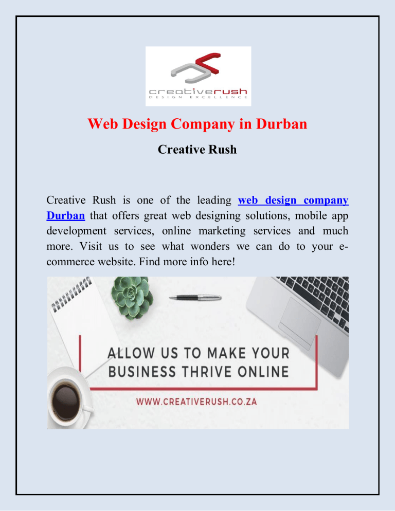 Web Design Company in Durban Creative Rush Creative Rush is one of the leading web design company Durban that offers great web designing solutions, mobile app development services, online marketing services and much more. Visit us to see what wonders we can do to your ecommerce website. Find more info here! Buying behavior has drastically changed over the past decade, and now more consumers are starting (and often ending) their buyer’s journey online, virtually showing the effectiveness of how digital marketing works. This shift in the way that consumers make purchasing decisions and buy products and services have made digital marketing a must for any business that’s trying to compete in the modern marketplace, regardless of size or industry. Website Marketing In many ways, your company’s website is the cornerstone of your digital marketing strategy. This is where many of your target customers first get an impression of your brand, and more often than not, this is where your leads will eventually convert into paying customers. The goal of digital marketing is to attract, engage, and convert your leads. Many of the tactics that you will use to do this will ultimately lead your target customers back to your website to get more information or make a purchase. Your website is sometimes your brand’s only chance to make a good first impression with consumers in your target market. For this reason, you should pay attention to the layout of your site as well as the colours and graphics that you use in your site design. However, the appearance of your site is not the only thing that matters. Since your website is the center of many of your digital marketing campaigns, it’s important that it is designed and optimised for conversions. This means creating a site that is easy to navigate and read with clear guidance for the next steps consumers need to take to move further down the funnel. This also means creating a site that optimised for mobile devices to improve the mobile user’s site experience. Below are a couple of advantages of having a website: Less Expensive Have you ever advertised your business through various forms such as printed media, radio, television or by other means? It’s expensive! Investing in advertising is necessary, but it takes a lot of money. Having a website will make promoting your company less expensive. Many versions of offline advertising available on the internet are sometimes free. Advertising A website is more environmental friendly when it comes to advertising and marketing. There are lots of ways to advertise your products or services through the internet. One is called SEO. This is a major advantage for your business. Having a good SEO service provider can boost the ranking of your website which quickly results in increased sales and higher profits. Satisfaction Having a website will be more convenient for your customers and leads. Make it easy for your customers to purchase from you! Many will be more likely to visit your website, rather than driving a car to your physical location and browsing for your products. From a customer’s point of view, it’s better for them if they don’t have to ask anything. They can just find what they’re looking for on your online site. Accessibility Have you ever experienced having to turn customers away because it’s closing time? Well, you don’t have to close the doors of your website. An online site can be visited any time of the day or night. People will look to your site instead of going to your shop because it is more accessible. Just make sure to post enough information about your products and services. Access to Info Did you know that if you own a website, you can actually track everything that is happening on it? You can even look for information that will tell you how many people visited your site, or how many people messaged or emailed you. You can access the progress of your website and view all its pages. You can even make an update anytime, making it much less expensive than printed material. Links Links are very important to viral marketing. If you have many sites linking to you, it is like spreading the word about your company all around the world. If you have a good website with good content related to information, products or services, people are more likely to link your website to theirs. This means they recognize your website as valuable. Better Relationship Having a website can build better relationships with your customers. You can send messages instantly to your customers through email. Also, your customers can review your products online and can also leave feedback for you and your business. It’s best to always send your customer a message. This is essential for building a good relationship with them. You can even give them more information about your business through messages or emails. A Medium to Showcase Your Work No matter what type of industry you’re in; a website is a great way to showcase your work. You can do this through an online portfolio, image gallery and customer reviews. You can demonstrate why your business is unique and offer feedback about your work. Take eBay for example – most shoppers base their opinion on the seller after reading recent testimonials. A larger customer base, improved authority over your business, better visibility, higher response rate, and increased brand awareness will certainly position your organization among one in the top industry players. So, if you’re looking for better ways to reach out to your audience, Creative Rush is here to help. For more details contact us Email - [email protected] Website - http://www.creativerush.co.za/