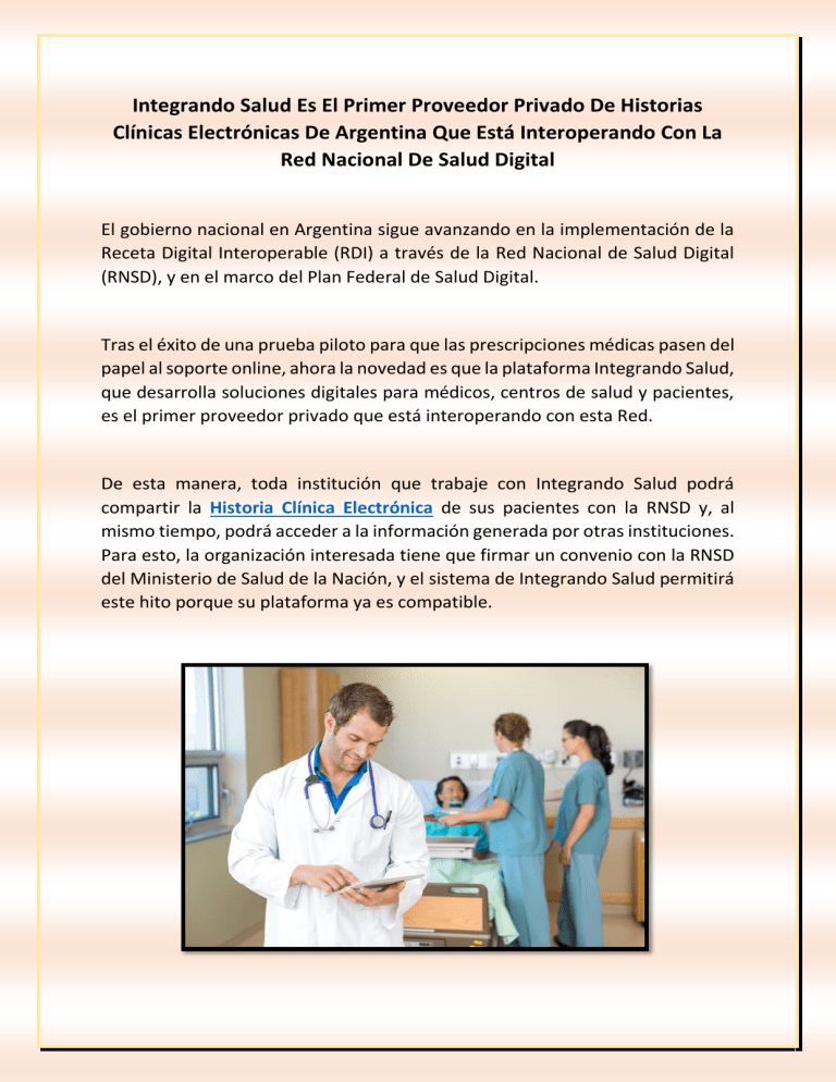 Integrando Salud Es El Primer Proveedor Privado De Historias Clínicas Electrónicas De Argentina Que Está Interoperando Con La Red Nacional De Salud Digital El gobierno nacional en Argentina sigue avanzando en la implementación de la Receta Digital Interoperable (RDI) a través de la Red Nacional de Salud Digital (RNSD), y en el marco del Plan Federal de Salud Digital. Tras el éxito de una prueba piloto para que las prescripciones médicas pasen del papel al soporte online, ahora la novedad es que la plataforma Integrando Salud, que desarrolla soluciones digitales para médicos, centros de salud y pacientes, es el primer proveedor privado que está interoperando con esta Red. De esta manera, toda institución que trabaje con Integrando Salud podrá compartir la Historia Clínica Electrónica de sus pacientes con la RNSD y, al mismo tiempo, podrá acceder a la información generada por otras instituciones. Para esto, la organización interesada tiene que firmar un convenio con la RNSD del Ministerio de Salud de la Nación, y el sistema de Integrando Salud permitirá este hito porque su plataforma ya es compatible. “La HCE es la herramienta fundamental para lograr el registro primario de los pacientes. A partir de ella es que se consiguen los datos primarios para tomar evidencia de la atención y estadísticas, entre otras particularidades”, sostuvo Fernando Nuñez, Director de Gobernanza e Integración de los Sistemas de Salud del Ministerio de Salud de la República Argentina. Y agregó: “Los registros tienen que ser oportunos, precisos, completos y homogéneos, de ahí la importancia de trabajar en esta interoperabilidad. Por eso hay que trabajar con soluciones modernas, que sean fáciles de usar para los médicos”. Acompañando al Plan Federal de Salud Digital desde el sector privado, Integrando Salud estará a cargo de la implementación del sistema de HCE en el hospital especializado de crónicos y agudos “Dr. Antonio A. Cetrángolo”, en la provincia de Buenos Aires. Esta institución será una de las primeras organizaciones clientes del ámbito público, que empezará interoperar con la RNSD a través de Integrando Salud.