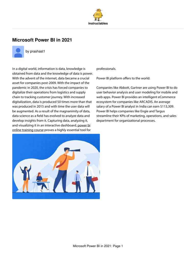 instructables Microsoft Power BI in 2021 by prashast1 In a digital world, information is data, knowledge is obtained from data and the knowledge of data is power. With the advent of the internet, data became a crucial asset for companies post-2009. With the impact of the pandemic in 2020, the crisis has forced companies to digitalize their operations from logistics and supply chain to tracking customer journey. With increased digitalization, data is produced 50 times more than that was produced in 2015 and with time the user data will be augmented. As a result of the magnanimity of data, data science as a eld has evolved to analyze data and develop insights from it. Capturing data, analyzing it, and visualizing it in an interactive dashboard, power bi online training course proves a highly essential tool for professionals. Power BI platform o ers to the world: Companies like Abbott, Gartner are using Power BI to do user behavior analysis and user modeling for mobile and web apps. Power BI provides an intelligent eCommerce ecosystem for companies like ARCADIS. An average salary of a Power BI analyst in India can earn $113,309. Power BI helps companies like Engie and Targus streamline their KPIs of marketing, operations, and sales department for organizational processes. Microsoft Power BI in 2021: Page 1