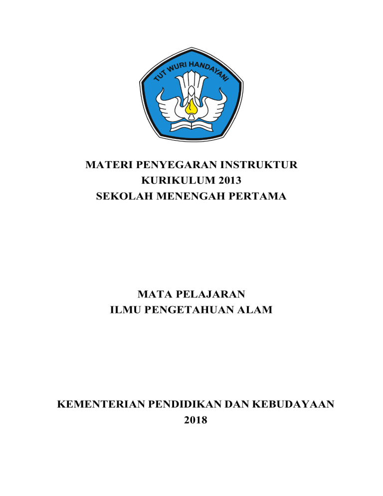 MATERI PENYEGARAN INSTRUKTUR KURIKULUM 2013 SEKOLAH MENENGAH PERTAMA MATA PELAJARAN ILMU PENGETAHUAN ALAM KEMENTERIAN PENDIDIKAN DAN KEBUDAYAAN 2018 Materi Bimbingan Teknis Kurikulum 2013 SMP Tahun 2018 KATA PENGANTAR Pasal 4 Peraturan Menteri Pendidikan dan Kebudayaan Republik Indonesia Nomor 160 Tahun 2014 tentang Pemberlakuan Kurikulum Tahun 2006 dan Kurikulum 2013 menyatakan bahwa: Satuan pendidikan dasar dan pendidikan menengah dapat melaksanakan Kurikulum Tahun 2006 paling lama sampai dengan tahun pelajaran 2019/2020. Ketentuan ini memberi kesempatan kepada sekolah yang belum siap melaksanakan K13 untuk tetap melaksanakan Kurikulum 2006 sambil melakukan persiapan- persiapan sehingga selambat-lambatnya pada tahun 2019/2020 sekolah tersebut telah mengimplementasikan K13 setelah mencapai kesiapan yang optimal. Untuk memfasilitasi sekolah (SMP) meningkatkan kompetensi kepala sekolah dan guru dan membantu sekolah mengimplementasikan K13, Direktorat PSMP menyelenggarakan bimbingan teknis dan pendampingan pelaksanaan K13 bagi SMP. Bimbingan teknis dan pendampingan pelaksanaan K13 tersebut – dengan sejumlah program pendukung lainnya – diharapkan mampu menjadikan jumlah SMP pelaksana K13 rata-rata naik 25% setiap tahun. Pada tahun 2016 ditargetkan sekitar 9.000 SMP telah melaksanakan K13, sementara tahun 2017 diharapkan 18.000 SMP (50%), tahun 2018 kurang lebih 27.000 (75%), dan tahun 2019 semua SMP (100%) di seluruh wilayah Indonesia. Berdasarkan hasil monitoring dan evaluasi pelaksanaan K13 yang dilaksanakan oleh Direktorat PSMP pada tahun 2015, masalah utama yang dihadapi oleh para guru dalam pelaksanaan K13 adalah dalam menyusun RPP, mendisain instrumen penilaian, melaksanakan pembelajaran, melakukan penilaian, dan mengolah dan melaporkan hasil penilaian. Memperhatikan hal tersebut, bimbingan teknis dan pendampingan pelaksanaan K13 pada tahun 2017 pada tingkat SMP difokuskan pada peningkatan kemampuan guru dalam merencanakan pembelajaran dan penilaian, menyajikan pembelajaran dan melaksanakan penilaian, serta mengolah dan melaporkan hasil penilaian pencapian kompetensi peserta didik. Pada tahun 2018 dengan berlakunya Peraturan Presiden Nomor 87 Tahun 2017 perlu dilakukan penyesuaian. Peraturan Presiden Nomor 87 Tahun 2017 tentang Penguatan Pendidikan Karakter (PPK) menuntut guru untuk melakukan penguatan karakter siswa yang menginternalisasikan nilai-nilai utama PPK yaitu religius, nasionalis, mandiri, gotong-royang dan integritas dalam setiap kegiatan pembelajaran yang dilaksanakan. Selain itu, untuk membangun generasi emas Indonesia, maka perlu dipersiapkan peserta didik yang memiliki keterampilan Abad 21 seperti khususnya keterampilan berpikir kritis dan memecahkan masalah (Critical Thinking and Problem Skills), keterampilan untuk bekerjasama (Collaboration), kemampuan untuk berkreativitas (Creativity), dan kemampuan untuk berkomunikasi (Communication skills). Penguatan Pendidikan Karakter merupakan platform pendidikan nasional yang memperkuat Kurikulum 2013. Modul Pelatihan Kurikulum 2013 ini telah mengintegrasikan tiga strategi implementasi Penguatan Pendidikan Karakter yaitu pendidikan karakter berbasis kelas, pendidikan karakter berbasis budaya sekolah, dan pendidikan karakter berbasis masyarakat sehingga implementasi Kurikulum 2013 menjadi bagian integral dalam penguatan pendidikan karakter, kecakapan literasi, dan HOTS. Untuk menjamin bahwa bimbingan teknis pelaksanaan K13 di semua jenjang baik nasional, provinsi, kabupaten/kota maupun sekolah sasaran mencapai hasil yang diharapkan, Direktorat PSMP menetapkan bahwa materi bimbingan teknis untuk semua jenjang tersebut menggunakan materi standar yang disusun oleh Direktorat PSMP bersama dengan Pusat Kurikulum dan Pebukuan dan Pusat Penilaian i Materi Bimbingan Teknis Kurikulum 2013 SMP Tahun 2018 Pendidikan. Materi-materi tersebut didasarkan pada dokumen-dokumen dan ketentuan-ketentuan terakhir mengenai pelaksanaan K13. Setiap unit materi terdiri atas tujuan, uraian materi, tahapan sesi bimbingan teknis, teknik penilaian peserta bimbingan teknis, dan daftar sumber-sumber bahan untuk pengayaan. Selain itu, materi dilengkapi dengan sejumlah Lembar Kerja yang memberi panduan dan/atau inspirasi kegiatan bimbingan teknis. Penyusunan materi bimbingan teknis ini terselesaikan atas peran serta berbagai pihak. Direktorat PSMP menyampaikan penghargaan yang setinggi-tingginya kepada para penyusun dan penelaah yang telah bekerja dengan sebaik-baiknya untuk menghasilkan materi bimbingan teknis yang layak. Semoga materi yang disusun ini merupakan amal baik yang tiada putus amalnya. Materi bimbingan teknis ini hendaknya dipandang sebagai bahan minimal dari bimbingan teknis yang dilaksanakan pada setiap jenjang. Selain itu, dengan dinamisnya perkembangan kurikulum, materi yang disusun ini perlu selalu disesuaikan dengan perkembangan. Akhirnya Direktorat PSMP mengharapkan materi ini digunakan sebaik-baiknya oleh pelaksana bimbingan teknis implementasi K13 pada tahun 2018 pada tingkat SMP. Masukan-masukan untuk penyempurnaan materi ini sangat diharapkan dari berbagai pihak, terutama dari para instruktur dan peserta bimbingan teknis. Jakarta, Januari 2018 Direktur Pembinaan SMP Dr. Supriano, M.Ed. NIP. 19620816 199103 1 001 ii Materi Bimbingan Teknis Kurikulum 2013 SMP Tahun 2018 DAFTAR ISI KATA PENGANTAR ............................................................................................................... i DAFTAR ISI............................................................................................................................... iii MATERI BIMBINGAN TEKNIS MATA PELAJARAN ILMU PENGETAHUAN ALAM ......................................................... 1 A. Pendahuluan ......................................................................................................................... 1 B. Rasional............................................................................................................................