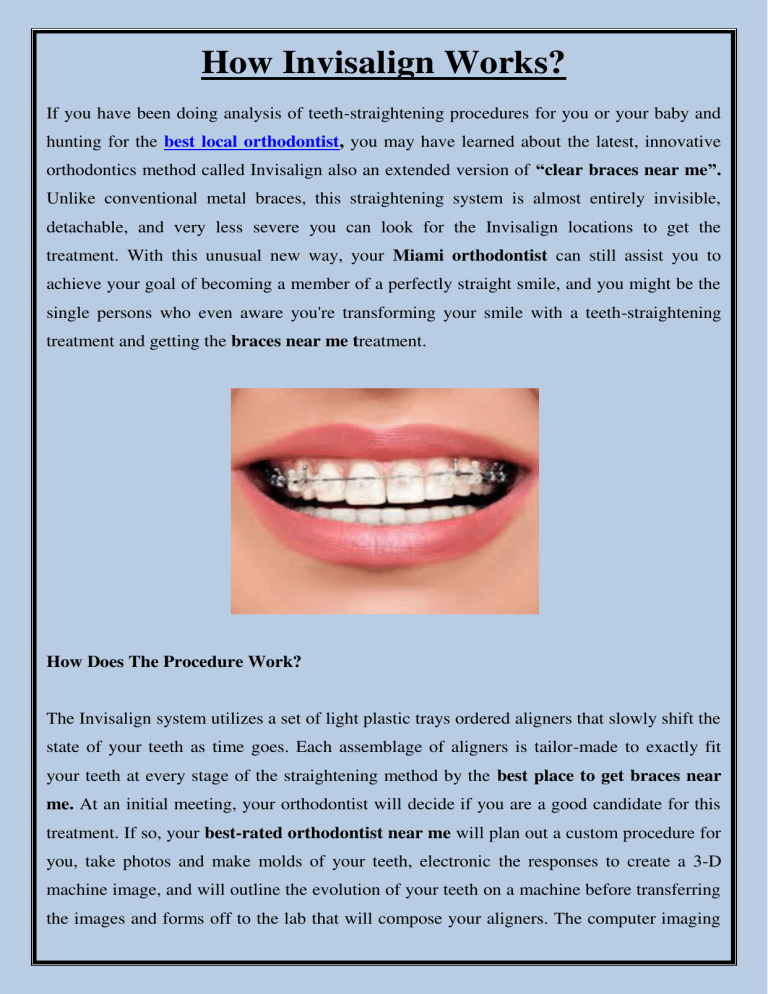 How Invisalign Works? If you have been doing analysis of teeth-straightening procedures for you or your baby and hunting for the best local orthodontist, you may have learned about the latest, innovative orthodontics method called Invisalign also an extended version of “clear braces near me”. Unlike conventional metal braces, this straightening system is almost entirely invisible, detachable, and very less severe you can look for the Invisalign locations to get the treatment. With this unusual new way, your Miami orthodontist can still assist you to achieve your goal of becoming a member of a perfectly straight smile, and you might be the single persons who even aware you're transforming your smile with a teeth-straightening treatment and getting the braces near me treatment. How Does The Procedure Work? The Invisalign system utilizes a set of light plastic trays ordered aligners that slowly shift the state of your teeth as time goes. Each assemblage of aligners is tailor-made to exactly fit your teeth at every stage of the straightening method by the best place to get braces near me. At an initial meeting, your orthodontist will decide if you are a good candidate for this treatment. If so, your best-rated orthodontist near me will plan out a custom procedure for you, take photos and make molds of your teeth, electronic the responses to create a 3-D machine image, and will outline the evolution of your teeth on a machine before transferring the images and forms off to the lab that will compose your aligners. The computer imaging allows you to see what your teeth will seem like before, during, and after the straightening process. The orthodontics practice will help create made aligners to quite fit your teeth. New technology can perform this set of aligners, 20 to 30 aligners for a full custom set given by the best orthodontist for braces near me. They will all be somewhat unusual shapes that affect your teeth with time. Normally, the patient goes onto a new collection in all two weeks or so, but your orthodontist will watch your journey with routine checkups and make some suggestions for your teeth. The only problem you can face with this treatment is the initial tongue crib. Benefits Of Invisalign Adults and teenagers likewise can get various advantages of Invisalign. First of all, the aligners are nearly clear and almost invisible. Most acceptable, no one will even see that you're using them. While all need an aligned grin, a lot of characters don't need to go through the discomfort and self-consciousness of carrying obvious metal braces, but you won't have to bother concerning that. Extra huge profit is that the aligners are detachable, so you can pull them out while having and drinking. You won't have to bother about food stuck & caught in your braces. In-room, being able to switch the aligners suggests you can clean and floss your teeth regularly and keep good oral health and fresh breath a lot simpler. To get this meet orthodontist near me brace provider.