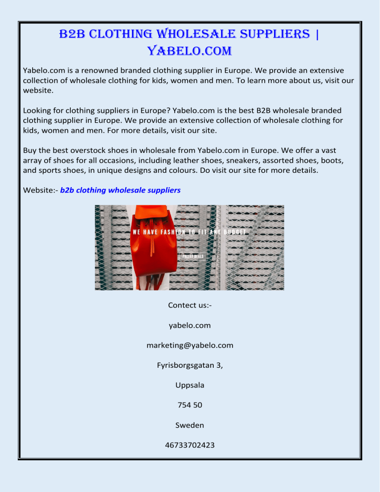 B2B Clothing Wholesale suppliers | YaBelo.Com Yabelo.com is a renowned branded clothing supplier in Europe. We provide an extensive collection of wholesale clothing for kids, women and men. To learn more about us, visit our website. Looking for clothing suppliers in Europe? Yabelo.com is the best B2B wholesale branded clothing supplier in Europe. We provide an extensive collection of wholesale clothing for kids, women and men. For more details, visit our site. Buy the best overstock shoes in wholesale from Yabelo.com in Europe. We offer a vast array of shoes for all occasions, including leather shoes, sneakers, assorted shoes, boots, and sports shoes, in unique designs and colours. Do visit our site for more details. Website:- b2b clothing wholesale suppliers Contect us:yabelo.com [email protected] Fyrisborgsgatan 3, Uppsala 754 50 Sweden 46733702423