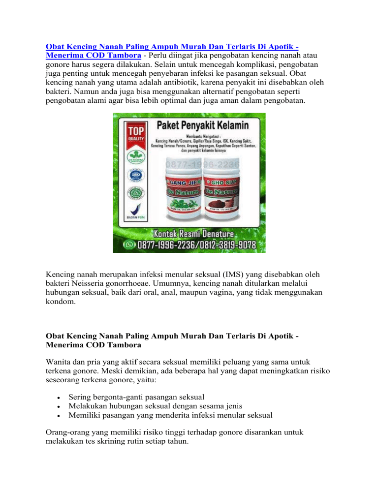 Obat Kencing Nanah Paling Ampuh Murah Dan Terlaris Di Apotik Menerima COD Tambora - Perlu diingat jika pengobatan kencing nanah atau gonore harus segera dilakukan. Selain untuk mencegah komplikasi, pengobatan juga penting untuk mencegah penyebaran infeksi ke pasangan seksual. Obat kencing nanah yang utama adalah antibiotik, karena penyakit ini disebabkan oleh bakteri. Namun anda juga bisa menggunakan alternatif pengobatan seperti pengobatan alami agar bisa lebih optimal dan juga aman dalam pengobatan. Kencing nanah merupakan infeksi menular seksual (IMS) yang disebabkan oleh bakteri Neisseria gonorrhoeae. Umumnya, kencing nanah ditularkan melalui hubungan seksual, baik dari oral, anal, maupun vagina, yang tidak menggunakan kondom. Obat Kencing Nanah Paling Ampuh Murah Dan Terlaris Di Apotik Menerima COD Tambora Wanita dan pria yang aktif secara seksual memiliki peluang yang sama untuk terkena gonore. Meski demikian, ada beberapa hal yang dapat meningkatkan risiko seseorang terkena gonore, yaitu: Sering bergonta-ganti pasangan seksual Melakukan hubungan seksual dengan sesama jenis Memiliki pasangan yang menderita infeksi menular seksual Orang-orang yang memiliki risiko tinggi terhadap gonore disarankan untuk melakukan tes skrining rutin setiap tahun. Gejala Kencing Nanah Masa inkubasi kencing nanah sangat singkat. Pada pria umumnya hanya berkisar antara 2-5 hari, meskipun terkadang bisa bisa juga berlangsung lebih lama. Namun pada wanita, masa inkubasi sulit untuk ditentukan. Sebab pada umumnya infeksi kencing nanah ini tidak menimbulkan gejala. Gejala kencing nanah pada pria awalnya muncul rasa gatal dan panas di sekitar uretra (saluran yang menghantarkan urine dari kandung kemih ke luar tubuh). Selanjutnya, timbul rasa nyeri saat buang air kecil dan keluar cairan kental berwarna keruh (nanah) dari ujung uretra. Kadang-kadang bisa disertai darah. Bila infeksi sudah semakin lanjut, nyeri akan semakin buruk dan cairan semakin kental serta keruh. Selain itu, juga akan muncul rasa nyeri saat ereksi. Terkadang bisa disertai pembesaran kelenjar getah bening di selangkangan. Sedangkan gejala kencing nanah pada wanita (kalaupun ada) dapat sangat ringan hingga penderitanya tidak menyadarinya. Sebanyak 30-60% wanita penderita kencing nanah tidak merasakan gejala apapun. Gejala yang mungkin timbul dapat berupa nyeri saat buang air kecil, buang air kecil menjadi lebih sering, dan kadangkadang menimbulkan rasa nyeri pada panggul bawah. Selain itu, terdapat cairan kental dan keruh yang keluar dari vagina. Komplikasi Kencing Nanah Kencing nanah dapat memicu terjadinya komplikasi berupa infertilitas/ kemandulan, baik pada pria maupun wanita. Pada wanita, infeksi kencing nanah yang tidak diobati atau tidak mendapat pengobatan hingga tuntas, dapat menyebar dari serviks (leher rahim) menuju uterus (rahim), tuba falopi (saluran telur), dan ovarium (indung telur) dan menyebabkan penyakit radang panggul. Penyakit tersebut dapat menyebabkan kemandulan maupun komplikasi pada kehamilan dan persalinan. Sementara itu, pada pria, infeksi kencing nanah dapat menyebar melalui saluran kencing (uretra) menuju testis, epididimis, dan merusak proses pembentukan sperma di dalamnya. Selain itu, kencing nanah juga dapat menyerang kelenjar prostat. Bakteri penyebab kencing nanah juga dapat menyebar melalui darah menuju area lain di tubuh, termasuk sendi. Infeksi sistemik ini dapat menyebabkan demam, ruam merah pada kulit, nyeri sendi, dan lain-lain. Pengobatan Kencing Nanah Pengobatan kencing nanah dapat dilakukan dengan menggunakan antibiotik. Selain menggunakan antibiotik, penyakit ini juga bisa diobati secara alami. Salah pengobatan alami yang terpercaya yaitu menggunakan obat herbal. Tetapi jika anda ingin menggunakan antibiotik maka anda harus berkonsultasi terlebih dahulu ke dokter dan meminta resep yang sesuai. Tetapi jika anda ingin menggunakan obat herbal maka carilah obat herbal yang telah memenuhi standar keamanan seperti Resmi BPOM, Hallal MUI dan alangkah lebih baiknya jika sudah memiliki Sertifikat ISO 9001:2015. Obat Kencing Nanah Paling Ampuh Murah Dan Terlaris Di Apotik Menerima COD Tambora BAIK DIGUNAKAN UNTUK MEMBANTU : - Mengobati Sipilis/Rajasinga/Gonore/Kencing Nanah/Infeksi Saluran Kemih - Sebagai Antivirus dan Antibakteri - Memperbaiki jaringan sel pada bagian uretric - Memulihkan stamina - Menjaga kesehatan - Mengobati Saluran Kencing Paket Gang Jie Gho Siah De Nature merupakan produk eksklusif dari De Nature dengan POM. TR : - Gang Jie POM.TR 173 300 491 - Gho Siah POM.TR 173 305 881 KOMPOSISI: Gang Jie : - Orthosiphon stamineus folium 1250mg - Imperatae cylindrica rhozoma 625mg - Andrographis paniculata folium 625mg Gho Siah : - Lumbricus rubellus ekstrak 500mg Sekedar informasi untuk kenyamanan Konsumen, bahwa Produk dari perusahaan kami ini sudah memiliki: - Ijin Resmi Perusahaan dari Kementerian Kesehatan - Ijin BPOM, yang artinya sudah lulus uji stabilitas Produk - Sertifikat Halal MUI, sehingga kehalalannya bisa dipertanggungjawabkan - Apoteker Yang berpengalaman - Sudah melewati Proses Sortir Bahan Baku, Guna Menjaga Mutu Produk - Proses Produksi Sesuai Alur CPOTB (Cara Pembuatan Obat Tradisional Yang Baik Dan Benar) - Sertifikat ISO 9001 : 2015 yang artinya sudah Berstandar Internasional Semoga artikel ini bermanfaat untuk semuanya dan khususnya bagi anda yang sedang mencari informasi mengenai Obat Kencing Nanah Paling Ampuh Murah Dan Terlaris Di Apotik - Menerima COD Tambora. Informasi lebih lengkap bisa hubungi nomor yang tertera pada gambar di atas. Penelusuran yang terkait dengan Obat Kencing Nanah Paling Ampuh Murah Dan Terlaris Di Apotik - Menerima COD Tambora : obat kencing nanah di apotik dan harganya, harga obat kencing nanah di apotik kimia farma, obat kencing nanah di apotik terdekat, antibiotik untuk kencing nanah, gang jie obat kencing nanah, harga obat kencing nanah di apotik, apakah bisa sembuh sendiri kencing nanah, cara mengobati kencing nanah dengan bawang putih, cara alami