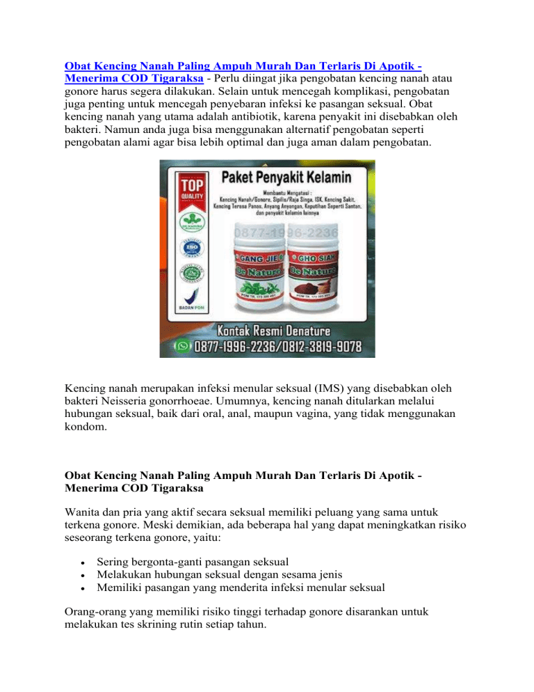 Obat Kencing Nanah Paling Ampuh Murah Dan Terlaris Di Apotik Menerima COD Tigaraksa - Perlu diingat jika pengobatan kencing nanah atau gonore harus segera dilakukan. Selain untuk mencegah komplikasi, pengobatan juga penting untuk mencegah penyebaran infeksi ke pasangan seksual. Obat kencing nanah yang utama adalah antibiotik, karena penyakit ini disebabkan oleh bakteri. Namun anda juga bisa menggunakan alternatif pengobatan seperti pengobatan alami agar bisa lebih optimal dan juga aman dalam pengobatan. Kencing nanah merupakan infeksi menular seksual (IMS) yang disebabkan oleh bakteri Neisseria gonorrhoeae. Umumnya, kencing nanah ditularkan melalui hubungan seksual, baik dari oral, anal, maupun vagina, yang tidak menggunakan kondom. Obat Kencing Nanah Paling Ampuh Murah Dan Terlaris Di Apotik Menerima COD Tigaraksa Wanita dan pria yang aktif secara seksual memiliki peluang yang sama untuk terkena gonore. Meski demikian, ada beberapa hal yang dapat meningkatkan risiko seseorang terkena gonore, yaitu: Sering bergonta-ganti pasangan seksual Melakukan hubungan seksual dengan sesama jenis Memiliki pasangan yang menderita infeksi menular seksual Orang-orang yang memiliki risiko tinggi terhadap gonore disarankan untuk melakukan tes skrining rutin setiap tahun. Gejala Kencing Nanah Masa inkubasi kencing nanah sangat singkat. Pada pria umumnya hanya berkisar antara 2-5 hari, meskipun terkadang bisa bisa juga berlangsung lebih lama. Namun pada wanita, masa inkubasi sulit untuk ditentukan. Sebab pada umumnya infeksi kencing nanah ini tidak menimbulkan gejala. Gejala kencing nanah pada pria awalnya muncul rasa gatal dan panas di sekitar uretra (saluran yang menghantarkan urine dari kandung kemih ke luar tubuh). Selanjutnya, timbul rasa nyeri saat buang air kecil dan keluar cairan kental berwarna keruh (nanah) dari ujung uretra. Kadang-kadang bisa disertai darah. Bila infeksi sudah semakin lanjut, nyeri akan semakin buruk dan cairan semakin kental serta keruh. Selain itu, juga akan muncul rasa nyeri saat ereksi. Terkadang bisa disertai pembesaran kelenjar getah bening di selangkangan. Sedangkan gejala kencing nanah pada wanita (kalaupun ada) dapat sangat ringan hingga penderitanya tidak menyadarinya. Sebanyak 30-60% wanita penderita kencing nanah tidak merasakan gejala apapun. Gejala yang mungkin timbul dapat berupa nyeri saat buang air kecil, buang air kecil menjadi lebih sering, dan kadangkadang menimbulkan rasa nyeri pada panggul bawah. Selain itu, terdapat cairan kental dan keruh yang keluar dari vagina. Komplikasi Kencing Nanah Kencing nanah dapat memicu terjadinya komplikasi berupa infertilitas/ kemandulan, baik pada pria maupun wanita. Pada wanita, infeksi kencing nanah yang tidak diobati atau tidak mendapat pengobatan hingga tuntas, dapat menyebar dari serviks (leher rahim) menuju uterus (rahim), tuba falopi (saluran telur), dan ovarium (indung telur) dan menyebabkan penyakit radang panggul. Penyakit tersebut dapat menyebabkan kemandulan maupun komplikasi pada kehamilan dan persalinan. Sementara itu, pada pria, infeksi kencing nanah dapat menyebar melalui saluran kencing (uretra) menuju testis, epididimis, dan merusak proses pembentukan sperma di dalamnya. Selain itu, kencing nanah juga dapat menyerang kelenjar prostat. Bakteri penyebab kencing nanah juga dapat menyebar melalui darah menuju area lain di tubuh, termasuk sendi. Infeksi sistemik ini dapat menyebabkan demam, ruam merah pada kulit, nyeri sendi, dan lain-lain. Pengobatan Kencing Nanah Pengobatan kencing nanah dapat dilakukan dengan menggunakan antibiotik. Selain menggunakan antibiotik, penyakit ini juga bisa diobati secara alami. Salah pengobatan alami yang terpercaya yaitu menggunakan obat herbal. Tetapi jika anda ingin menggunakan antibiotik maka anda harus berkonsultasi terlebih dahulu ke dokter dan meminta resep yang sesuai. Tetapi jika anda ingin menggunakan obat herbal maka carilah obat herbal yang telah memenuhi standar keamanan seperti Resmi BPOM, Hallal MUI dan alangkah lebih baiknya jika sudah memiliki Sertifikat ISO 9001:2015. Obat Kencing Nanah Paling Ampuh Murah Dan Terlaris Di Apotik Menerima COD Tigaraksa BAIK DIGUNAKAN UNTUK MEMBANTU : - Mengobati Sipilis/Rajasinga/Gonore/Kencing Nanah/Infeksi Saluran Kemih - Sebagai Antivirus dan Antibakteri - Memperbaiki jaringan sel pada bagian uretric - Memulihkan stamina - Menjaga kesehatan - Mengobati Saluran Kencing Paket Gang Jie Gho Siah De Nature merupakan produk eksklusif dari De Nature dengan POM. TR : - Gang Jie POM.TR 173 300 491 - Gho Siah POM.TR 173 305 881 KOMPOSISI: Gang Jie : - Orthosiphon stamineus folium 1250mg - Imperatae cylindrica rhozoma 625mg - Andrographis paniculata folium 625mg Gho Siah : - Lumbricus rubellus ekstrak 500mg Sekedar informasi untuk kenyamanan Konsumen, bahwa Produk dari perusahaan kami ini sudah memiliki: - Ijin Resmi Perusahaan dari Kementerian Kesehatan - Ijin BPOM, yang artinya sudah lulus uji stabilitas Produk - Sertifikat Halal MUI, sehingga kehalalannya bisa dipertanggungjawabkan - Apoteker Yang berpengalaman - Sudah melewati Proses Sortir Bahan Baku, Guna Menjaga Mutu Produk - Proses Produksi Sesuai Alur CPOTB (Cara Pembuatan Obat Tradisional Yang Baik Dan Benar) - Sertifikat ISO 9001 : 2015 yang artinya sudah Berstandar Internasional Semoga artikel ini bermanfaat untuk semuanya dan khususnya bagi anda yang sedang mencari informasi mengenai Obat Kencing Nanah Paling Ampuh Murah Dan Terlaris Di Apotik - Menerima COD Tigaraksa. Informasi lebih lengkap bisa hubungi nomor yang tertera pada gambar di atas. Penelusuran yang terkait dengan Obat Kencing Nanah Paling Ampuh Murah Dan Terlaris Di Apotik - Menerima COD Tigaraksa : obat kencing nanah di apotik dan harganya, harga obat kencing nanah di apotik kimia farma, obat kencing nanah di apotik terdekat, antibiotik untuk kencing nanah, gang jie obat kencing nanah, harga obat kencing nanah di apotik, apakah bisa sembuh sendiri kencing nanah, cara mengobati kencing nanah dengan bawang putih, 