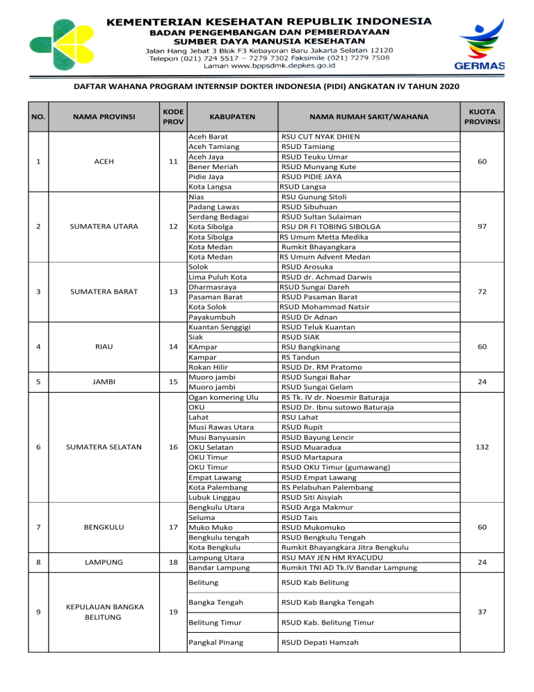 DAFTAR WAHANA PROGRAM INTERNSIP DOKTER INDONESIA (PIDI) ANGKATAN IV TAHUN 2020 NO. NAMA PROVINSI KODE PROV 1 ACEH 11 2 SUMATERA UTARA 12 3 SUMATERA BARAT 13 4 RIAU 14 5 JAMBI 15 6 SUMATERA SELATAN 16 7 BENGKULU 17 8 LAMPUNG 18 9 KEPULAUAN BANGKA BELITUNG KABUPATEN NAMA RUMAH SAKIT/WAHANA Aceh Barat Aceh Tamiang Aceh Jaya Bener Meriah Pidie Jaya Kota Langsa Nias Padang Lawas Serdang Bedagai Kota Sibolga Kota Sibolga Kota Medan Kota Medan Solok Lima Puluh Kota Dharmasraya Pasaman Barat Kota Solok Payakumbuh Kuantan Senggigi Siak KAmpar Kampar Rokan Hilir Muoro jambi Muoro jambi Ogan komering Ulu OKU Lahat Musi Rawas Utara Musi Banyuasin OKU Selatan OKU Timur OKU Timur Empat Lawang Kota Palembang Lubuk Linggau Bengkulu Utara Seluma Muko Muko Bengkulu tengah Kota Bengkulu Lampung Utara Bandar Lampung RSU CUT NYAK DHIEN RSUD Tamiang RSUD Teuku Umar RSUD Munyang Kute RSUD PIDIE JAYA RSUD Langsa RSU Gunung Sitoli RSUD Sibuhuan RSUD Sultan Sulaiman RSU DR FI TOBING SIBOLGA RS Umum Metta Medika Rumkit Bhayangkara RS Umum Advent Medan RSUD Arosuka RSUD dr. Achmad Darwis RSUD Sungai Dareh RSUD Pasaman Barat RSUD Mohammad Natsir RSUD Dr Adnan RSUD Teluk Kuantan RSUD SIAK RSU Bangkinang RS Tandun RSUD Dr. RM Pratomo RSUD Sungai Bahar RSUD Sungai Gelam RS Tk. IV dr. Noesmir Baturaja RSUD Dr. Ibnu sutowo Baturaja RSU Lahat RSUD Rupit RSUD Bayung Lencir RSUD Muaradua RSUD Martapura RSUD OKU Timur (gumawang) RSUD Empat Lawang RS Pelabuhan Palembang RSUD Siti Aisyiah RSUD Arga Makmur RSUD Tais RSUD Mukomuko RSUD Bengkulu Tengah Rumkit Bhayangkara Jitra Bengkulu RSU MAY JEN HM RYACUDU Rumkit TNI AD Tk.IV Bandar Lampung Belitung RSUD Kab Belitung Bangka Tengah RSUD Kab Bangka Tengah 19 KUOTA PROVINSI 60 97 72 60 24 132 60 24 37 Belitung Timur RSUD Kab. Belitung Timur Pangkal Pinang RSUD Depati Hamzah DAFTAR WAHANA PROGRAM INTERNSIP DOKTER INDONESIA (PIDI) ANGKATAN IV TAHUN 2020 NO. NAMA PROVINSI KODE PROV 10 KEPULAUAN RIAU 20 11 DKI JAKARTA 31 KABUPATEN Karimun Karimun Natuna Kota Batam Tanjung Pinang Kota Batam Jakarta Selatan Jakarta Timur Jakarta Timur Jakarta Selatan Jakarta Pusat Jakarta Pusat 12 JAWA BARAT 32 Jakarta Barat Jakarta Utara Bogor Bogor Sukabumi Cianjur Kota Cimahi Garut Tasikmalaya Cirebon Cirebon Majalengka Majalengka Sumedang Indramayu Purwakarta Bekasi Kota Bekasi Bogor Kota Bogor Kota Sukabumi Kota Sukabumi Kota Cirebon Kota Bekasi Kota Depok NAMA RUMAH SAKIT/WAHANA RSUD M.Sani Kabupaten Karimun RSU Bhakti Timah Karimun RSUD Natuna RS Budi Kemuliaan Batam RSUD Kota Tanjung Pinang RS Santa Elisabeth Lubuk Baja RSUD Pasar Minggu RSUD Budhi Asih RS Pusdikkes Kodiklat TNI AD RSU Adhyaksa RS AL dr Mintoharjo Rumah Sakit Darurat Penanganan COVID-19 Wisma Atlet Kemayoran RSUD Cengkareng RSUD Koja RSUD LEUWILIANG RSUD Cileungsi RSUD Sekarwangi RSUD Cianjur RS Umum Mitra Kasih RSUD PAMEUNGPEUK KAB. GARUT RSUD Kabupaten Tasikmalaya RSUD Waled Kabupaten Cirebon RSU Sumber Waras RSUD Majalengka RSUD Cideres RSUD Sumedang RSUD Indramayu RS Umum Rama Hadi RSUD Kab. Bekasi RS Umum Permata Cibubur RS AU Atang Sanjaya Bogor RUMKIT TK IV SALAK BOGOR RS Umum Bhayangkara Setukpa Lemdikpol RS Umum Assyifa Sukabumi RSUD Gunung Jati RS Mekar Sari Bekasi RSUD Kota Depok KUOTA PROVINSI 69 153 276 DAFTAR WAHANA PROGRAM INTERNSIP DOKTER INDONESIA (PIDI) ANGKATAN IV TAHUN 2020 NO. NAMA PROVINSI KODE PROV 13 JAWA TENGAH 33 14 DI YOGYAKARTA 34 KABUPATEN Pemalang Banyumas Kebumen Kebumen Kebumen Kebumen Kebumen Magelang Boyolali Klaten Wonogiri Karanganyar Karanganyar Sragen Sragen Grobogan Blora Pati Demak Semarang Semarang Temanggung Temanggung Kendal Kendal Pekalongan Pekalongan Kota Pekalongan Tegal Kota Magelang Kota Salatiga Kota Semarang Kota Semarang Tegal Sleman Bantul Bantul Bantul Bantul Sleman NAMA RUMAH SAKIT/WAHANA RS Siaga Medika RSU Siaga Medika Banyumas RS Permata Medika RS Palang Biru Gombong RSU PKU Muhammadiyah Gombong RS PKu Muhammadiyah Sruweng RSUD Prembun RS Aisyiyah Muntilan RSUD Simo RS PKU Muhammadiyah Delanggu Klaten RSU Muhammadiyah Selogiri RSU Lanuma Adisumarmo RSU PKU Muhammadiyah Karanganyar RSUD dr. Soehadi Prijonegoro RSUD Dr. Soeratno Gemolong RS PKU Muhammadiyah Gubug RS Dr.R.Soeprapto Cepu RSUD Kayen Pati RSU Sunan Kalijaga RSUD Ungaran RS Ken Saras RS Ngesti Waluyo RS PKU Muhammadiyah Temanggung RSUD Dr. H. Soewondo RS Islam Kendal RS PKU Muh Pekajangan Pekalongan RSUD Kajen Kab. Pekalongan RSU Bendan Kota Pekalongan RSUD Suradadi Rumkit Tk II dr. Soejono Kesdam IV RST Tk IV dr. Asmir RS Roemani RS Bhayangkara Tk. III Semarang RS Mitra Siaga RS Queen Latifa RSUD PANEMBAHAN SENOPATI BANTUL RS PKU Muhammadiyah Bantul RSU Nur Hidayah RSU Rajawali Citra RS PKU Muhammadiyah Gamping KUOTA PROVINSI 408 90 DAFTAR WAHANA PROGRAM INTERNSIP DOKTER INDONESIA (PIDI) ANGKATAN IV TAHUN 2020 NO. 15 NAMA PROVINSI JAWA TIMUR KODE PROV 35 16 BANTEN 36 17 BALI 51 KABUPATEN NAMA RUMAH SAKIT/WAHANA Pacitan Ponorogo Ponorogo Ponorogo Tulungagung Malang Malang Malang Malang Malang Jember Jember Jember Probolinggo Mojokerto Jombang Nganjuk Nganjuk RSUD dr. Darsono Kab. Pacitan RS Aisyiah Ponorogo RSU Darmayu Ponorogo RSU Muhammadiyah Ponorogo RS Bhayangkara Tulungagung RS Bala Keselamatan Bokor Turen RSU Kanjuruhan Kepanjen RS Wava Husada RSAU dr M. Abdurrachman Saleh RSU Islam Gondang Legi RSUD Kalisat RSUD Balung RS Citra Husada Jember RS Wonolangan Probolinggo RSUD RA.Basoeni RS Kristen Mojowarmo RSU Kertosono RS Bhayangkara Moestadjab Ngajuk Bojonegoro RS Muhammadiyah Sumberejo Bojonegoro Tuban Lamongan Lamongan Gresik Gresik Gresik Samapang Pamekasan Kota Blitar Kota Madiun Kota Batu Kota Batu Pandeglang Lebak Lebak Kota Tangerang Tabanan Tabanan Tabanan Badung Badung Gianyar Gianyar Karangasem Buleleng Buleleng Buleleng Kota Denpasar Kota Denpasar Kota Denpasar Kota Denpasar Kota Denpasar RSU Nahdatul Ulama Tuban RSUD DR SOEGIRI LAMONGAN RSU Suyudi Paciran RS Muhammadiyah Gresik RS Grha Husada Gresik RSU Fathma Medika RSUD Sampang RSUD Dr. H. Slamet Martodirdjo RSUD MARDI WALUYO RSI SITI AISYAH 