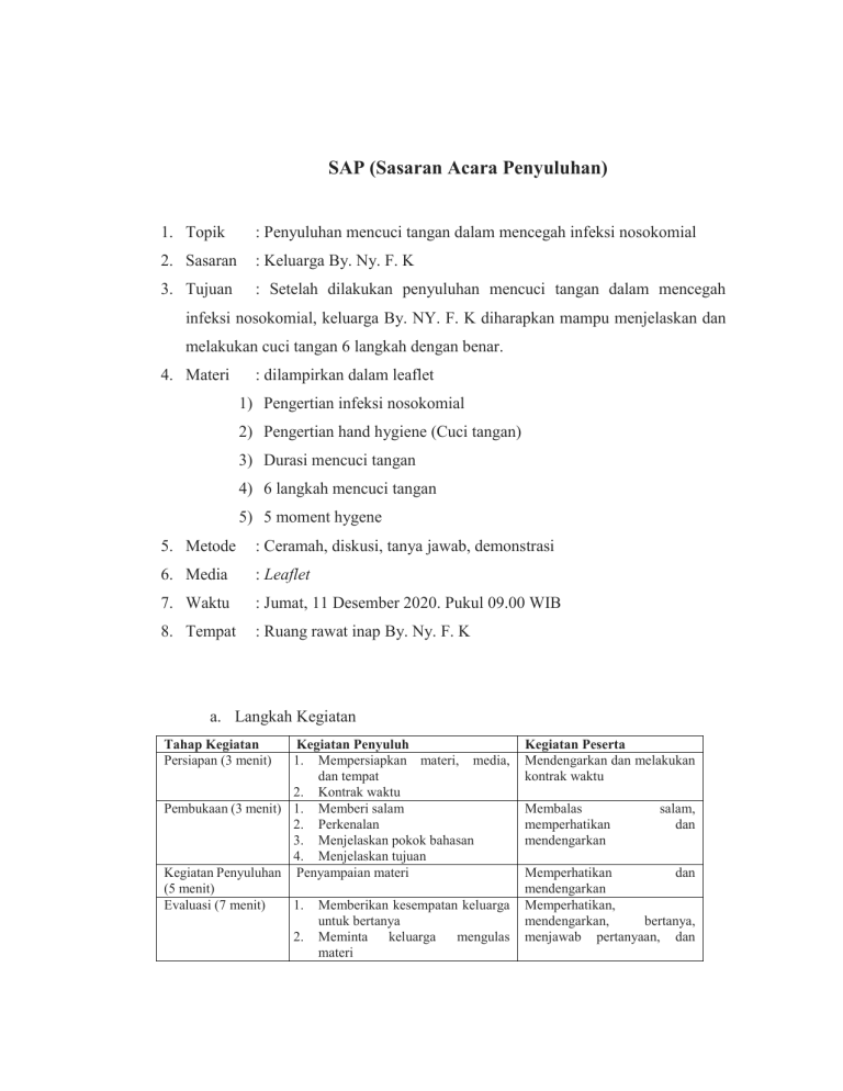 SAP (Sasaran Acara Penyuluhan) 1. Topik : Penyuluhan mencuci tangan dalam mencegah infeksi nosokomial 2. Sasaran : Keluarga By. Ny. F. K 3. Tujuan : Setelah dilakukan penyuluhan mencuci tangan dalam mencegah infeksi nosokomial, keluarga By. NY. F. K diharapkan mampu menjelaskan dan melakukan cuci tangan 6 langkah dengan benar. 4. Materi : dilampirkan dalam leaflet 1) Pengertian infeksi nosokomial 2) Pengertian hand hygiene (Cuci tangan) 3) Durasi mencuci tangan 4) 6 langkah mencuci tangan 5) 5 moment hygene 5. Metode : Ceramah, diskusi, tanya jawab, demonstrasi 6. Media : Leaflet 7. Waktu : Jumat, 11 Desember 2020. Pukul 09.00 WIB 8. Tempat : Ruang rawat inap By. Ny. F. K a. Langkah Kegiatan Tahap Kegiatan Persiapan (3 menit) Kegiatan Penyuluh 1. Mempersiapkan materi, media, dan tempat 2. Kontrak waktu Pembukaan (3 menit) 1. Memberi salam 2. Perkenalan 3. Menjelaskan pokok bahasan 4. Menjelaskan tujuan Kegiatan Penyuluhan Penyampaian materi (5 menit) Evaluasi (7 menit) 1. Memberikan kesempatan keluarga untuk bertanya 2. Meminta keluarga mengulas materi Kegiatan Peserta Mendengarkan dan melakukan kontrak waktu Membalas memperhatikan mendengarkan salam, dan Memperhatikan dan mendengarkan Memperhatikan, mendengarkan, bertanya, menjawab pertanyaan, dan 3. Penutup (2 menit) Memberikan pertanyaan kepada keluarga 4. Memberikan kesempatan untuk mendemonstrasikan 6 langkah mencuci tangan 1. Menyimpulkan materi 2. Memberi salam 3. Menutup kegiatan mendemonstrasikan 6 langkah mencuci tangan Memperhatikan, mendengarkan, dan membalas salam. b. Evaluasi : Keluarga mampu menjelaskan dan melakukan cuci tangan 6 langkah. 1. Media yang digunakan: dilampirkan