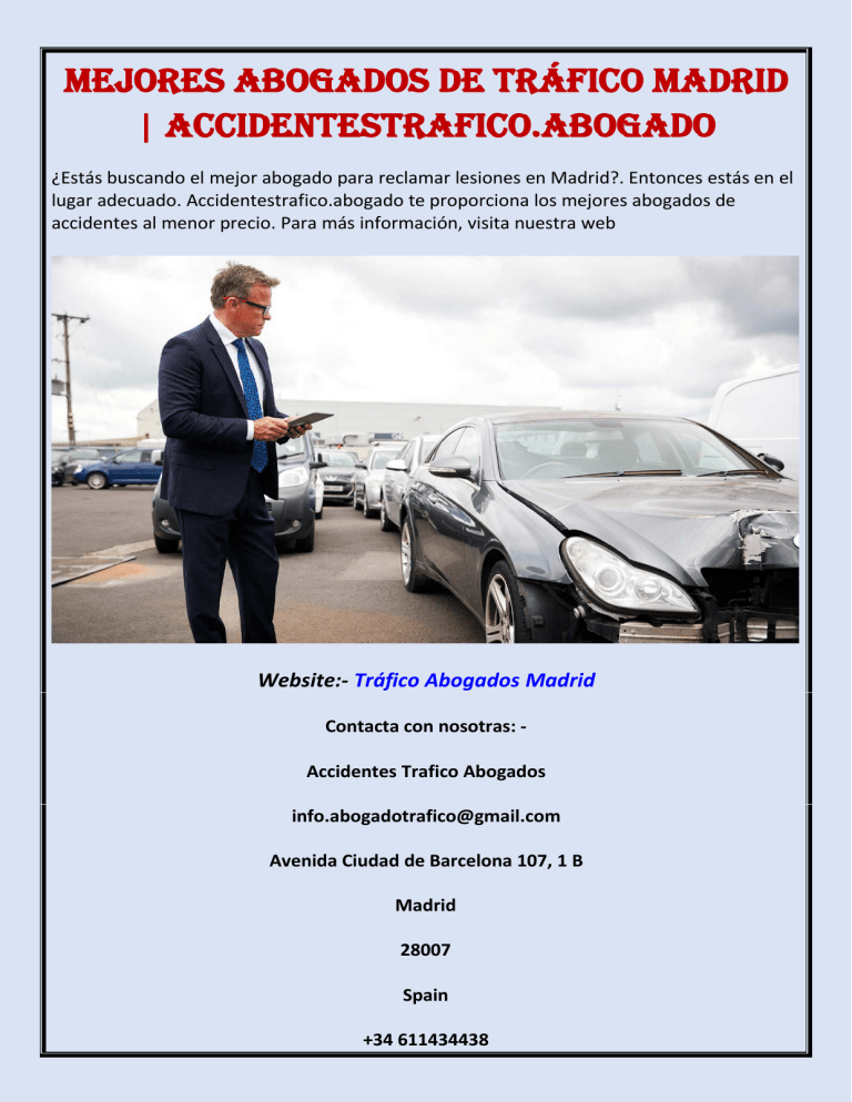 Mejores abogados de tráfico Madrid | accidentestrafico.abogado ¿Estás buscando el mejor abogado para reclamar lesiones en Madrid?. Entonces estás en el lugar adecuado. Accidentestrafico.abogado te proporciona los mejores abogados de accidentes al menor precio. Para más información, visita nuestra web Website:- Tráfico Abogados Madrid Contacta con nosotras: Accidentes Trafico Abogados [email protected] Avenida Ciudad de Barcelona 107, 1 B Madrid 28007 Spain +34 611434438