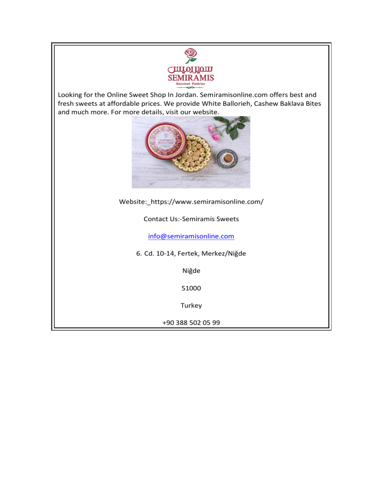 Looking for the Online Sweet Shop In Jordan. Semiramisonline.com offers best and fresh sweets at affordable prices. We provide White Ballorieh, Cashew Baklava Bites and much more. For more details, visit our website. Website:_https://www.semiramisonline.com/ Contact Us:-Semiramis Sweets [email protected] 6. Cd. 10-14, Fertek, Merkez/Niğde Niğde 51000 Turkey +90 388 502 05 99