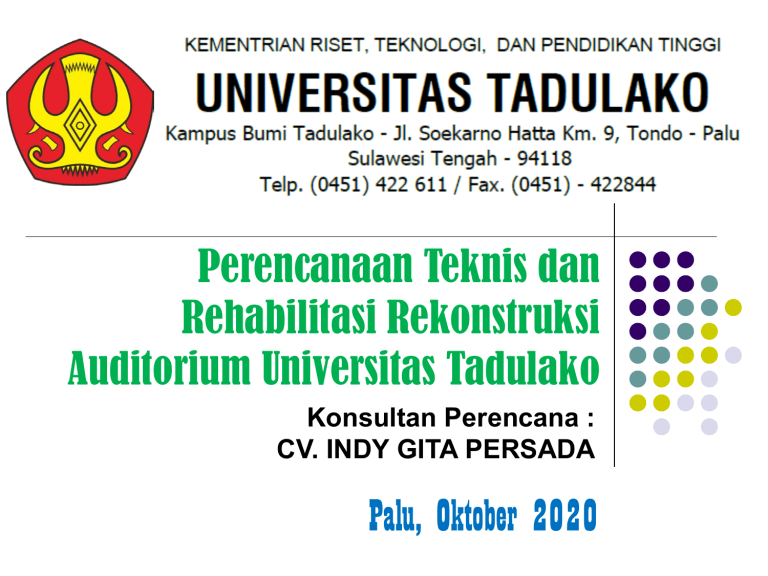 Perencanaan Teknis dan Rehabilitasi Rekonstruksi Auditorium Universitas Tadulako Konsultan Perencana : CV. INDY GITA PERSADA Palu, Oktober 2020 Pengantar Pada tanggal 28 September 2018, terjadi bencana gempa bumi berkekuatan 7,5 Mw diikuti dengan tsunami yang melanda kota Palu, dan Donggala dan liquifaksi yang terjadi di Kota Palu (Balaroa dan Petobo) dan di Kabupaten Sigi (Jonooge dan Sibalaya). Pusat gempa berada di 26 km utara Donggala dan 80 km arah Utara dari kota Palu dengan kedalaman 10 km. Guncangan gempa dengan skala kekuatan mencapai VI – VIII skala Modified Mercalli Intensity (MMI), dengan intensitas maksimum IX MMI, berbagai bangunan rumah, pusat perbelanjaan, hotel, rumah sakit, sarana ibadah, jembatan dan bangunan lainnya ambruk sebagian atau seluruhnya. Peraturan Perencanaan Bangunan Tahan Gempa , pada dasarnya memiliki dua tujuan : • Untuk melindungi jiwa manusia terhadap bencana gempa bumi yang kuat, dengan memberikan integritas, kekuatan dan ketahanan pada bangunan sehingga keruntuhan sebahagian dan seluruhnya dapat dihindari. • Mencakup pembatasan kerugian harta benda dan gangguan kelancaran fungsi bangunan, apabila terkena gempa Pengantar . Untuk mencapai kedua tujuan tersebut, terdapat tiga falsafah umum untuk perencanaan bangunan tahan gempa , falsafah tersebut adalah sebagai berikut : • Mencegah kerusakan struktur dan non struktur suatu bangunan bila terkena gempa ringan ( struktur tidak boleh mengalami kerusakan akibat gempa ringan dengan perioda 20 s/d 50 tahun ) • Mencegah kerusakan struktur serta meminimasi kerusakan non struktur, bila terkena gempa bumi sedang / moderate earthquake ( struktur boleh mengalami kerusakan ringan tapi masih dapat diperbaiki, gempa sedang dengan periode 50 s/d 150 tahun ) . • Mencegah keruntuhan sebagian atau total suatu bangunan, bila terkena gempa bumi kuat ( struktur akan mengalami kerusakan berat akan tetapi tidak boleh runtuh ) , gempa kuat adalah gempa dengan Probability sebesar 10% dalam 50 tahun. Sesar Palu – Koro Arah Pergerakan Sesar Palu – Koro - Secara Geomorfologi Sesar Palu Koro Sesar Geser Mengiri (left lateral slip) - Sesar Palu - Koro Laju geser (sliprate) 20-40 mm/thn (PusGen 2017) Kejadian Gempa 1923 – 28-12-2018 (Kota Palu dan sekitarnya) 8,5 28-09-2018 8 7,5 7,5 Richter Scale 7 6,5 6 5,5 5 4,5 4 1920 1923 1930 1940 1950 1960 1970 Tahun 1980 1990 2000 2010 2020 Gempa Palu 28 09 2018 Gempa Palu 28 Sept 2018 (USGS - USA) Gempa Palu 28 09 2018 https://earthquake.usgs.gov/earthquakes/ Skala MMI https://earthquake.usgs.gov/earthquakes/ Fenomena supershear Rambatan gempa patahan Palu-Koro 150 KM dalam waktu 35 detik atau 4,1 km/detik Average rupture speed estimate 4.10±0.15 km/sec (Nature Geoscience volume 12, pages 200–205 - 2019) Zona/Wilayah Gempa Indonesia SNI - 1726.2002 Palu Zona/Wilayah Gempa Indonesia SNI - 1726.2012 Kota Palu, Sesar Palu-Koro 2.0 - 2.5 g Spectra Acceleration (g)Period (second) Design and Recorded Response Spectra at Palu 2.50 Response spectra of ground motion MCE in the Building Code SNI 1726-2012 R 2.00 Design response spectra in the Building Code SNI 1726-2012 1.50 1.00 (Sigit Pramono) Palu UD Palu NS Palu EW Response spectra of recorded ground motions at Palu Geophysics Station 0.50 0.00 0 0.5 1 Sumber : Prof. Masyhur Irsyam 2.5 1.5 2 Period (second) 3 3.5 4 Respons Spektrum Kota Palu SNI 03-1726-2002 dan SNI 03-1726-2012 1,6 Batuan_SNI-2012 Tanah_Keras_SNI-2012 Percepatan Respons Spectrum SA (g) 1,4 SNI 03-1726-2012 Tanah_Sedang_SNI-2012 Tanah_Lunak_SNI-2012 1,2 Tanah_Keras_SNI-2002 Tanah_Sedang_SNI-2002 1 Tanah_Lunak_SNI-2002 0,8 SNI 03-1726-2002 0,6 0,4 0,2 0 0 0,5 1 1,5 2 2,5 Periode (T), Detik 3 3,5 4 1. Kerusakan Bangunan di Jalur Patahan/ Sesar Palu-Koro (Palu Koro Fault) Desa Lende Panjang Patahan kurang lebih 140 km - 150 km dari Pusat Gempa Desa Lende Kec. Sirenja - Desa Boladangko Kec. Kulawi Desa Boladangko A preliminary report on the M7.5 Palu earthquake co-seismic ruptures and landslides using image correlation techniques on optical satellite data Sotiris Valkaniotis, Athanassios Ganas, Varvara Tsironi, Aggeliki Barberopoulou. 19 OCTOBER 2018 1. Kerusakan Bangunan di Jalur Patahan/ Sesar Palu-Koro (Palu Koro Fault) Sepanjang Jalur Patahan dari Pantai Taman Ria/PGM hingga Kel. Palupi dengan panjang Sekitar 7200 m, dan koridor 10m+10m, lebar jumlah rumah yang rusak sekitar 325 berat/hancur rumah. Jejak Sesar Pevunu Utara Selatan Sesar Palu Koro Sesar Palu Koro Metode Penilaian Kelayakan Bangunan Gedung (Assesment) METODOLOGI KAJIAN KEANDALAN BANGUNAN PENGUMPULAN DATA EKSISTING Assessment Struktur QUICK ASSESMENT Assessment Arsitektural Survey Geometrik Pondasi Eksisting PONDASI Soil investigasi (Boring) Survey Geolistrik Survey Geometrik Struktur Uji hammer test PORTAL Uji UPV STRUKTUR Uji bor inti Rebar Scan Survey horizontal vertikal 1) 2) 3) ANALISIS OUTPUT (KONTROL EKSISTING) JUSTIFIKASI TEKNIS Pengklasifikasian Jenis Kerusakan Persentase Kerusakan Tingkat Kerusakan (ringan-sedang-berat) Kontrol Daya Dukung Pondasi Eksisting Kelayakan Jenis Pondasi + Potensi Likuifaksi KEANDALAN BANGUNAN (Aman-PerkuatanRekonstruksi) Re-Drawing Modul Geometrik Struktur Analisis Struktur Eksisting Kontrol Kesesuaian Mutu Beton (Kontrol terhadap Peta Gempa 2017) Kesesuaian Penulangan Struktur Toleransi Kemiringan Bangunan KEANDALAN BANGUNAN (Aman-PerkuatanRekonstruksi) Justifikasi Teknis keandalan bangunan yang tergolong aman cukup dilakukan rehabilitasi perbaikan terhadap komponen-komponen arsitektural. Justifikasi Teknis berupa rekomendasi perkuatan pondasi ataupun rekomendasi perkuatan struktur identik terhadap kebutuhan biaya yang cukup tinggi, kebutuhan waktu pelaksanaan yang cukup panjang, dan metode pelaksanaan yang tergolong sulit (butuh teknologi bahan konstruksi). Jika rekomendasi perkuatan bervolume besar, sebaiknya dilakukan rekonstruksi (bangun baru) dengan dasar pertimbangan efisiensi aspek biaya waktu dan metode pelaksanaan Pekerjaan Survey dan Pengujian Hasi