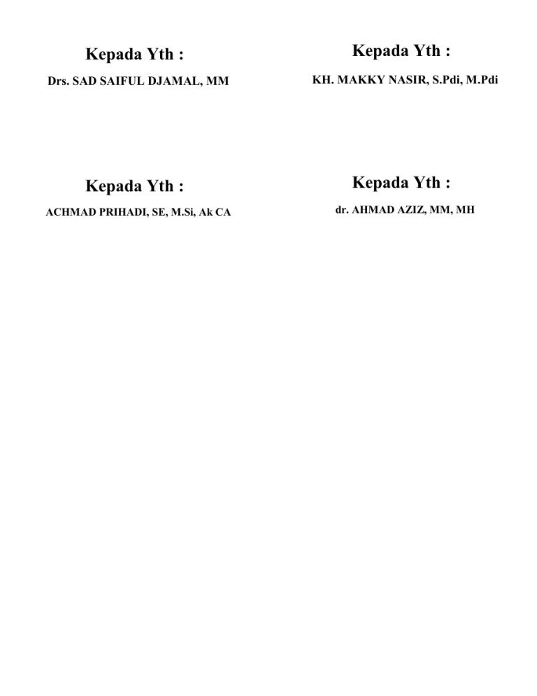 Kepada Yth : Drs. SAD SAIFUL DJAMAL, MM Kepada Yth : ACHMAD PRIHADI, SE, M.Si, Ak CA dr. CATUR BUDI KESWARDIONO, Sp. P Kepada Yth : KH. MAKKY NASIR, S.Pdi, M.Pdi Kepada Yth : dr. AHMAD AZIZ, MM, MH