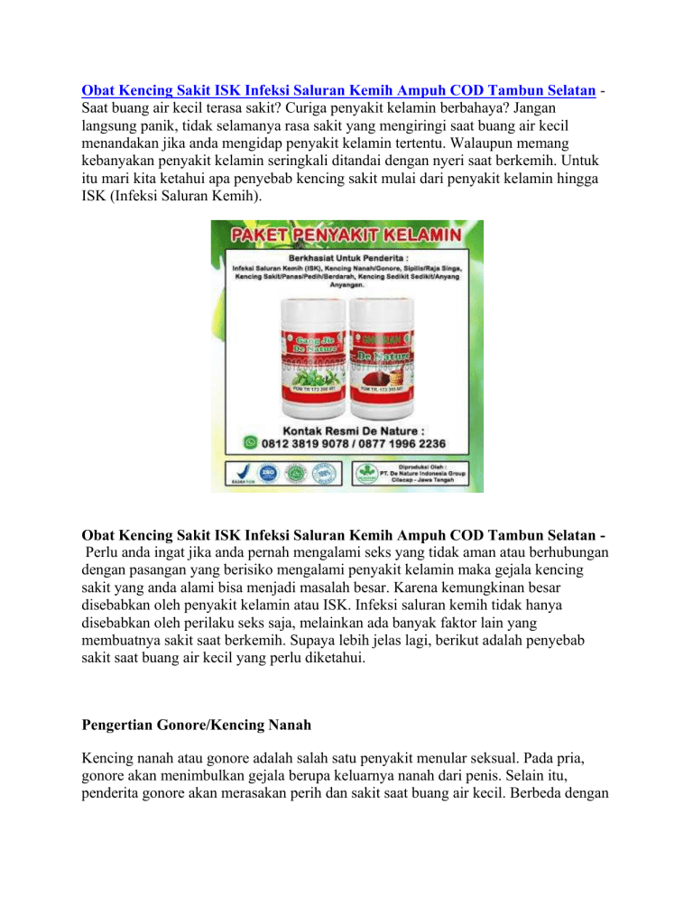Obat Kencing Sakit ISK Infeksi Saluran Kemih Ampuh COD Tambun Selatan Saat buang air kecil terasa sakit? Curiga penyakit kelamin berbahaya? Jangan langsung panik, tidak selamanya rasa sakit yang mengiringi saat buang air kecil menandakan jika anda mengidap penyakit kelamin tertentu. Walaupun memang kebanyakan penyakit kelamin seringkali ditandai dengan nyeri saat berkemih. Untuk itu mari kita ketahui apa penyebab kencing sakit mulai dari penyakit kelamin hingga ISK (Infeksi Saluran Kemih). Obat Kencing Sakit ISK Infeksi Saluran Kemih Ampuh COD Tambun Selatan Perlu anda ingat jika anda pernah mengalami seks yang tidak aman atau berhubungan dengan pasangan yang berisiko mengalami penyakit kelamin maka gejala kencing sakit yang anda alami bisa menjadi masalah besar. Karena kemungkinan besar disebabkan oleh penyakit kelamin atau ISK. Infeksi saluran kemih tidak hanya disebabkan oleh perilaku seks saja, melainkan ada banyak faktor lain yang membuatnya sakit saat berkemih. Supaya lebih jelas lagi, berikut adalah penyebab sakit saat buang air kecil yang perlu diketahui. Pengertian Gonore/Kencing Nanah Kencing nanah atau gonore adalah salah satu penyakit menular seksual. Pada pria, gonore akan menimbulkan gejala berupa keluarnya nanah dari penis. Selain itu, penderita gonore akan merasakan perih dan sakit saat buang air kecil. Berbeda dengan gonore pada pria, jika terjadi pada wanita gonore bisa tidak menimbulkan gejala. Penyakit gonore dapat sembuh dalam beberapa hari, jika diberikan pengobatan yang tepat dan segera. Pada umumnya, penyakit ini ditularkan melalui hubungan seksual. Penyakit ini lebih sering menyerang remaja dan dewasa muda, serta lebih sering terjadi pada pria dibanding wanita. Meski demikian, bayi juga dapat terinfeksi bakter gonococcus atau Neisseria gonorrhoeae. Gejala Gonore/Kencing Nanah Gejala kencing nanah pada pria awalnya muncul rasa gatal dan panas di sekitar uretra (saluran yang menghantarkan urine dari kandung kemih ke luar tubuh). Selanjutnya, timbul rasa nyeri saat buang air kecil dan keluar cairan kental berwarna keruh (nanah) dari ujung uretra. Kadang-kadang bisa disertai darah. Bila infeksi sudah semakin lanjut, nyeri akan semakin buruk dan cairan semakin kental serta keruh. Selain itu, juga akan muncul rasa nyeri saat ereksi. Terkadang bisa disertai pembesaran kelenjar getah bening di selangkangan. Sedangkan gejala kencing nanah pada wanita (kalaupun ada) dapat sangat ringan hingga penderitanya tidak menyadarinya. Sebanyak 30-60% wanita penderita kencing nanah tidak merasakan gejala apapun. Gejala yang mungkin timbul dapat berupa nyeri saat buang air kecil, buang air kecil menjadi lebih sering, dan kadang-kadang menimbulkan rasa nyeri pada panggul bawah. Selain itu, terdapat cairan kental dan keruh yang keluar dari vagina. Komplikasi Gonore/Kencing Nanah Kencing nanah dapat memicu terjadinya komplikasi berupa infertilitas/ kemandulan, baik pada pria maupun wanita. Pada wanita, infeksi kencing nanah yang tidak diobati atau tidak mendapat pengobatan hingga tuntas, dapat menyebar dari serviks (leher rahim) menuju uterus (rahim), tuba falopi (saluran telur), dan ovarium (indung telur) dan menyebabkan penyakit radang panggul. Penyakit tersebut dapat menyebabkan kemandulan maupun komplikasi pada kehamilan dan persalinan. Sementara itu, pada pria, infeksi kencing nanah dapat menyebar melalui saluran kencing (uretra) menuju testis, epididimis, dan merusak proses pembentukan sperma di dalamnya. Selain itu, kencing nanah juga dapat menyerang kelenjar prostat. Bakteri penyebab kencing nanah juga dapat menyebar melalui darah menuju area lain di tubuh, termasuk sendi. Infeksi sistemik ini dapat menyebabkan demam, ruam merah pada kulit, nyeri sendi, dan lain-lain. Pengertian Infeksi Saluran Kemih (ISK) Infeksi saluran kemih (ISK) atau yang biasa disebut infeksi saluran kencing atau urinary tract infection disebabkan oleh bakteri yang berkembang di dalam saluran kencing. Penyakit ini bisa terjadi pada laki-laki maupun perempuan, tapi perempuan memiliki risiko yang lebih besar terkena penyakit ini. Hal ini dikarenakan uretra yang ada di wanita lebih pendek dari pada uretra pada pria, sehingga bakteri lebih mudah memasuki kandung kemih. Bahkan, hampir setengah dari seluruh perempuan pernah mengalami ISK. Selain disebabkan oleh bakteri E.coli, infeksi saluran kemih juga bisa disebabkan oleh penyakit menular seksual seperti klamidia, jamur, dan virus. Gejala penyakit ini biasanya ditandai oleh rasa sakit saat buang air kecil, urin keruh bahkan berdarah, urin berbau tidak sedap, rasa kram di perut bagian bawah, rasa ingin buang air kecil terusterusan, dan demam. Jika ISK dibiarkan berlarut-larut dan tidak segera diobati bisa menimbulkan komplikasi seperti gangguan pada ginjal, sepsis, penyempitan uretra, dan risiko melahirkan secara prematur pada ibu hamil. Walaupun bisa diobati secara medis menggunakan antibiotik, penyakit ini juga bisa diobati dan dicegah menggunakan cara alami. Obat Kencing Sakit ISK Infeksi Saluran Kemih Ampuh COD Tambun Selatan Paket Gang Jie Gho Siah De Nature merupakan produk eksklusif dari De Nature dengan POM. TR : - Gang Jie POM.TR 173 300 491 - Gho Siah POM.TR 173 305 881 KOMPOSISI: Gang Jie : - Orthosiphon stamineus folium 1250mg - Imperatae cylindrica rhozoma 625mg - Andrographis paniculata folium 625mg Gho Siah : - Lumbricus rubellus ekstrak 500mg BAIK DIGUNAKAN UNTUK MEMBANTU : - Mengobati Sipilis/Rajasinga/Gonore/Kencing Nanah/Infeksi Saluran Kemih - Sebagai Antivirus dan Antibakteri - Memperbaiki jaringan sel pada bagian uretric - Memulihkan stamina - Menjaga kesehatan - Mengobati Saluran Kencing Sekedar informasi untuk kenyamanan Konsumen, bahwa Produk dari perusahaan kami ini sudah memiliki: - Ijin Resmi Perusahaan dari Kementerian Kesehatan - Ijin BPOM, yang artinya sudah lulus uji stabilitas Produk - Sertifikat Halal MUI, sehingga kehalalannya bisa dipertanggungjawabkan - Apoteker Yang berpengalaman - Sudah melewati Proses Sortir Bahan Baku, Gu