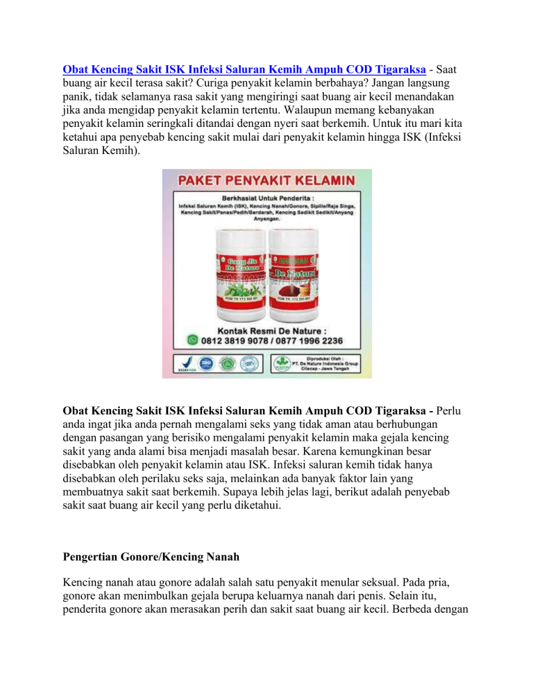 Obat Kencing Sakit ISK Infeksi Saluran Kemih Ampuh COD Tigaraksa - Saat buang air kecil terasa sakit? Curiga penyakit kelamin berbahaya? Jangan langsung panik, tidak selamanya rasa sakit yang mengiringi saat buang air kecil menandakan jika anda mengidap penyakit kelamin tertentu. Walaupun memang kebanyakan penyakit kelamin seringkali ditandai dengan nyeri saat berkemih. Untuk itu mari kita ketahui apa penyebab kencing sakit mulai dari penyakit kelamin hingga ISK (Infeksi Saluran Kemih). Obat Kencing Sakit ISK Infeksi Saluran Kemih Ampuh COD Tigaraksa - Perlu anda ingat jika anda pernah mengalami seks yang tidak aman atau berhubungan dengan pasangan yang berisiko mengalami penyakit kelamin maka gejala kencing sakit yang anda alami bisa menjadi masalah besar. Karena kemungkinan besar disebabkan oleh penyakit kelamin atau ISK. Infeksi saluran kemih tidak hanya disebabkan oleh perilaku seks saja, melainkan ada banyak faktor lain yang membuatnya sakit saat berkemih. Supaya lebih jelas lagi, berikut adalah penyebab sakit saat buang air kecil yang perlu diketahui. Pengertian Gonore/Kencing Nanah Kencing nanah atau gonore adalah salah satu penyakit menular seksual. Pada pria, gonore akan menimbulkan gejala berupa keluarnya nanah dari penis. Selain itu, penderita gonore akan merasakan perih dan sakit saat buang air kecil. Berbeda dengan gonore pada pria, jika terjadi pada wanita gonore bisa tidak menimbulkan gejala. Penyakit gonore dapat sembuh dalam beberapa hari, jika diberikan pengobatan yang tepat dan segera. Pada umumnya, penyakit ini ditularkan melalui hubungan seksual. Penyakit ini lebih sering menyerang remaja dan dewasa muda, serta lebih sering terjadi pada pria dibanding wanita. Meski demikian, bayi juga dapat terinfeksi bakter gonococcus atau Neisseria gonorrhoeae. Gejala Gonore/Kencing Nanah Gejala kencing nanah pada pria awalnya muncul rasa gatal dan panas di sekitar uretra (saluran yang menghantarkan urine dari kandung kemih ke luar tubuh). Selanjutnya, timbul rasa nyeri saat buang air kecil dan keluar cairan kental berwarna keruh (nanah) dari ujung uretra. Kadang-kadang bisa disertai darah. Bila infeksi sudah semakin lanjut, nyeri akan semakin buruk dan cairan semakin kental serta keruh. Selain itu, juga akan muncul rasa nyeri saat ereksi. Terkadang bisa disertai pembesaran kelenjar getah bening di selangkangan. Sedangkan gejala kencing nanah pada wanita (kalaupun ada) dapat sangat ringan hingga penderitanya tidak menyadarinya. Sebanyak 30-60% wanita penderita kencing nanah tidak merasakan gejala apapun. Gejala yang mungkin timbul dapat berupa nyeri saat buang air kecil, buang air kecil menjadi lebih sering, dan kadang-kadang menimbulkan rasa nyeri pada panggul bawah. Selain itu, terdapat cairan kental dan keruh yang keluar dari vagina. Komplikasi Gonore/Kencing Nanah Kencing nanah dapat memicu terjadinya komplikasi berupa infertilitas/ kemandulan, baik pada pria maupun wanita. Pada wanita, infeksi kencing nanah yang tidak diobati atau tidak mendapat pengobatan hingga tuntas, dapat menyebar dari serviks (leher rahim) menuju uterus (rahim), tuba falopi (saluran telur), dan ovarium (indung telur) dan menyebabkan penyakit radang panggul. Penyakit tersebut dapat menyebabkan kemandulan maupun komplikasi pada kehamilan dan persalinan. Sementara itu, pada pria, infeksi kencing nanah dapat menyebar melalui saluran kencing (uretra) menuju testis, epididimis, dan merusak proses pembentukan sperma di dalamnya. Selain itu, kencing nanah juga dapat menyerang kelenjar prostat. Bakteri penyebab kencing nanah juga dapat menyebar melalui darah menuju area lain di tubuh, termasuk sendi. Infeksi sistemik ini dapat menyebabkan demam, ruam merah pada kulit, nyeri sendi, dan lain-lain. Pengertian Infeksi Saluran Kemih (ISK) Infeksi saluran kemih (ISK) atau yang biasa disebut infeksi saluran kencing atau urinary tract infection disebabkan oleh bakteri yang berkembang di dalam saluran kencing. Penyakit ini bisa terjadi pada laki-laki maupun perempuan, tapi perempuan memiliki risiko yang lebih besar terkena penyakit ini. Hal ini dikarenakan uretra yang ada di wanita lebih pendek dari pada uretra pada pria, sehingga bakteri lebih mudah memasuki kandung kemih. Bahkan, hampir setengah dari seluruh perempuan pernah mengalami ISK. Selain disebabkan oleh bakteri E.coli, infeksi saluran kemih juga bisa disebabkan oleh penyakit menular seksual seperti klamidia, jamur, dan virus. Gejala penyakit ini biasanya ditandai oleh rasa sakit saat buang air kecil, urin keruh bahkan berdarah, urin berbau tidak sedap, rasa kram di perut bagian bawah, rasa ingin buang air kecil terusterusan, dan demam. Jika ISK dibiarkan berlarut-larut dan tidak segera diobati bisa menimbulkan komplikasi seperti gangguan pada ginjal, sepsis, penyempitan uretra, dan risiko melahirkan secara prematur pada ibu hamil. Walaupun bisa diobati secara medis menggunakan antibiotik, penyakit ini juga bisa diobati dan dicegah menggunakan cara alami. Obat Kencing Sakit ISK Infeksi Saluran Kemih Ampuh COD Tigaraksa Paket Gang Jie Gho Siah De Nature merupakan produk eksklusif dari De Nature dengan POM. TR : - Gang Jie POM.TR 173 300 491 - Gho Siah POM.TR 173 305 881 KOMPOSISI: Gang Jie : - Orthosiphon stamineus folium 1250mg - Imperatae cylindrica rhozoma 625mg - Andrographis paniculata folium 625mg Gho Siah : - Lumbricus rubellus ekstrak 500mg BAIK DIGUNAKAN UNTUK MEMBANTU : - Mengobati Sipilis/Rajasinga/Gonore/Kencing Nanah/Infeksi Saluran Kemih - Sebagai Antivirus dan Antibakteri - Memperbaiki jaringan sel pada bagian uretric - Memulihkan stamina - Menjaga kesehatan - Mengobati Saluran Kencing Sekedar informasi untuk kenyamanan Konsumen, bahwa Produk dari perusahaan kami ini sudah memiliki: - Ijin Resmi Perusahaan dari Kementerian Kesehatan - Ijin BPOM, yang artinya sudah lulus uji stabilitas Produk - Sertifikat Halal MUI, sehingga kehalalannya bisa dipertanggungjawabkan - Apoteker Yang berpengalaman - Sudah melewati Proses Sortir Bahan Baku, Guna Menjaga 