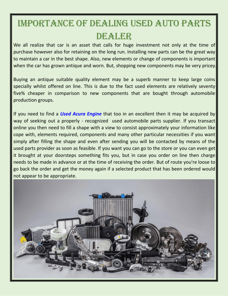 Importance of DealIng UseD aUto parts Dealer We all realize that car is an asset that calls for huge investment not only at the time of purchase however also for retaining on the long run. Installing new parts can be the great way to maintain a car in the best shape. Also, new elements or change of components is important when the car has grown antique and worn. But, shopping new components may be very pricey. Buying an antique suitable quality element may be a superb manner to keep large coins specially whilst offered on line. This is due to the fact used elements are relatively seventy five% cheaper in comparison to new components that are bought through automobile production groups. If you need to find a Used Acura Engine that too in an excellent then it may be acquired by way of seeking out a properly - recognized used automobile parts supplier. If you transact online you then need to fill a shape with a view to consist approximately your information like cope with, elements required, components and many other particular necessities if you want simply after filling the shape and even after sending you will be contacted by means of the used parts provider as soon as feasible. If you want you can go to the store or you can even get it brought at your doorsteps something fits you, but in case you order on line then charge needs to be made in advance or at the time of receiving the order. But of route you're loose to go back the order and get the money again if a selected product that has been ordered would not appear to be appropriate. It is critical to examine the re - e book coverage of a used vehicle parts dealer before carrying out the transaction, especially while carried out online. Thus, it is able to be a wise choice due to the lot of useful facilities that are furnished through the concerned used components dealer. used automobile components supplier is the excellent character who let you to discover that wished vehicle part at that most reasonable costs. Another desirable tip is calling your friends and relatives. The ones who have sold elements earlier than would be the high-quality human beings to take a recommendation from. They could be able to propose you true businesses. Also they will be capable of quick you approximately the issues and the scams that a selected firm need to had been worried with. The bad remarks will truly assist you're taking a sensible decision. You will keep yourself from buying auto components from some shady firm.