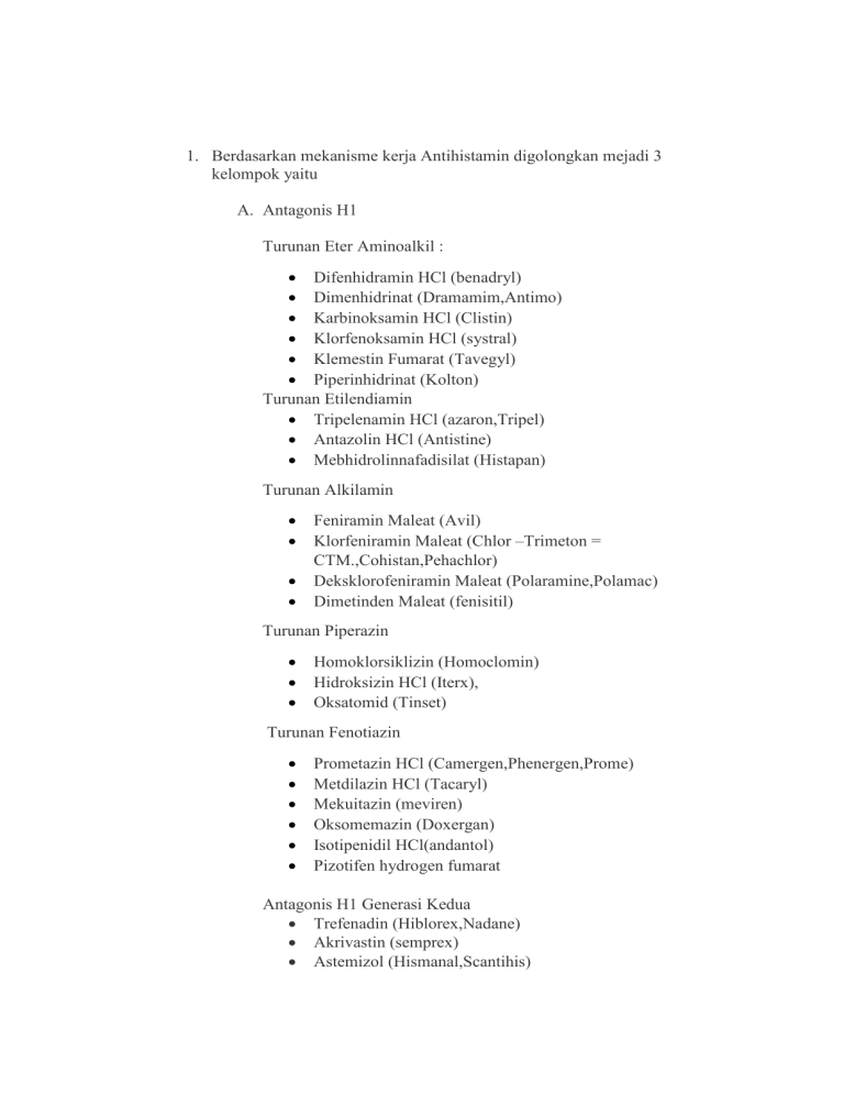 1. Berdasarkan mekanisme kerja Antihistamin digolongkan mejadi 3 kelompok yaitu A. Antagonis H1 Turunan Eter Aminoalkil : Difenhidramin HCl (benadryl) Dimenhidrinat (Dramamim,Antimo) Karbinoksamin HCl (Clistin) Klorfenoksamin HCl (systral) Klemestin Fumarat (Tavegyl) Piperinhidrinat (Kolton) Turunan Etilendiamin Tripelenamin HCl (azaron,Tripel) Antazolin HCl (Antistine) Mebhidrolinnafadisilat (Histapan) Turunan Alkilamin Feniramin Maleat (Avil) Klorfeniramin Maleat (Chlor –Trimeton = CTM.,Cohistan,Pehachlor) Deksklorofeniramin Maleat (Polaramine,Polamac) Dimetinden Maleat (fenisitil) Turunan Piperazin Homoklorsiklizin (Homoclomin) Hidroksizin HCl (Iterx), Oksatomid (Tinset) Turunan Fenotiazin Prometazin HCl (Camergen,Phenergen,Prome) Metdilazin HCl (Tacaryl) Mekuitazin (meviren) Oksomemazin (Doxergan) Isotipenidil HCl(andantol) Pizotifen hydrogen fumarat Antagonis H1 Generasi Kedua Trefenadin (Hiblorex,Nadane) Akrivastin (semprex) Astemizol (Hismanal,Scantihis) Loratadin (Claritin) cetirizin B. Antagonis H2 Semitidin (Cimet,Corsamet,Nulcer,Tagamet,Ulcadine) Ranitidin HCl (Ranin,Ranatin,Ranatac,Zantac,Zantadin) Famotidin ( Facid,Famocid,Gaster,Ragastin,Restidin) 2. Contoh hubungan struktur Hubungan Struktur dan Aktivitas antihistamin antagonis H1 : Kuartenerisasi dari nitrogen rantai samping tidak selalu menghasilkan senyawa yang kurang efektif.