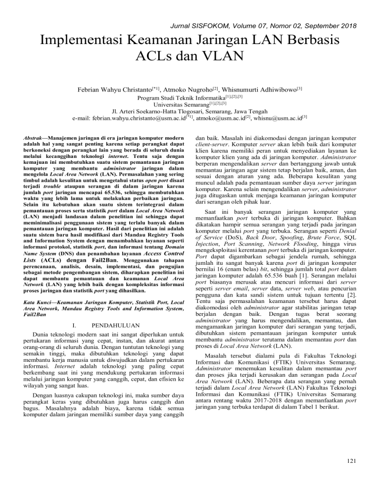 Jurnal SISFOKOM, Volume 07, Nomor 02, September 2018 Implementasi Keamanan Jaringan LAN Berbasis ACLs dan VLAN Febrian Wahyu Christanto[*1], Atmoko Nugroho[2], Whisnumurti Adhiwibowo[3] Program Studi Teknik Informatika[1],[2],[3] Universitas Semarang[1],[2],[3] Jl. Arteri Soekarno-Hatta Tlogosari, Semarang, Jawa Tengah e-mail: [email protected][*1], [email protected][2], [email protected][3] Abstrak—Manajemen jaringan di era jaringan komputer modern adalah hal yang sangat penting karena setiap perangkat dapat berkoneksi dengan perangkat lain yang berada di seluruh dunia melalui kecanggihan teknologi internet. Tentu saja dengan kemajuan ini membutuhkan suatu sistem pemantauan jaringan komputer yang membantu administrator jaringan dalam mengelola Local Area Network (LAN). Permasalahan yang sering timbul adalah kesulitan untuk mengetahui status open port disaat terjadi trouble ataupun serangan di dalam jaringan karena jumlah port jaringan mencapai 65.536, sehingga membutuhkan waktu yang lebih lama untuk melakukan perbaikan jaringan. Selain itu kebutuhan akan suatu sistem terintegrasi dalam pemantauan proses serta statistik port dalam Local Area Network (LAN) menjadi landasan dalam penelitian ini sehingga dapat meminimalisasi penggunaan sistem yang terlalu banyak dalam pemantauan jaringan komputer. Hasil dari penelitian ini adalah suatu sistem baru hasil modifikasi dari Mandau Registry Tools and Information System dengan menambahkan layanan seperti informasi protokol, statistik port, dan informasi tentang Domain Name System (DNS) dan penambahan layanan Access Control Lists (ACLs) dengan Fail2Ban. Menggunakan tahapan perencanaan, analisis, desain, implementasi, dan pengujian sebagai metode pengembangan sistem, diharapkan penelitian ini dapat membantu pemantauan dan keamanan Local Area Network (LAN) yang lebih baik dengan kompleksitas informasi proses jaringan dan statistik port yang dihasilkan. Kata Kunci—Keamanan Jaringan Komputer, Statistik Port, Local Area Network, Mandau Registry Tools and Information System, Fail2Ban I. PENDAHULUAN Dunia teknologi modern saat ini sangat diperlukan untuk pertukaran informasi yang cepat, instan, dan akurat antara orang-orang di seluruh dunia. Dengan tuntutan teknologi yang semakin tinggi, maka dibutuhkan teknologi yang dapat membantu kerja manusia untuk diwujudkan dalam pertukaran informasi. Internet adalah teknologi yang paling cepat berkembang saat ini yang mendukung pertukaran informasi melalui jaringan komputer yang canggih, cepat, dan efisien ke wilayah yang sangat luas. Dengan luasnya cakupan teknologi ini, maka sumber daya perangkat keras yang dibutuhkan juga harus canggih dan bagus. Masalahnya adalah biaya, karena tidak semua komputer dalam jaringan memiliki sumber daya yang canggih dan baik. Masalah ini diakomodasi dengan jaringan komputer client-server. Komputer server akan lebih baik dari komputer klien karena memiliki peran untuk menyediakan layanan ke komputer klien yang ada di jaringan komputer. Administrator berperan mengendalikan server dan bertanggung jawab untuk memantau jaringan agar sistem tetap berjalan baik, aman, dan sesuai dengan aturan yang ada. Beberapa kesulitan yang muncul adalah pada pemantauan sumber daya server jaringan komputer. Karena selain mengendalikan server, administrator juga ditugaskan untuk menjaga keamanan jaringan komputer dari serangan oleh pihak luar. Saat ini banyak serangan jaringan komputer yang memanfaatkan port terbuka di jaringan komputer. Bahkan dikatakan hampir semua serangan yang terjadi pada jaringan komputer melalui port yang terbuka. Serangan seperti Denial of Service (DoS), Back Door, Spoofing, Brute Force, SQL Injection, Port Scanning, Network Flooding, hingga virus mengeksploitasi kerentanan port terbuka di jaringan komputer. Port dapat digambarkan sebagai jendela rumah, sehingga jumlah itu sangat banyak karena port di jaringan komputer bernilai 16 (enam belas) bit, sehingga jumlah total port dalam jaringan komputer adalah 65.536 buah [1]. Serangan melalui port biasanya merusak atau mencuri informasi dari server seperti server email, server data, server web, atau pencurian pengguna dan kata sandi sistem untuk tujuan tertentu [2]. Tentu saja permasalahan keamanan tersebut harus dapat diakomodasi oleh administrator agar stabilitas jaringan tetap berjalan dengan baik. Dengan tugas berat seorang administrator yang harus mengendalikan, memantau, dan mengamankan jaringan komputer dari serangan yang terjadi, dibutuhkan sistem pemantauan jaringan komputer untuk membantu administrator terutama dalam memantau port dan proses di Local Area Network (LAN). Masalah tersebut dialami pula di Fakultas Teknologi Informasi dan Komunikasi (FTIK) Universitas Semarang. Administrator menemukan kesulitan dalam memantau port dan proses jika terjadi kerusakan dan serangan pada Local Area Network (LAN). Beberapa data serangan yang pernah terjadi dalam Local Area Network (LAN) Fakultas Teknologi Informasi dan Komunikasi (FTIK) Universitas Semarang antara rentang waktu 2017-2018 dengan memanfaatkan port jaringan yang terbuka terdapat di dalam Tabel 1 berikut. 121 Jurnal SISFOKOM, Volume 07, Nomor 02, September 2018 TABLE I. DATA SERANGAN DI LAN FTIK UNIVERSITAS SEMARANG Jenis Serangan Port yang Digunakan Permasalahan yang Ditimbulkan Sniffing user dan password jaringan wifi internet 53 Koneksi internet terutama untuk user “dosen” menjadi lebih lambat Netcut 137 Drop internet Bypass proxy 3128 Situs-situs yang dilarang dapat dibuka koneksi Brute force telnet 23 Mencoba masuk ke root ftik.usm.ac.id, CPU load server meningkat Brute force SSH 22 Mencoba masuk ke root ftik.usm.ac.id, CPU load server meningkat DDOS 80 CPU load server meningkat, traffic bandwidth meningkat, ftik.usm.ac.id down Virus 54320, 54321, 12345 XAMPP disembunyikan virus, muncul pop-up iklan di web ftik.usm.ac.id Untuk menangani permasalahan yang terjadi pada Tabel 1, maka administrator menggunakan banyak perangkat lunak untuk memantau proses di dalam