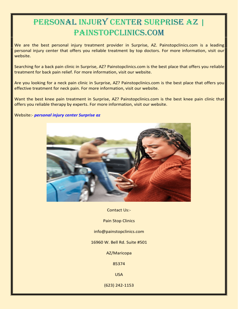 We are the best personal injury treatment provider in Surprise, AZ. Painstopclinics.com is a leading personal injury center that offers you reliable treatment by top doctors. For more information, visit our website. Searching for a back pain clinic in Surprise, AZ? Painstopclinics.com is the best place that offers you reliable treatment for back pain relief. For more information, visit our website. Are you looking for a neck pain clinic in Surprise, AZ? Painstopclinics.com is the best place that offers you effective treatment for neck pain. For more information, visit our website. Want the best knee pain treatment in Surprise, AZ? Painstopclinics.com is the best knee pain clinic that offers you reliable therapy by experts. For more information, visit our website. Website:- personal injury center Surprise az Contact Us:Pain Stop Clinics [email protected] 16960 W. Bell Rd. Suite #501 AZ/Maricopa 85374 USA (623) 242-1153