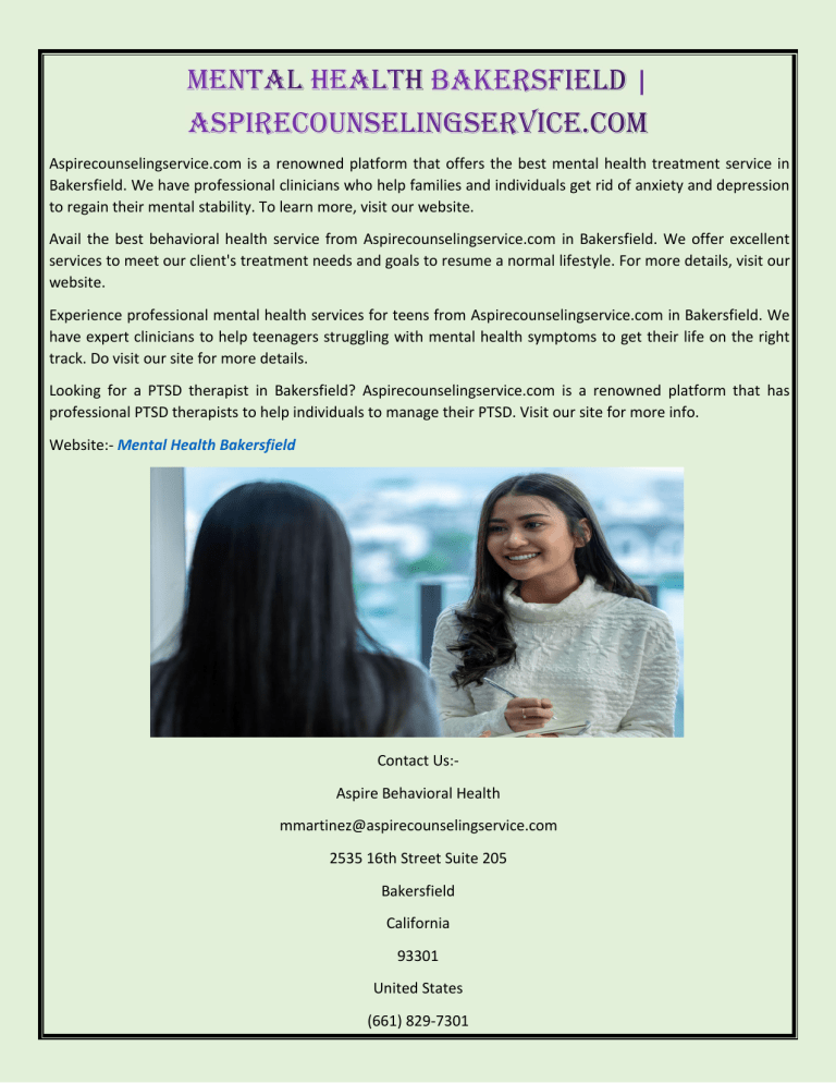 Aspirecounselingservice.com is a renowned platform that offers the best mental health treatment service in Bakersfield. We have professional clinicians who help families and individuals get rid of anxiety and depression to regain their mental stability. To learn more, visit our website. Avail the best behavioral health service from Aspirecounselingservice.com in Bakersfield. We offer excellent services to meet our client's treatment needs and goals to resume a normal lifestyle. For more details, visit our website. Experience professional mental health services for teens from Aspirecounselingservice.com in Bakersfield. We have expert clinicians to help teenagers struggling with mental health symptoms to get their life on the right track. Do visit our site for more details. Looking for a PTSD therapist in Bakersfield? Aspirecounselingservice.com is a renowned platform that has professional PTSD therapists to help individuals to manage their PTSD. Visit our site for more info. Website:- Mental Health Bakersfield Contact Us:Aspire Behavioral Health [email protected] 2535 16th Street Suite 205 Bakersfield California 93301 United States (661) 829-7301